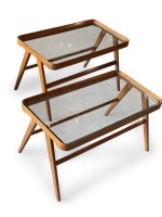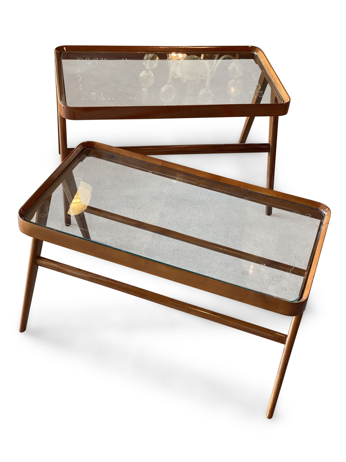 Style: Mid-Century Materials & Techniques: Glass, cherrywood Category: Tables Condition: Smaller table is: 32.5W x 18D x 17.5H