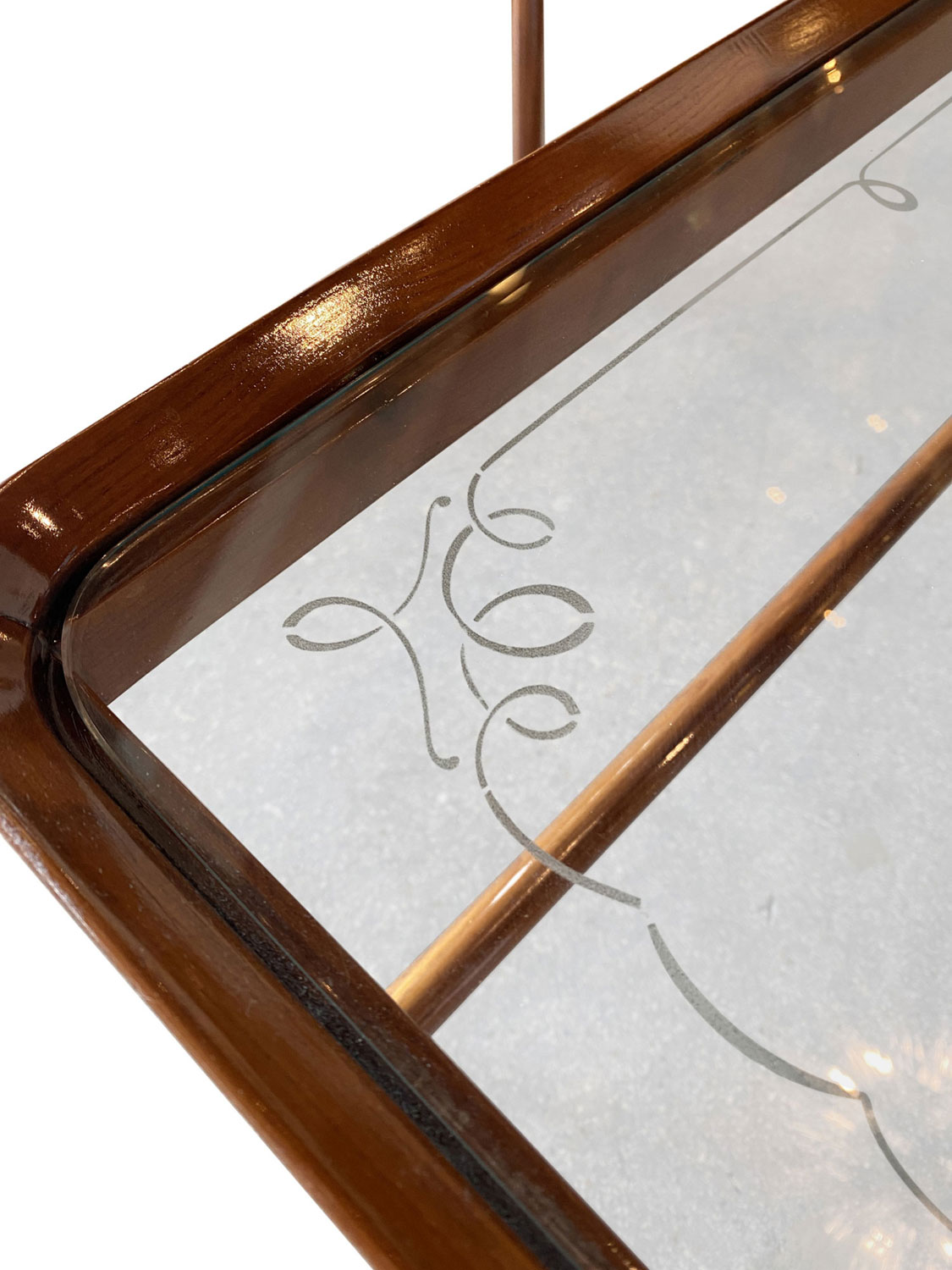 PAIR of similar Italian Mid-Century cherrywood low end tables with an intricately etched glass top resting on V shaped tapered legs connected by a stretcher (PRICED AS PAIR) (CARLO DE CARLI)
