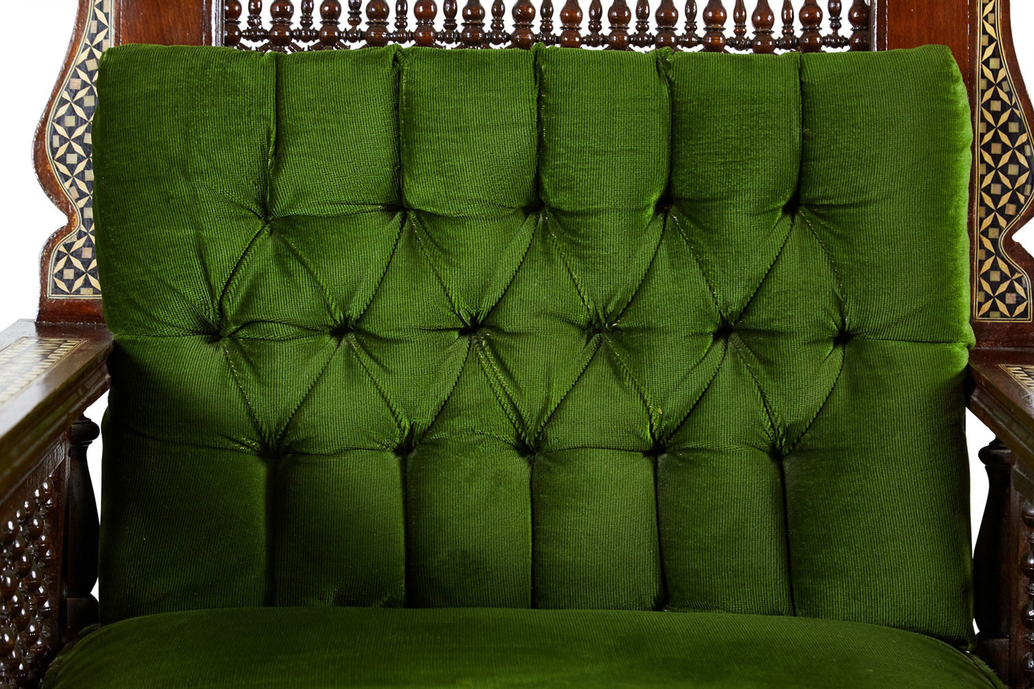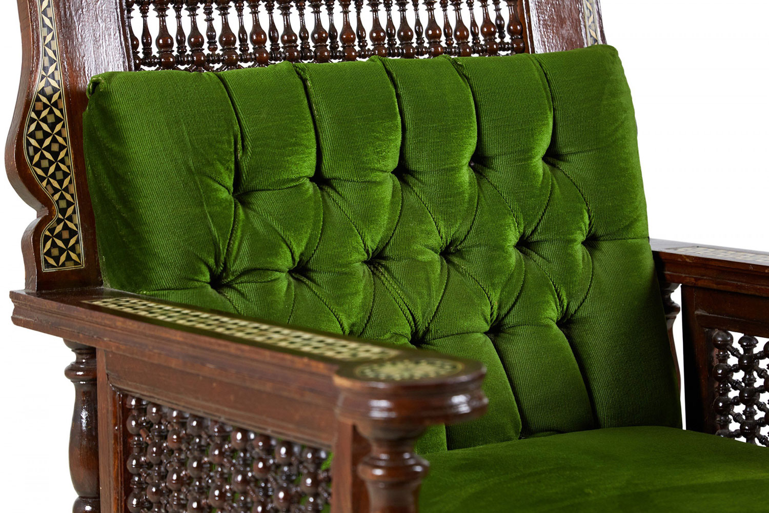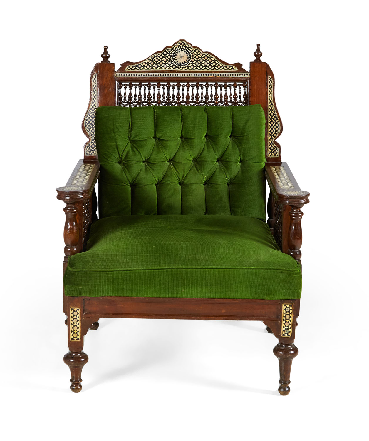 PAIR of Middle Eastern Syrian-style (20th Century) armchairs in walnut with inlaid mother of pearl and ebony marquetry having emerald green tufted upholstery, with spindle and finial details (PRICED AS PAIR)