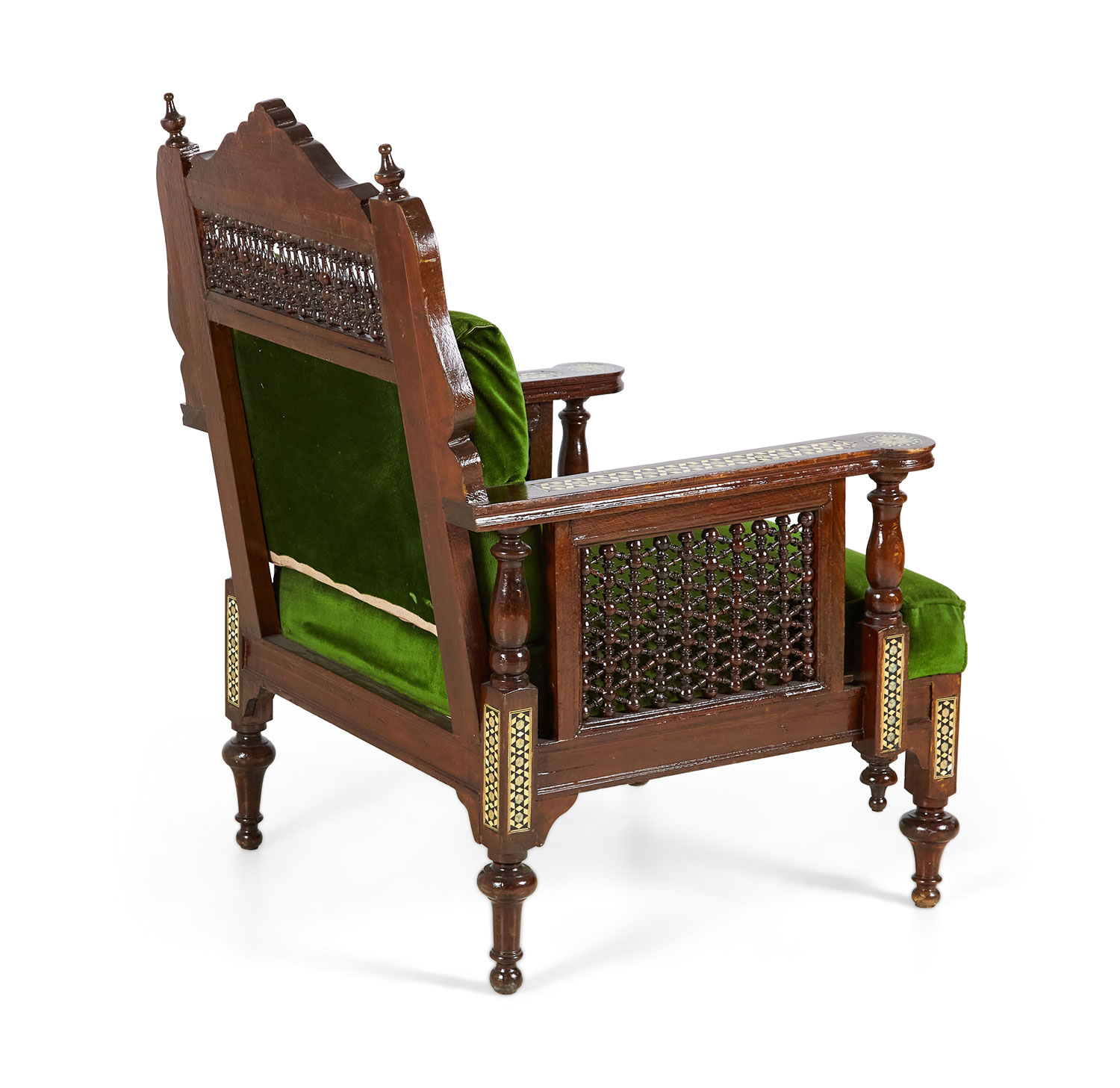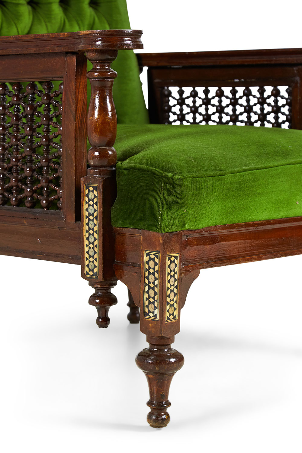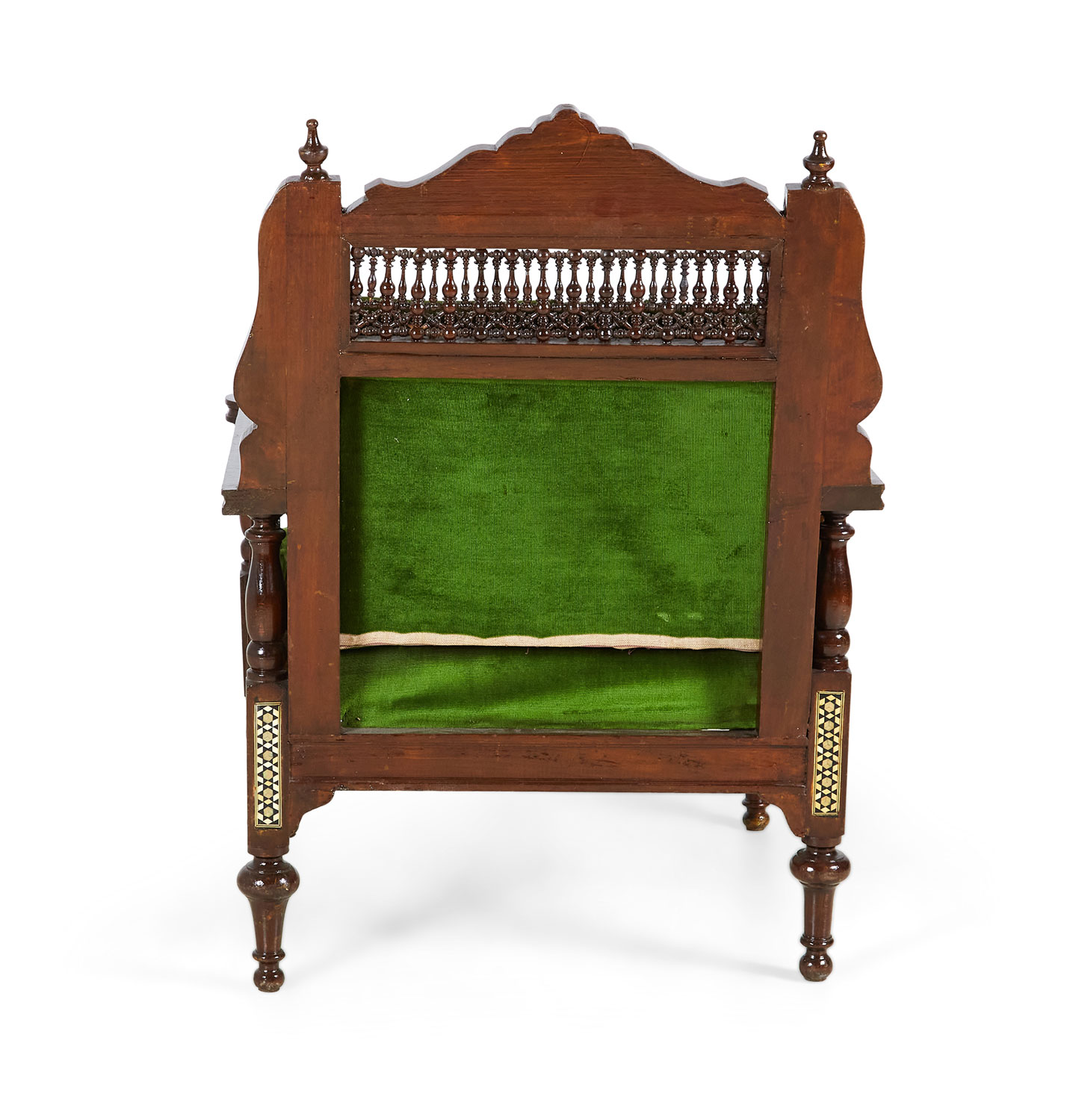 PAIR of Middle Eastern Syrian-style (20th Century) armchairs in walnut with inlaid mother of pearl and ebony marquetry having emerald green tufted upholstery, with spindle and finial details (PRICED AS PAIR)