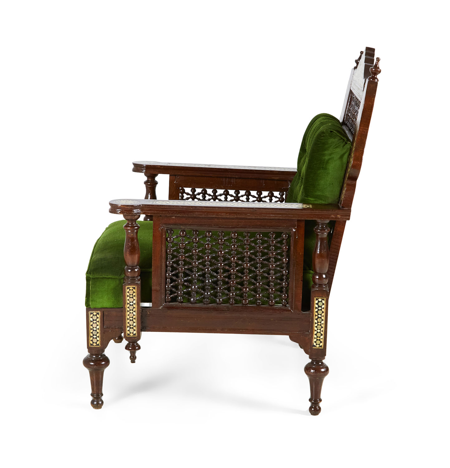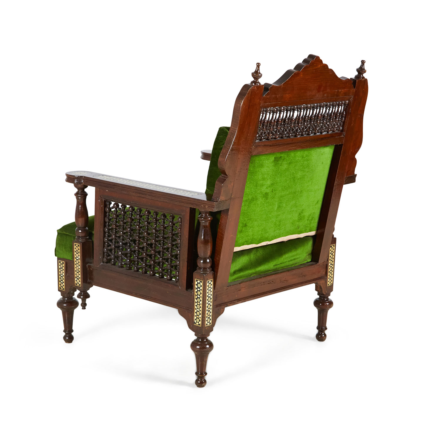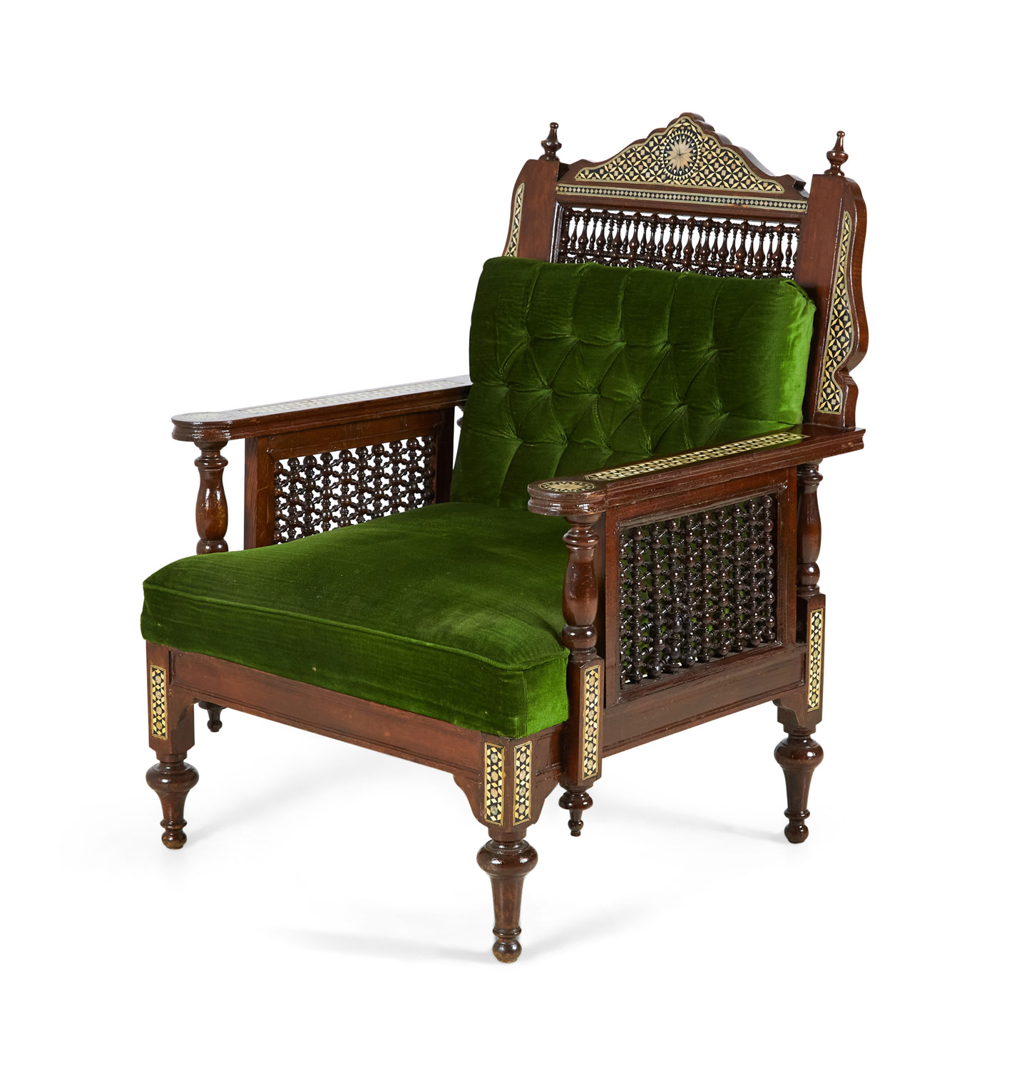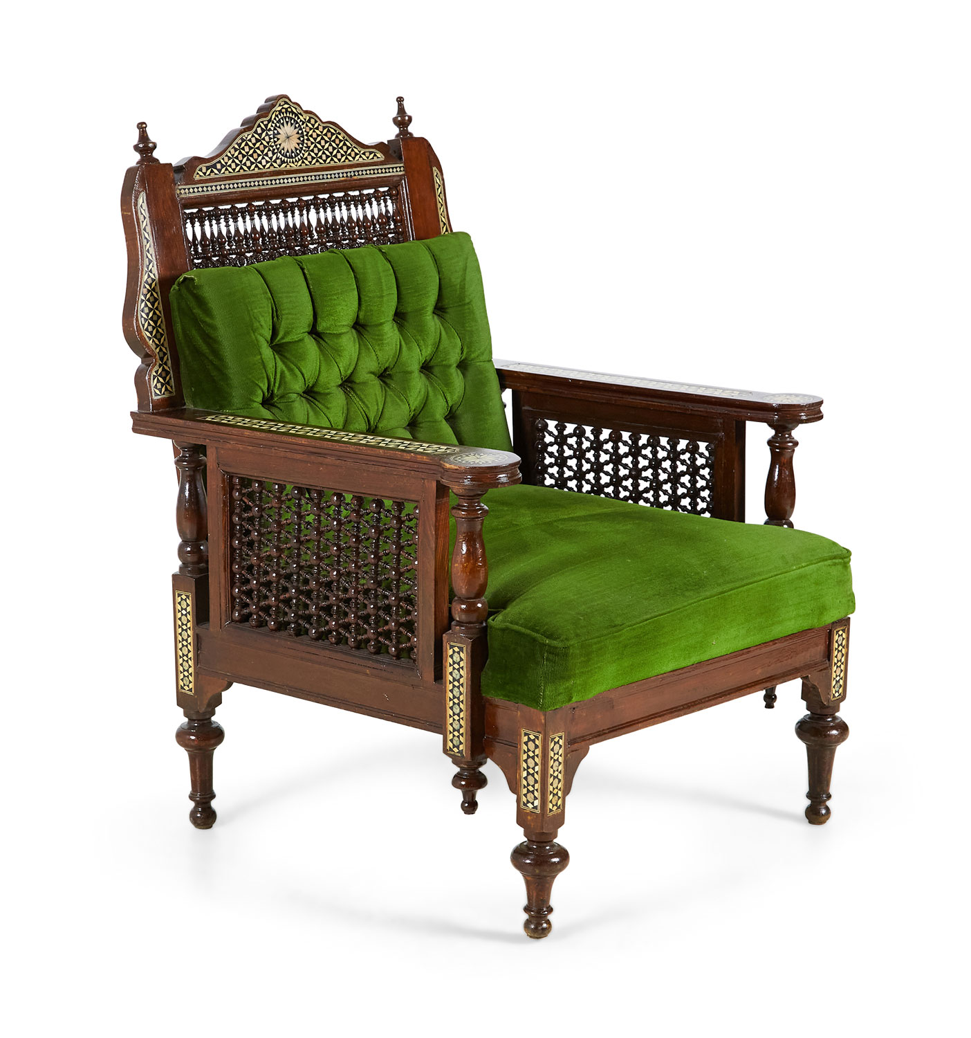 PAIR of Middle Eastern Syrian-style (20th Century) armchairs in walnut with inlaid mother of pearl and ebony marquetry having emerald green tufted upholstery, with spindle and finial details (PRICED AS PAIR).