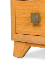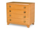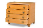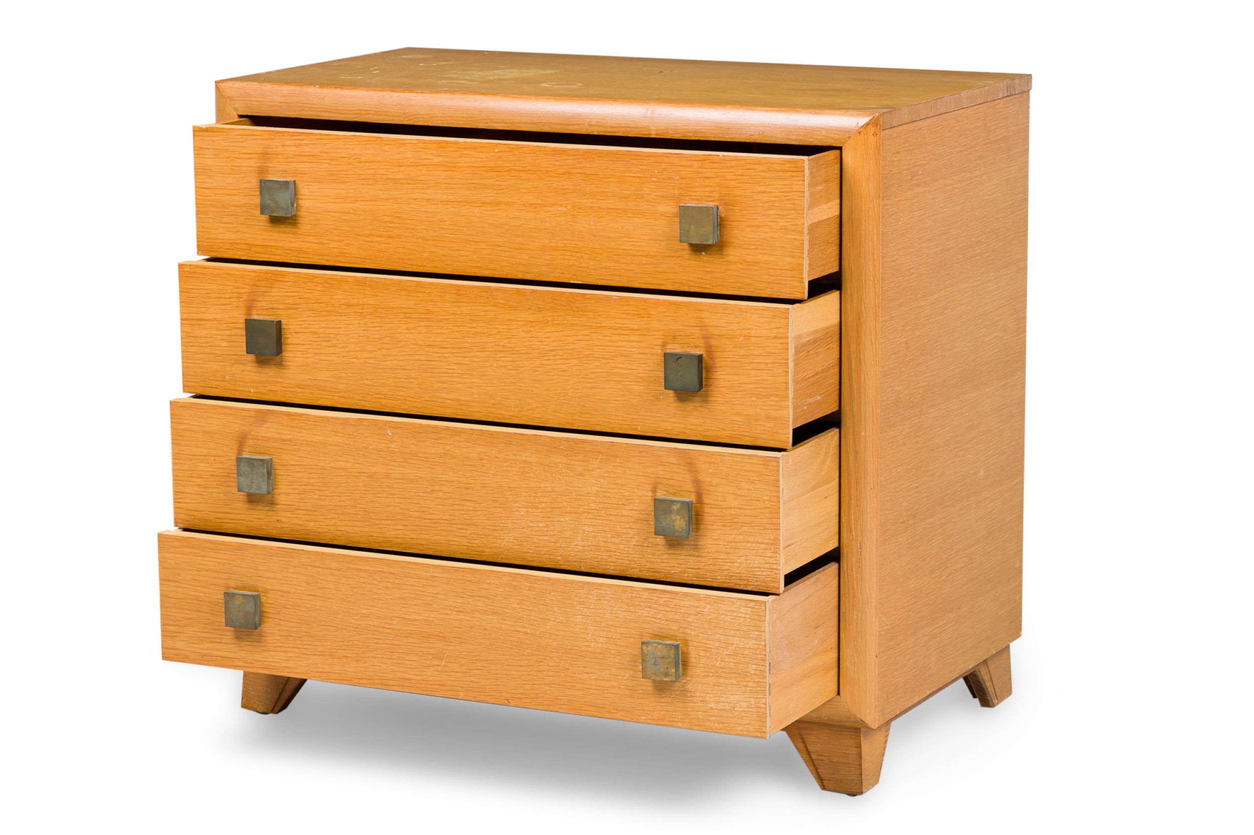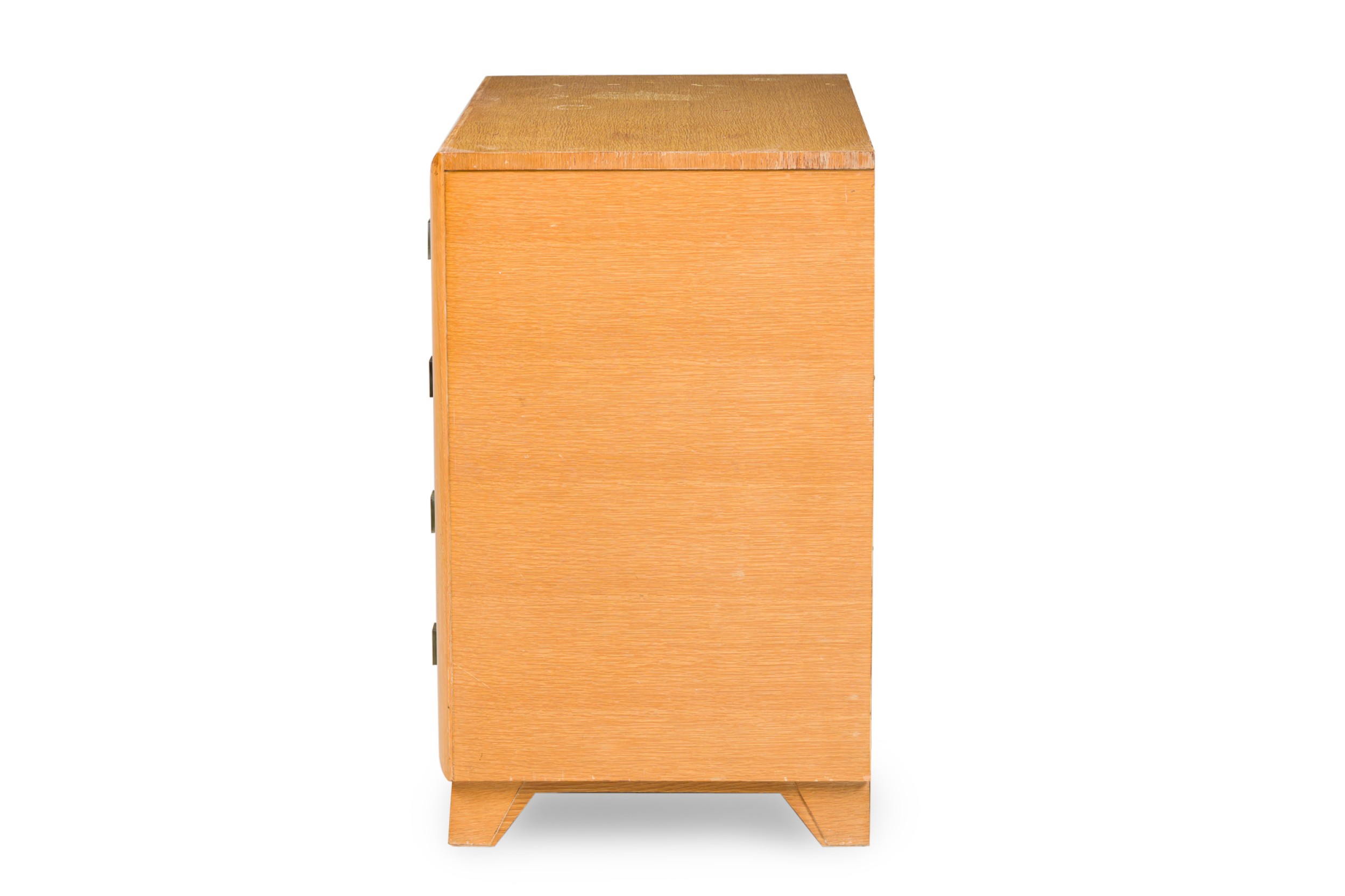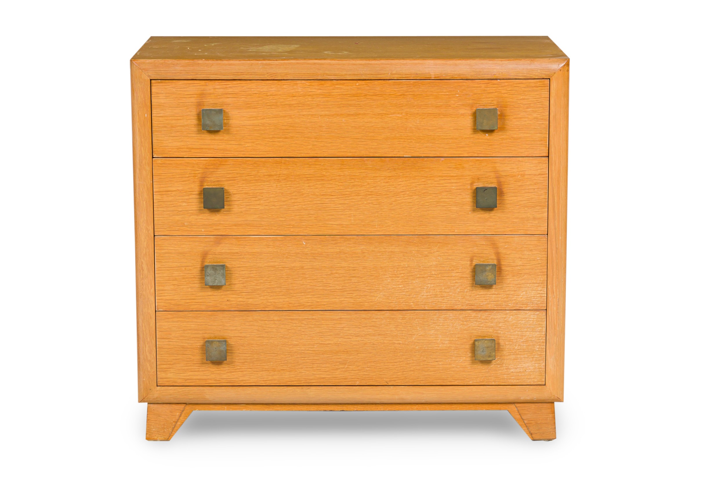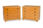 PAIR of Mid-Century American Modern bleached walnut chests with four drawers, each with two square patinated brass drawer pulls, resting on taped triangular legs. (T.H. ROBSJOHN-GIBBINGS) (PRICED AS PAIR)