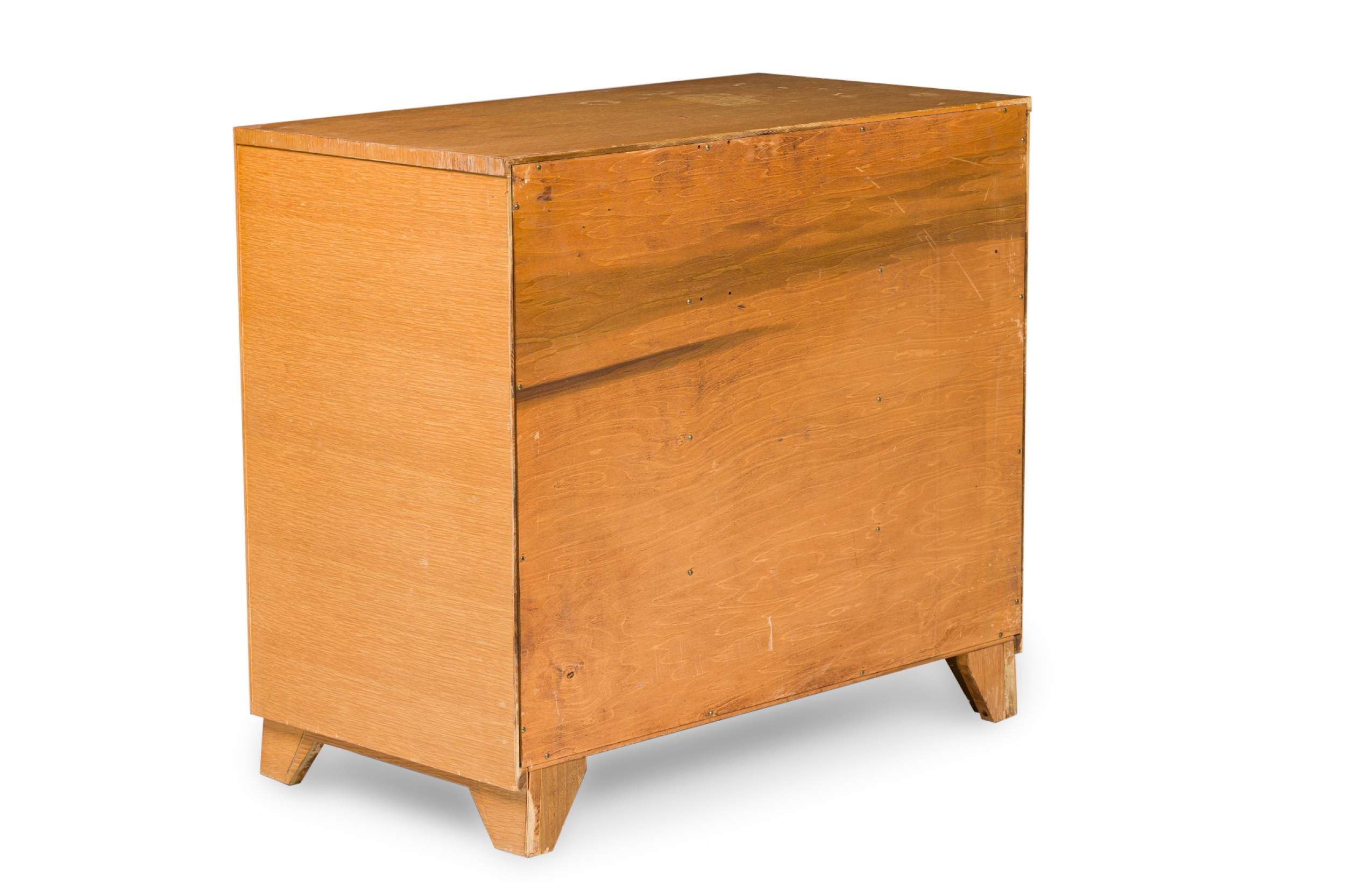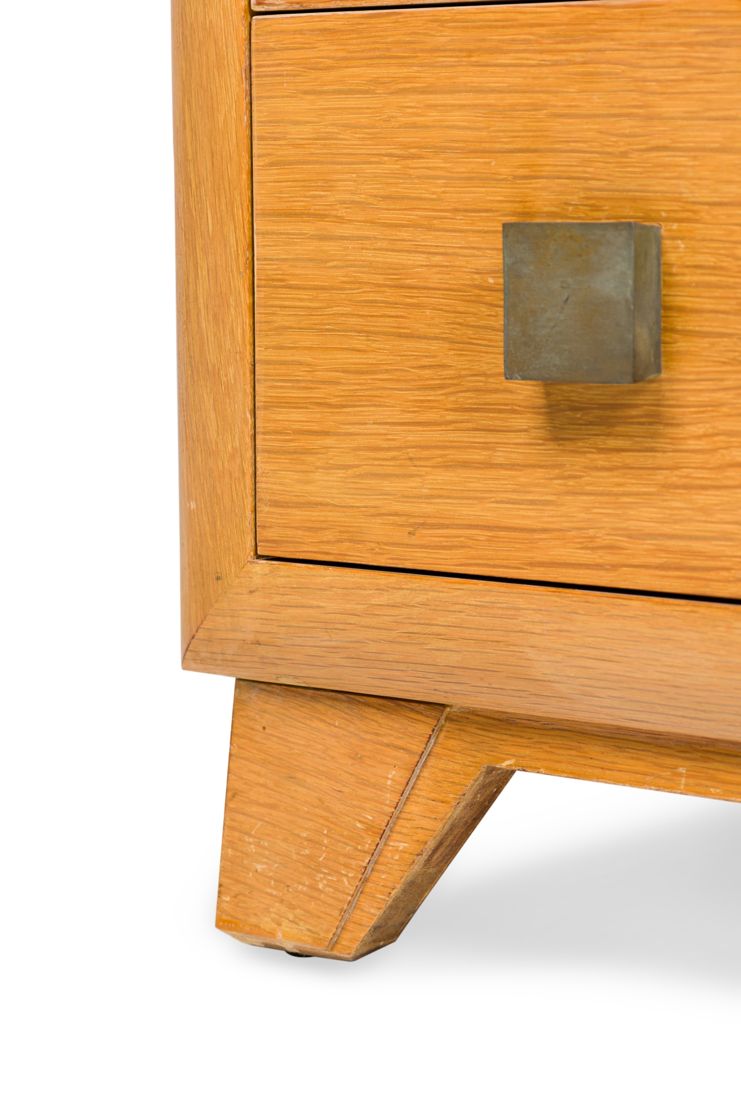 PAIR of Mid-Century American Modern bleached walnut chests with four drawers, each with two square patinated brass drawer pulls, resting on taped triangular legs. (T.H. ROBSJOHN-GIBBINGS) (PRICED AS PAIR).