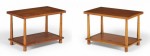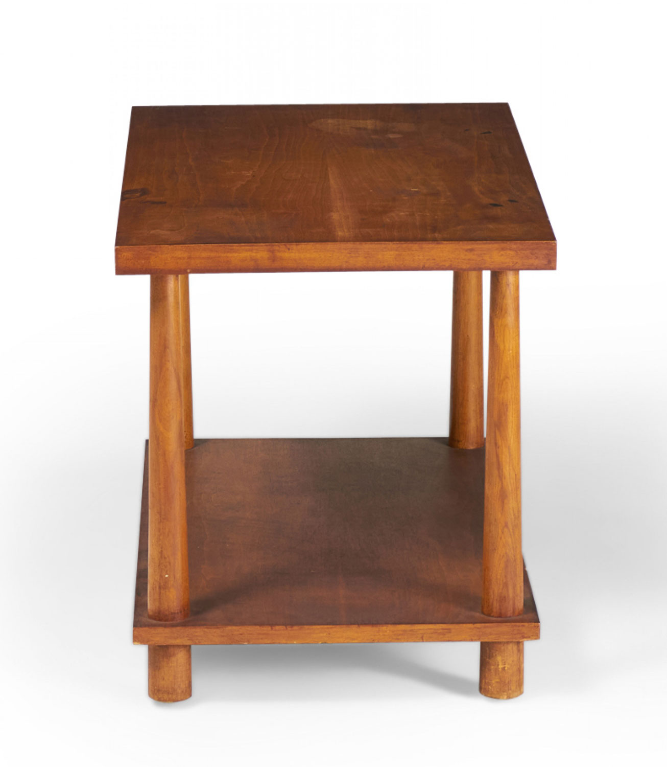 PAIR of American Mid-Century maple end / side tables with a rectangular two-tiered form with reverse tapered dowel legs connecting the lower shelf and tabletop. (T.H. ROBSJOHN-GIBBINGS FOR WIDDICOMB)(PRICED AS PAIR)(Similar tables: DUF0152E).