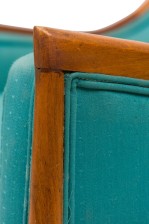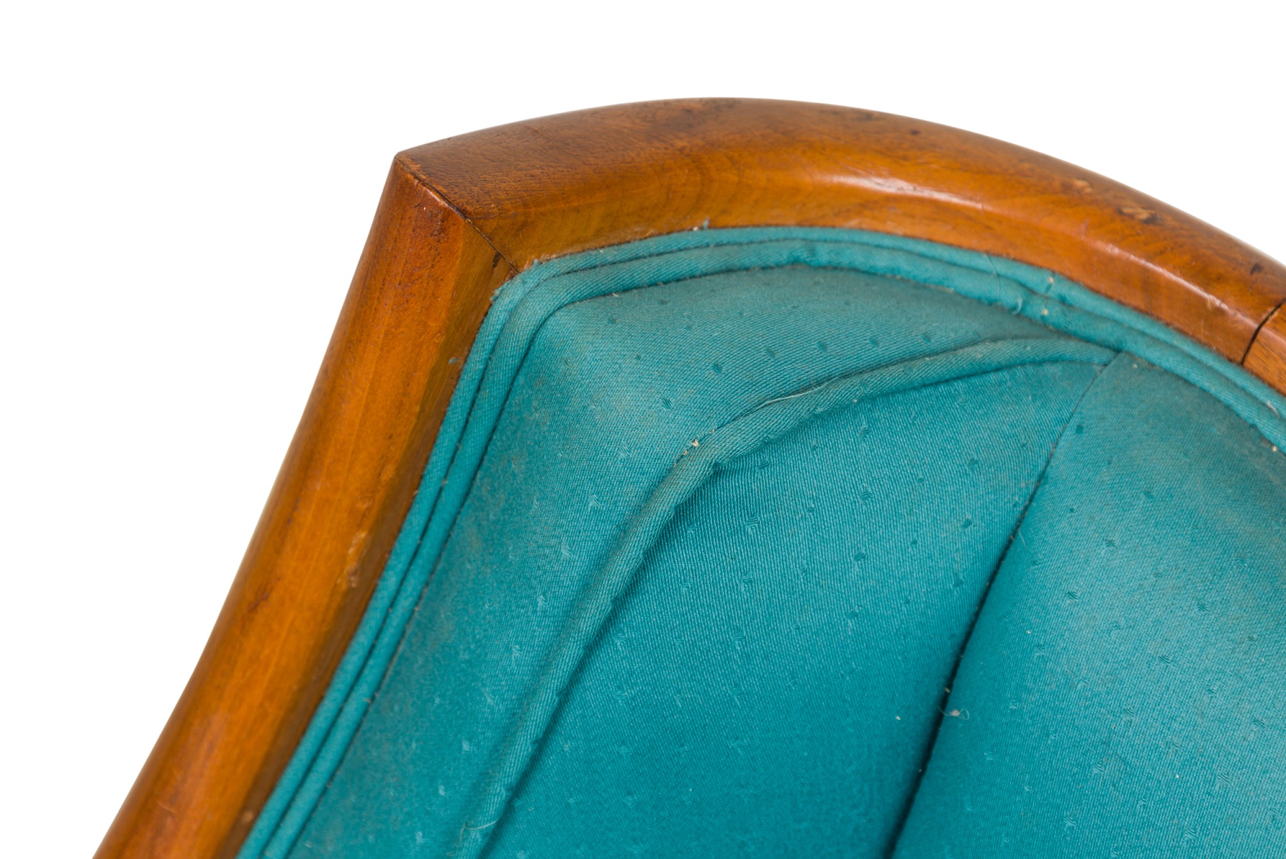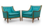 PAIR of Mid-Century Modern bergere armchairs with walnut frames, upholstered in a blue / teal textured fabric, resting on four tapered walnut legs. (T.H. ROBSJOHN-GIBBINGS)(PRICED AS PAIR).