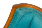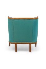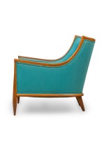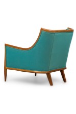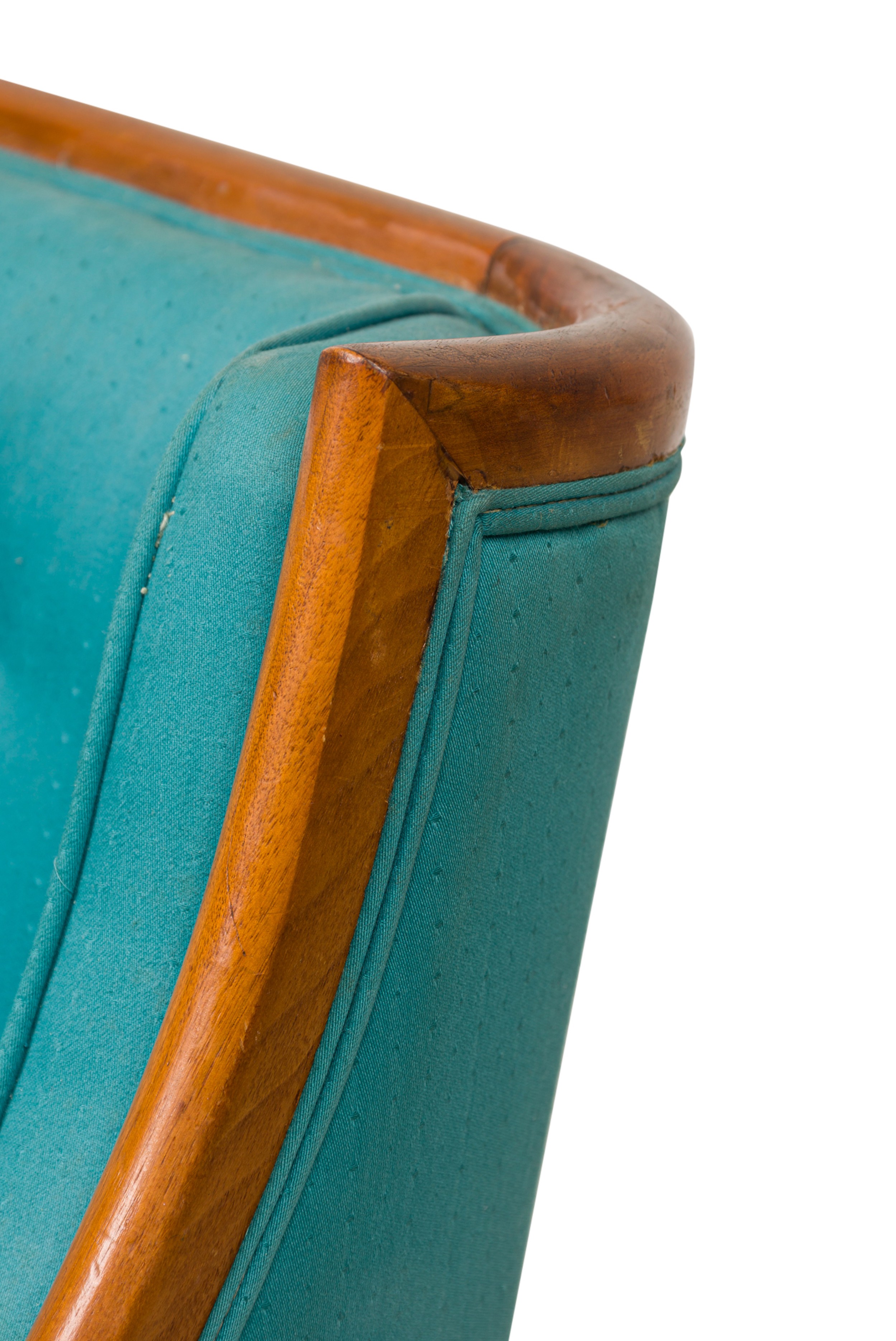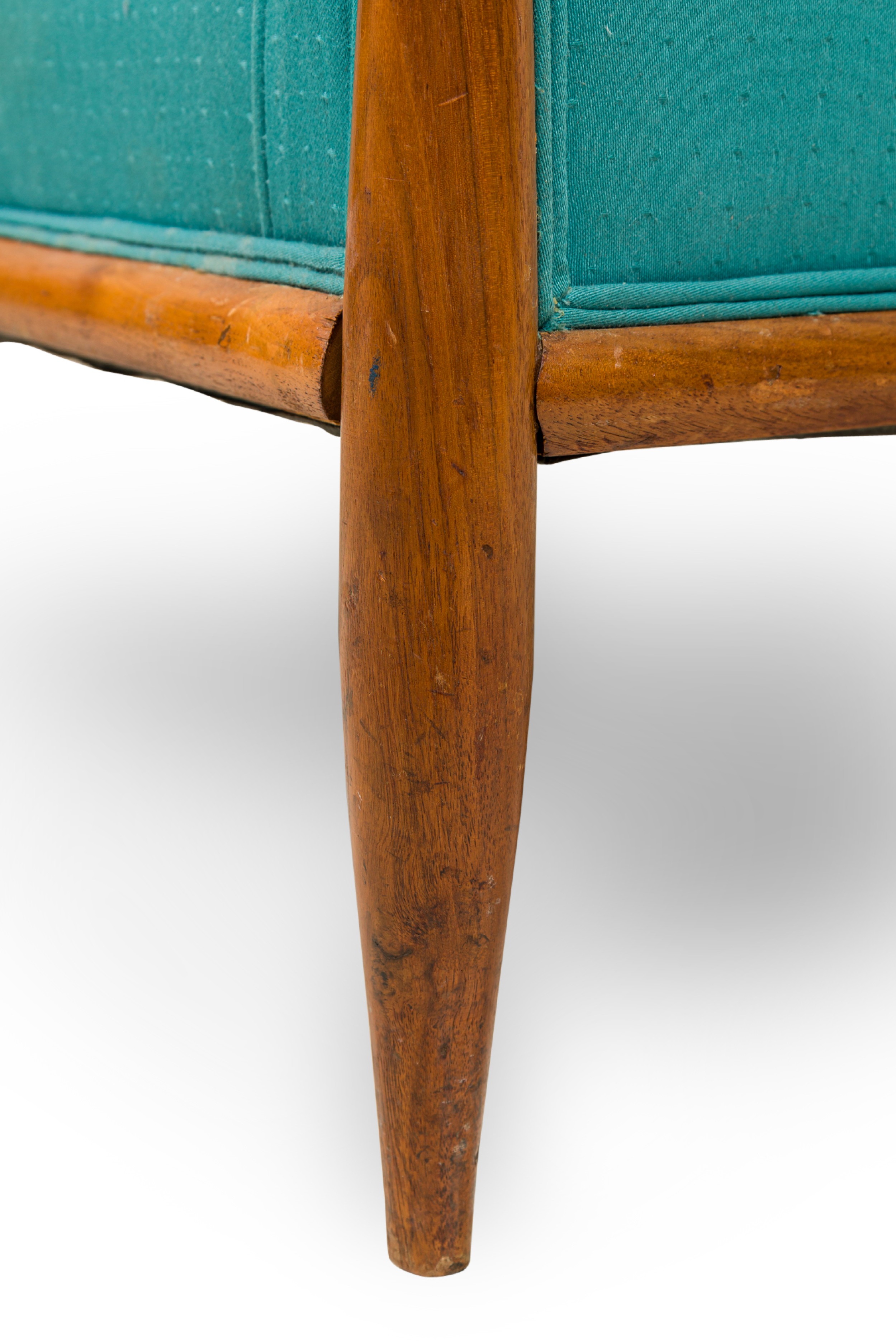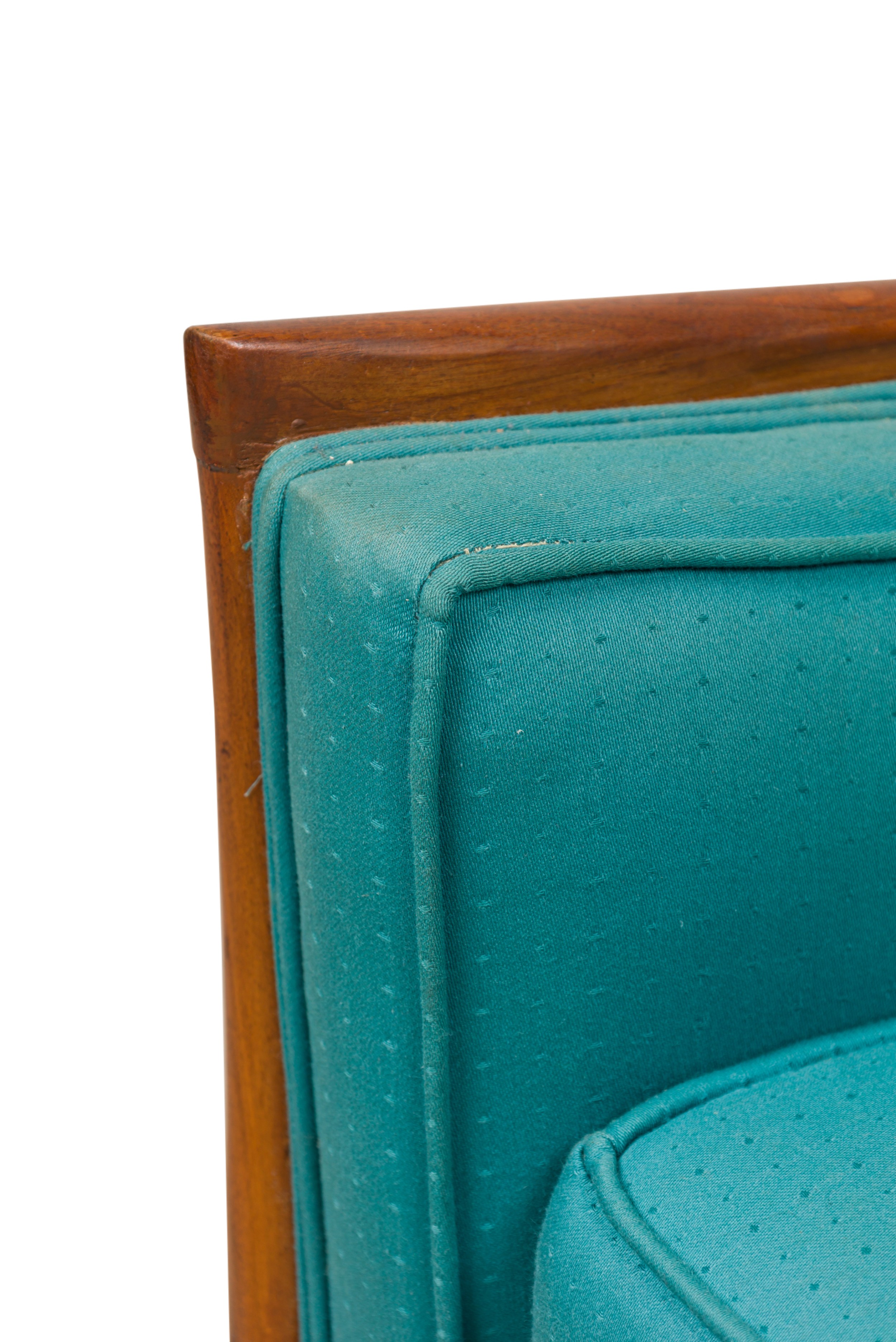 PAIR of Mid-Century Modern bergere armchairs with walnut frames, upholstered in a blue / teal textured fabric, resting on four tapered walnut legs. (T.H. ROBSJOHN-GIBBINGS)(PRICED AS PAIR)
