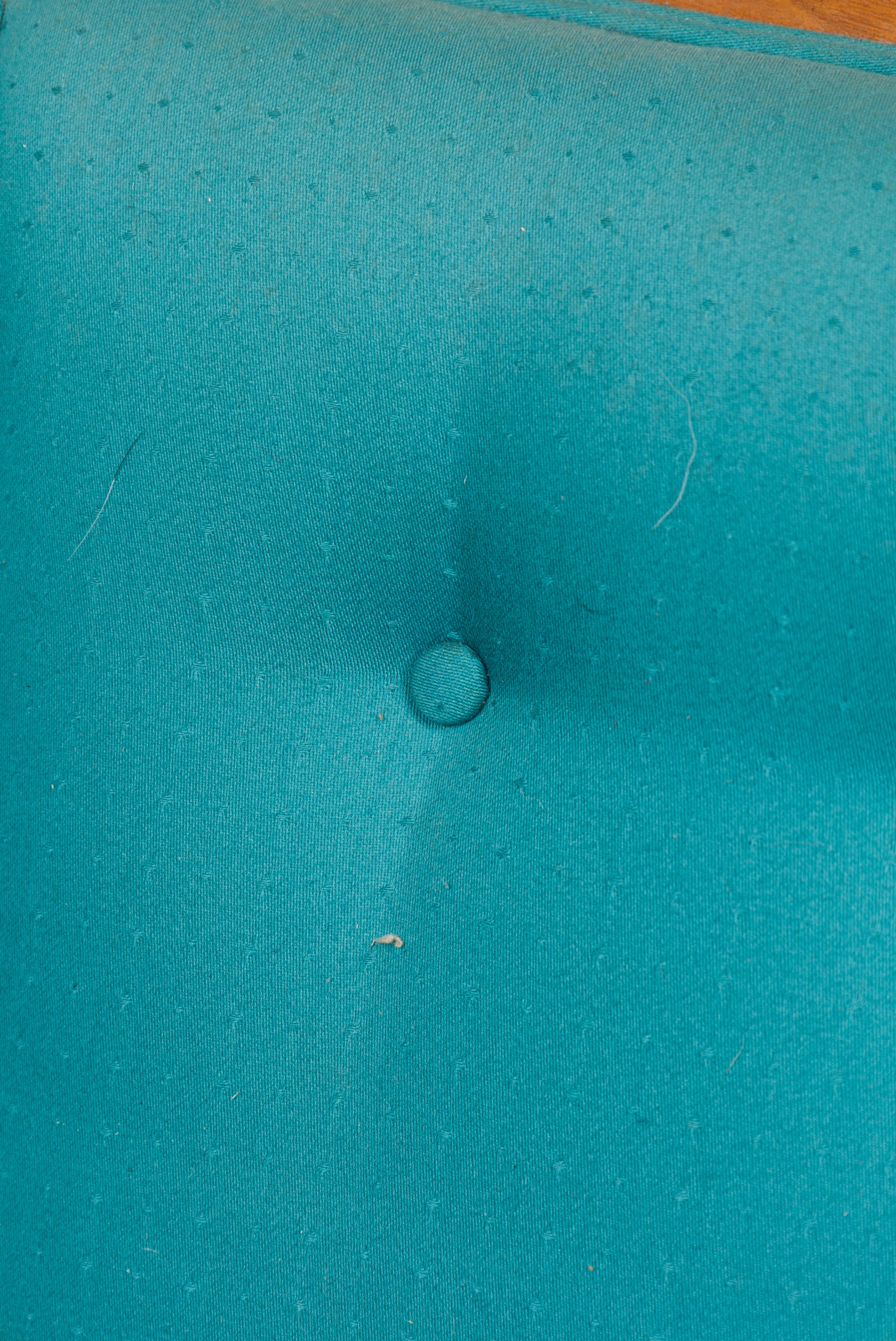 Style: Mid-Century Materials & Techniques: Fabric, upholstered, walnut, wood Category: Seating Good; Wear consistent with age and use