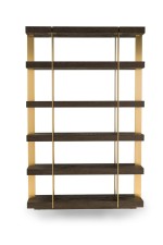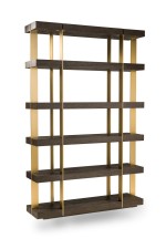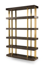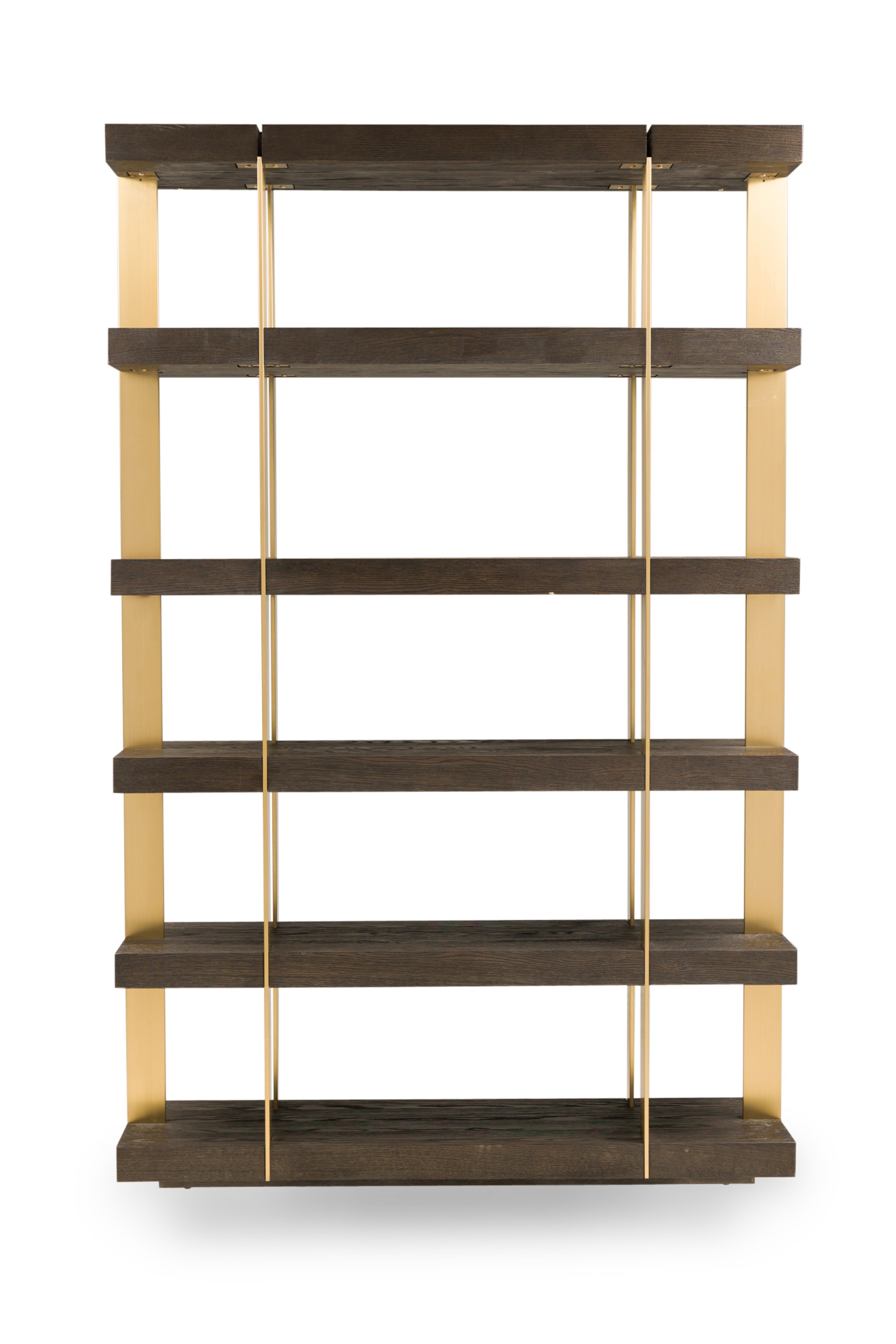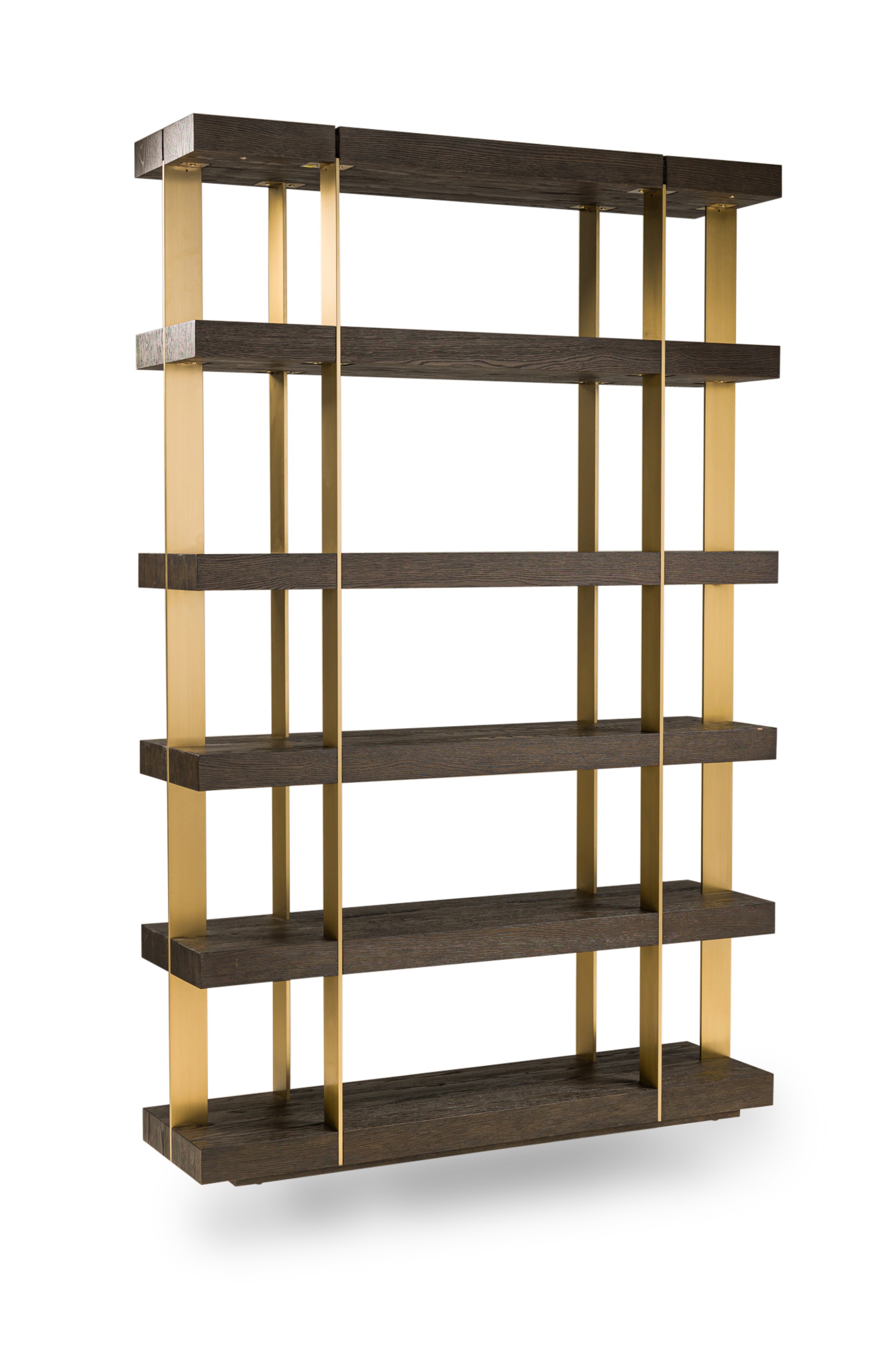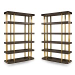 PAIR of Contemporary American bookcases / etagere shelving units featuring 6 brushed gold metal supports ascending vertically and intersecting with 6 dark stained oak block shelves (THOMAS BINA & ED ROBINSON FOR RH OVEIDO) (PRICED AS PAIR).