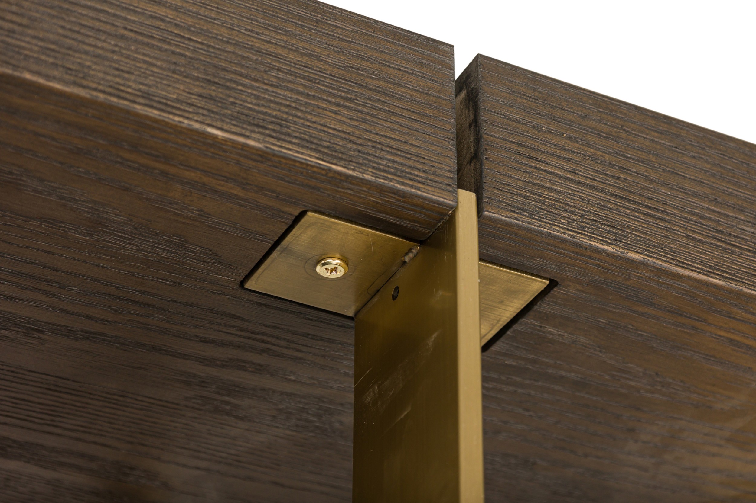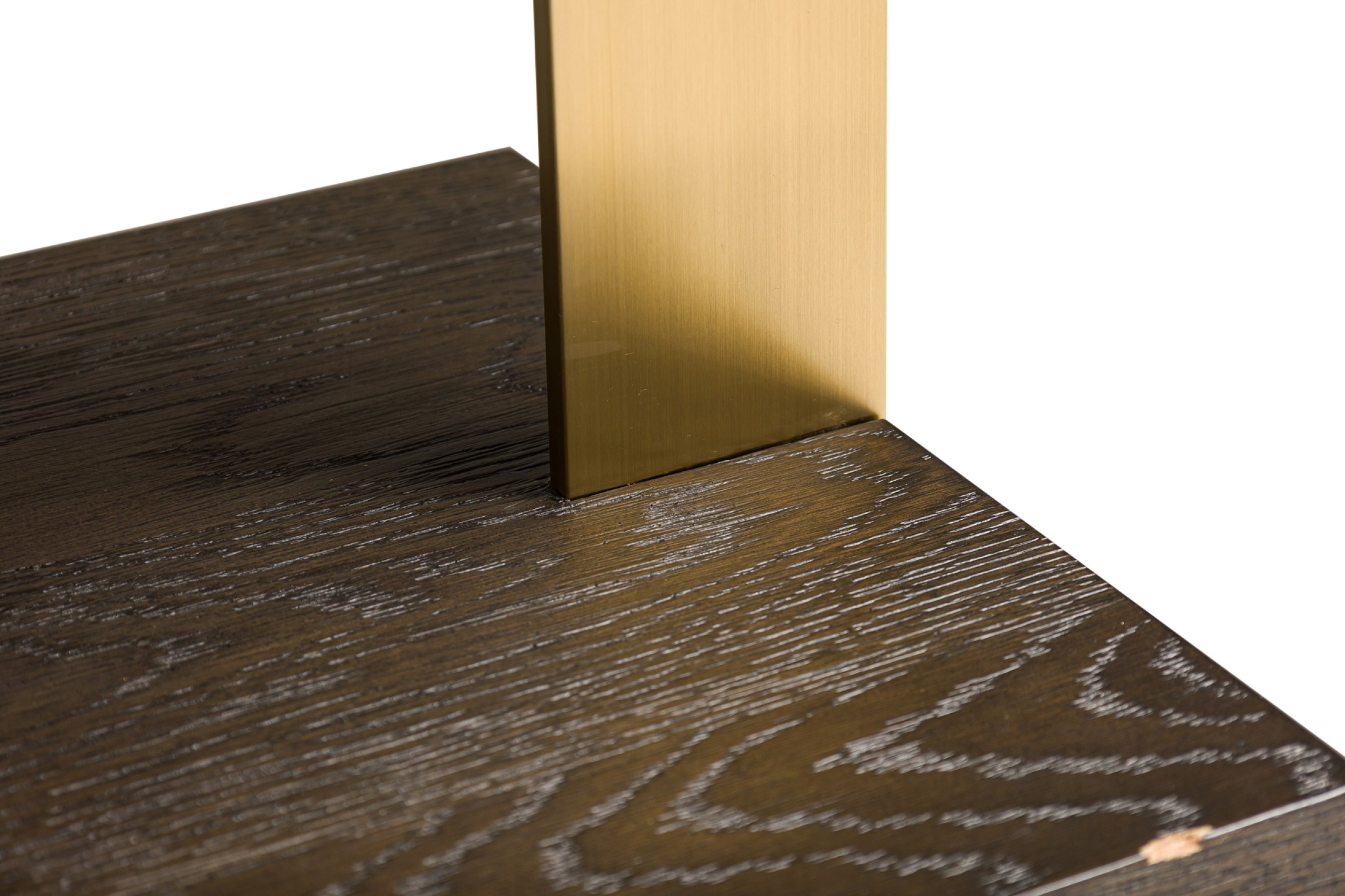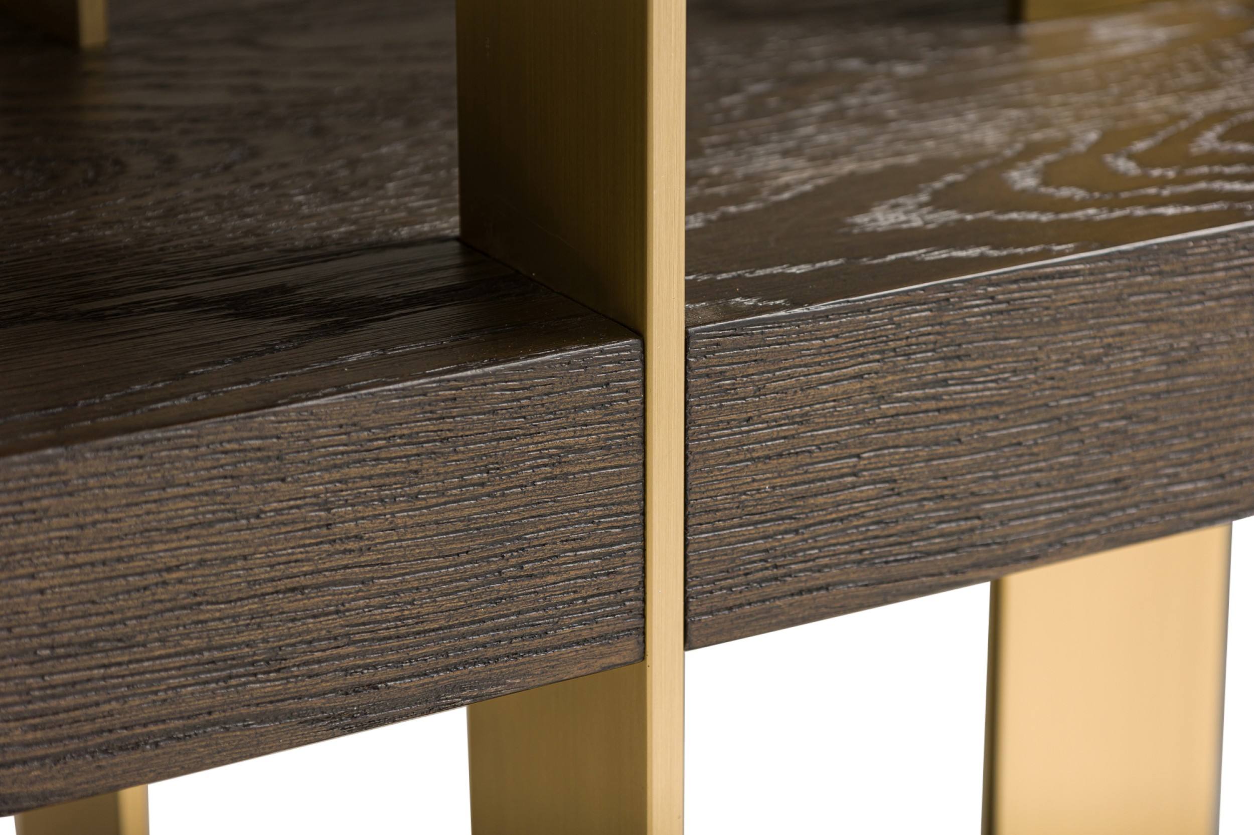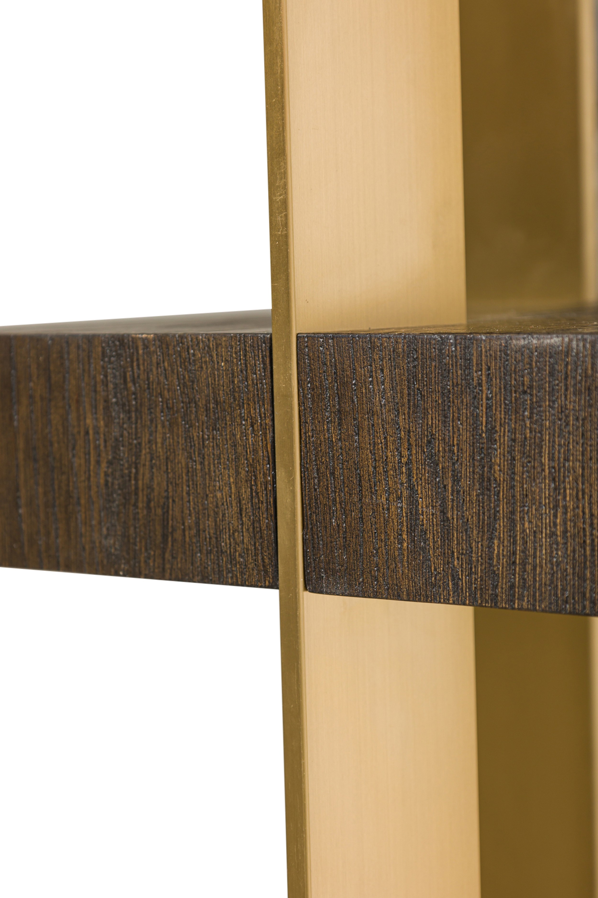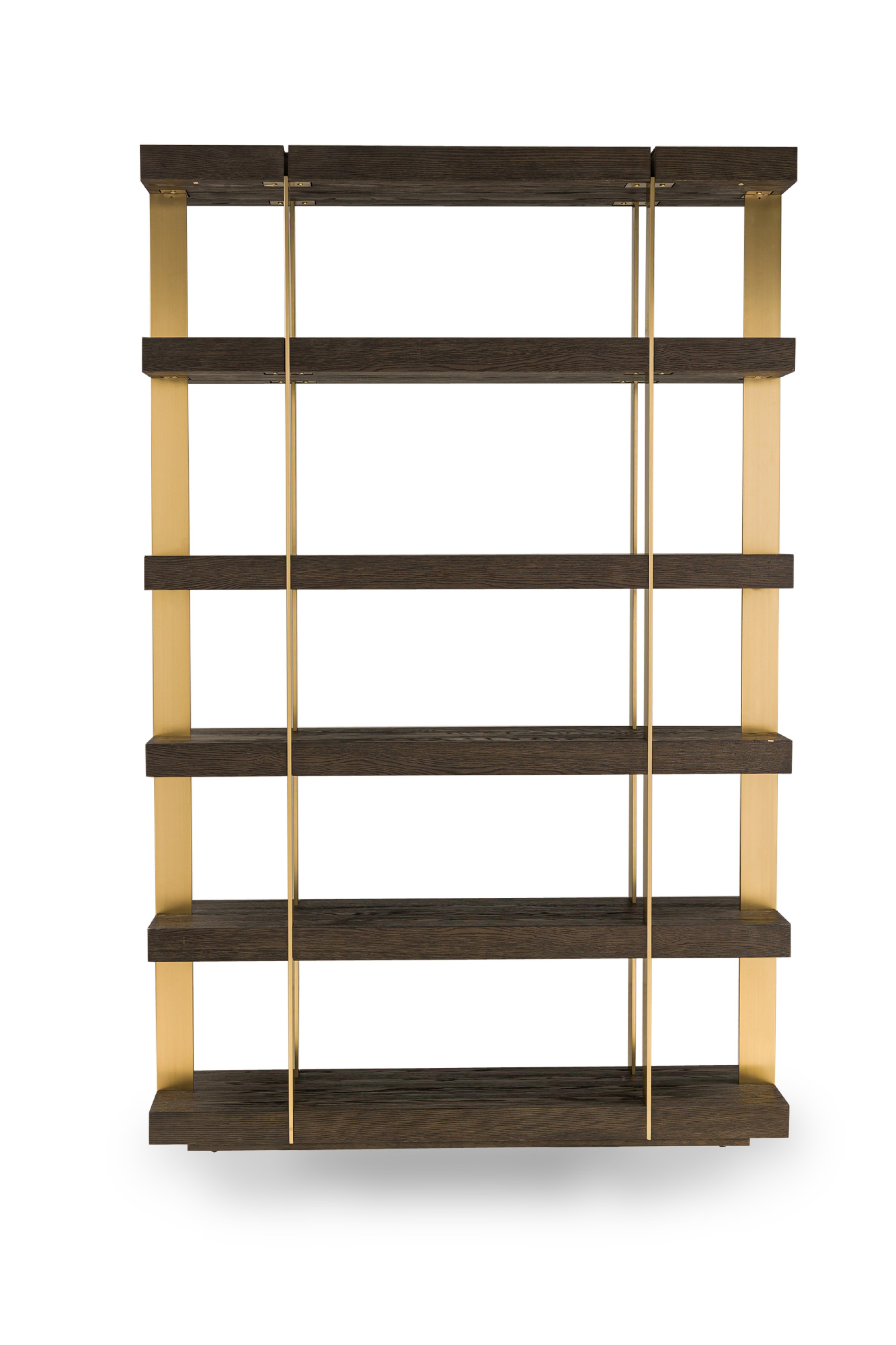 PAIR of Contemporary American bookcases / etagere shelving units featuring 6 brushed gold metal supports ascending vertically and intersecting with 6 dark stained oak block shelves (THOMAS BINA & ED ROBINSON FOR RH OVEIDO) (PRICED AS PAIR)