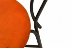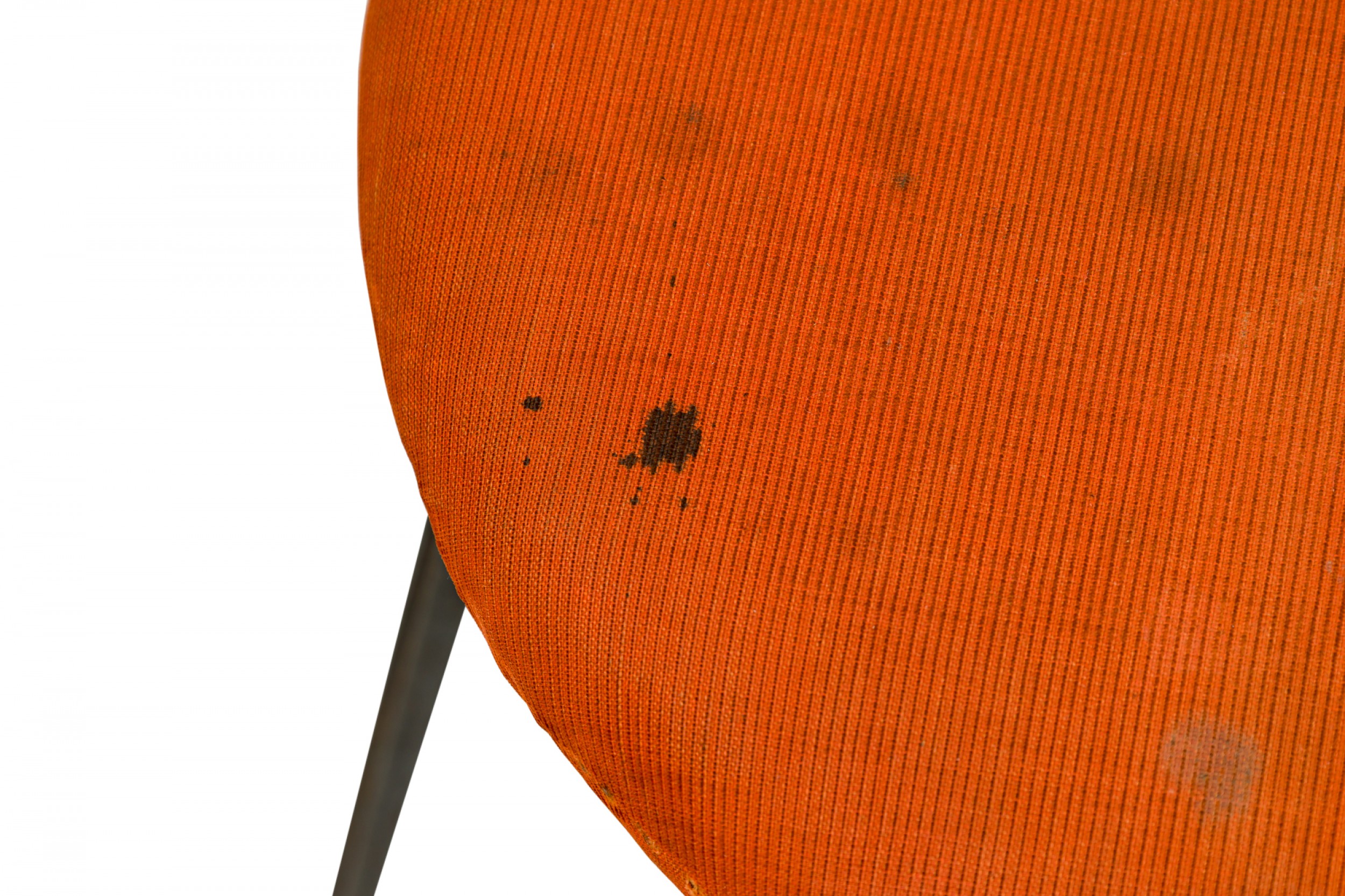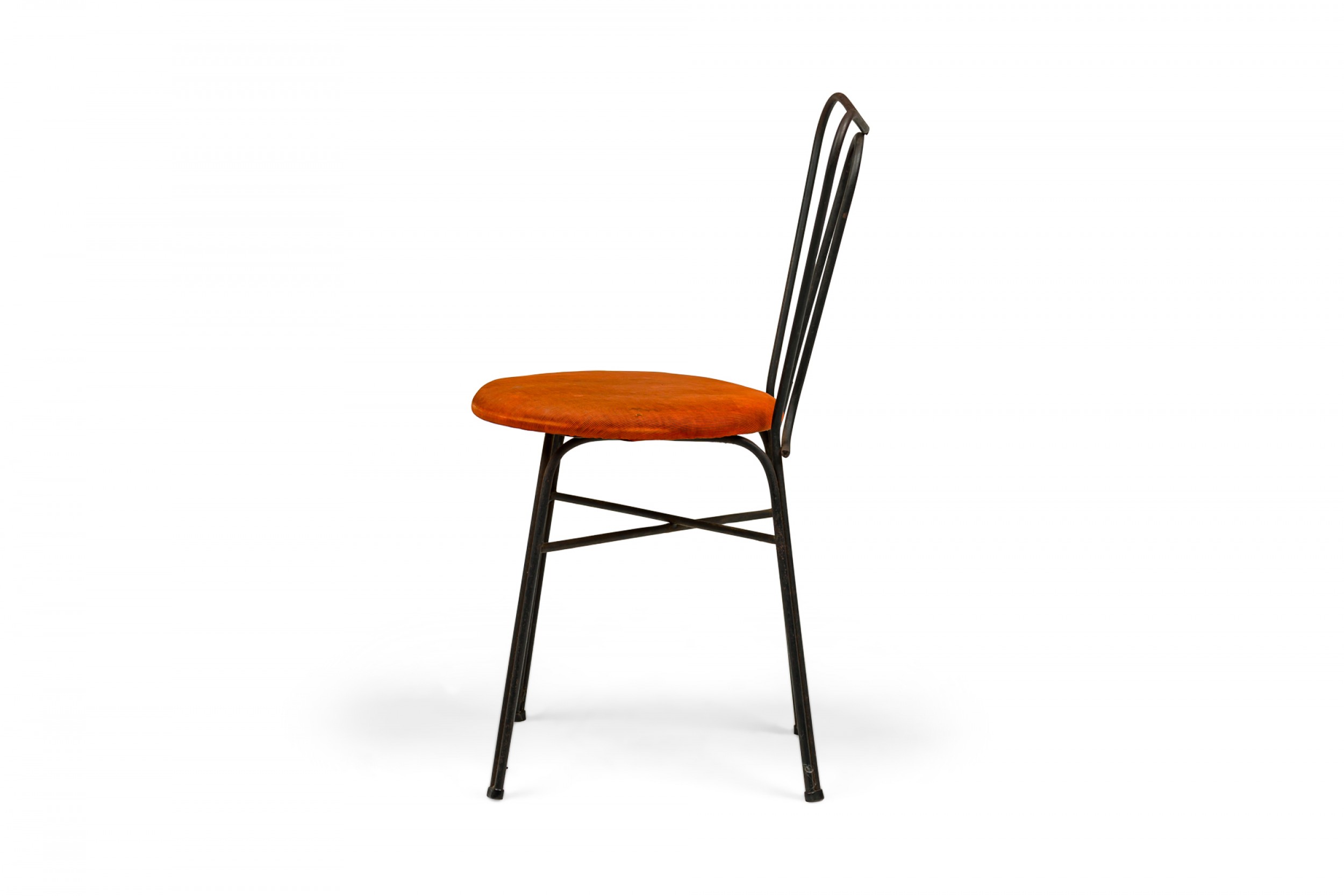 PAIR of American Mid-Century ice cream parlor side chairs with black iron frames, open hairpin backs, and circular orange woven fabric upholstered seats, resting on four angled legs. (TONY PAUL)(PRICED AS SET)