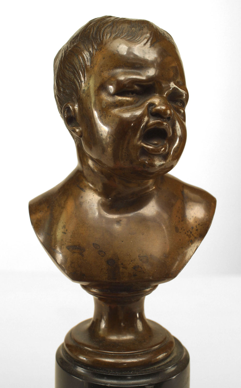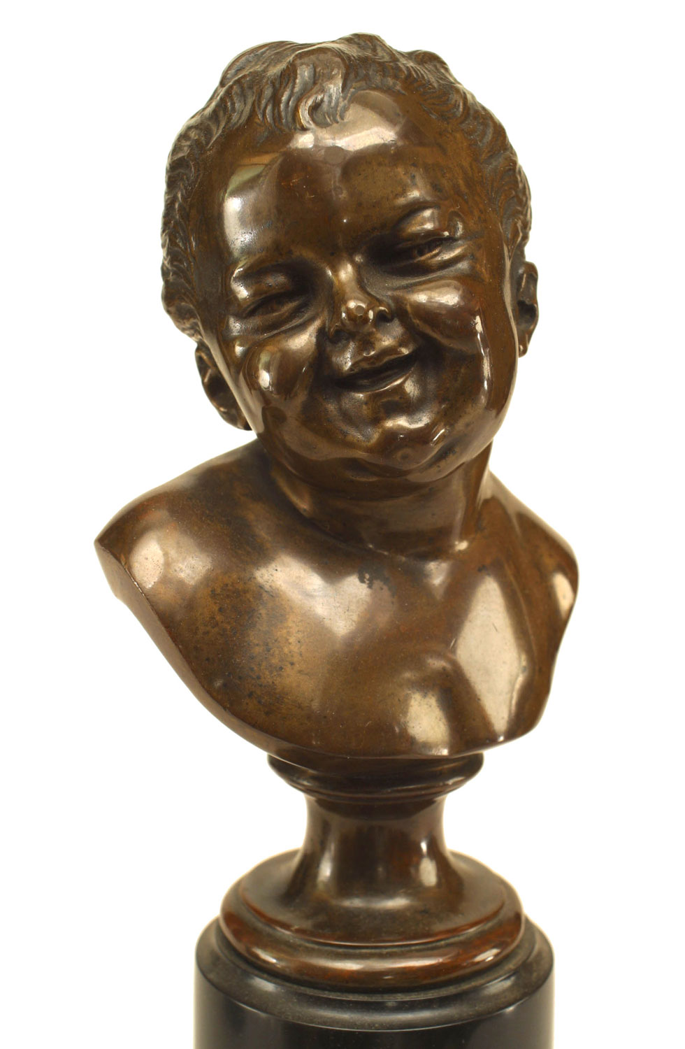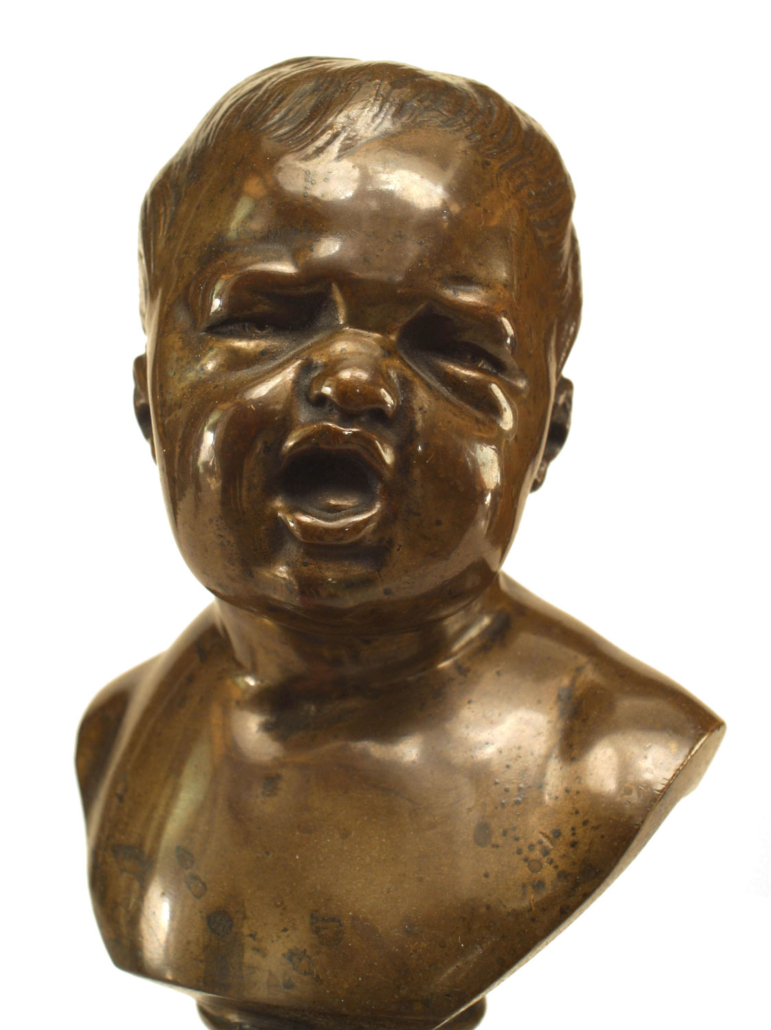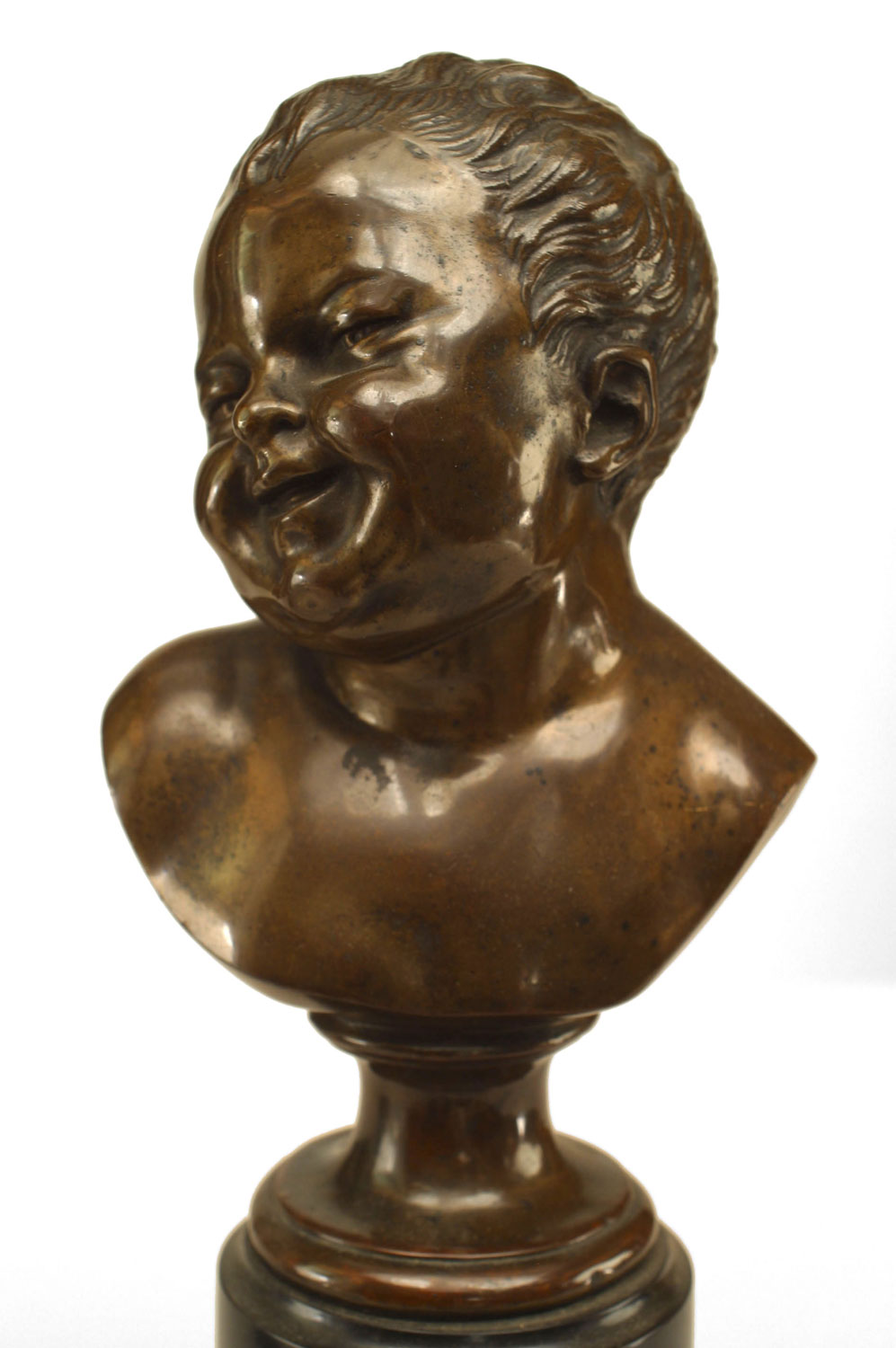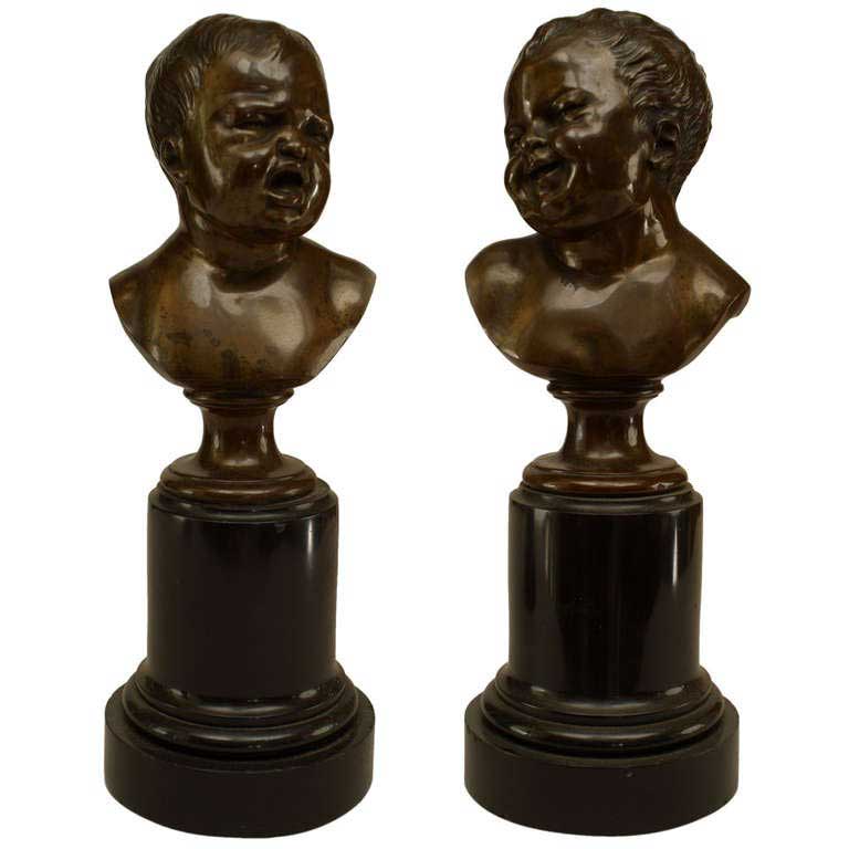 PAIR of French Victorian bronze busts of laughing & crying babies on round black marble pedestal bases.