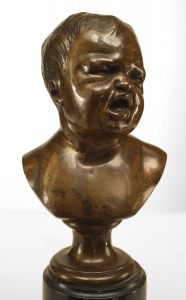 PAIR of French Victorian bronze busts of laughing & crying babies on round black marble pedestal bases..