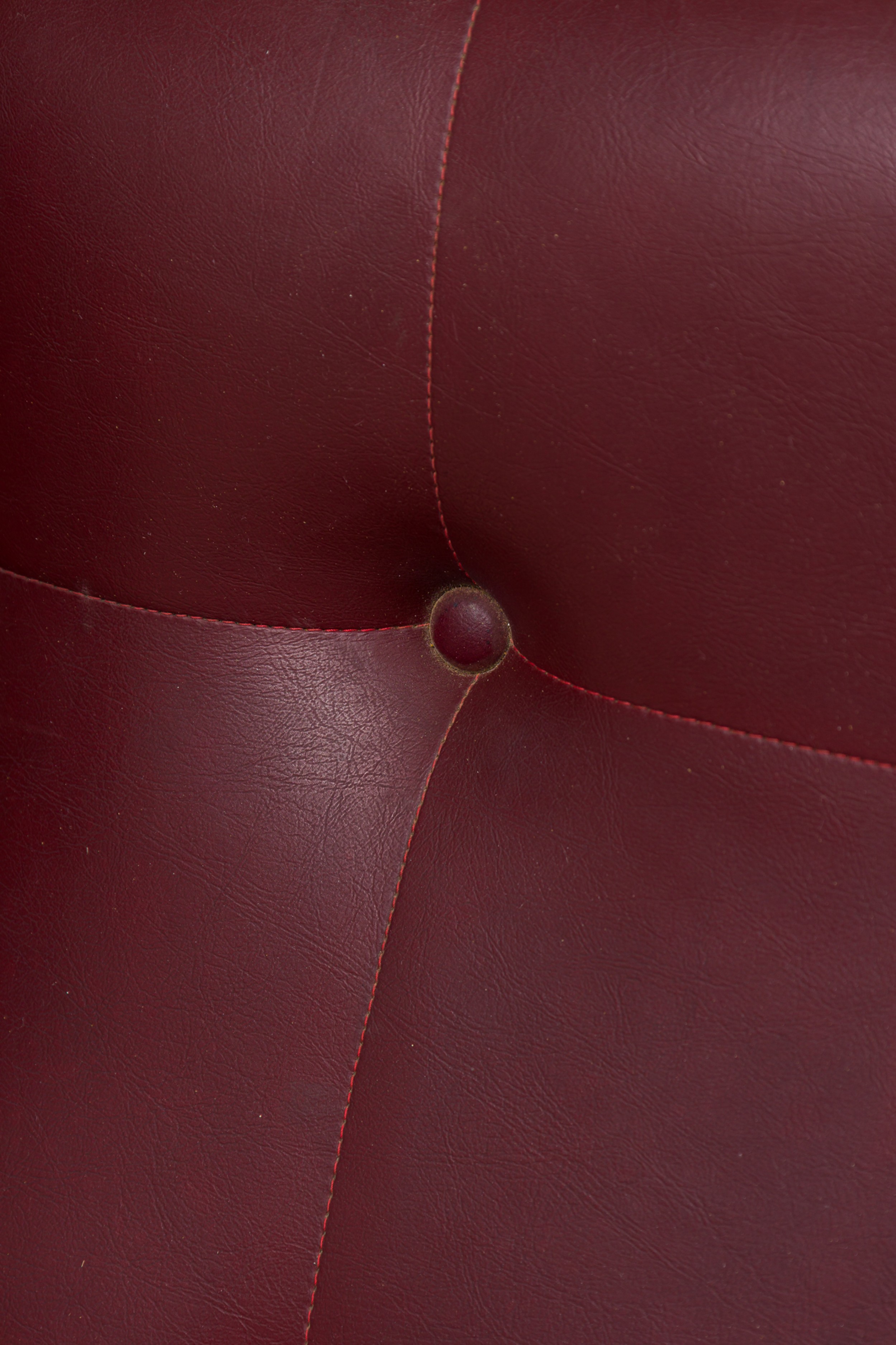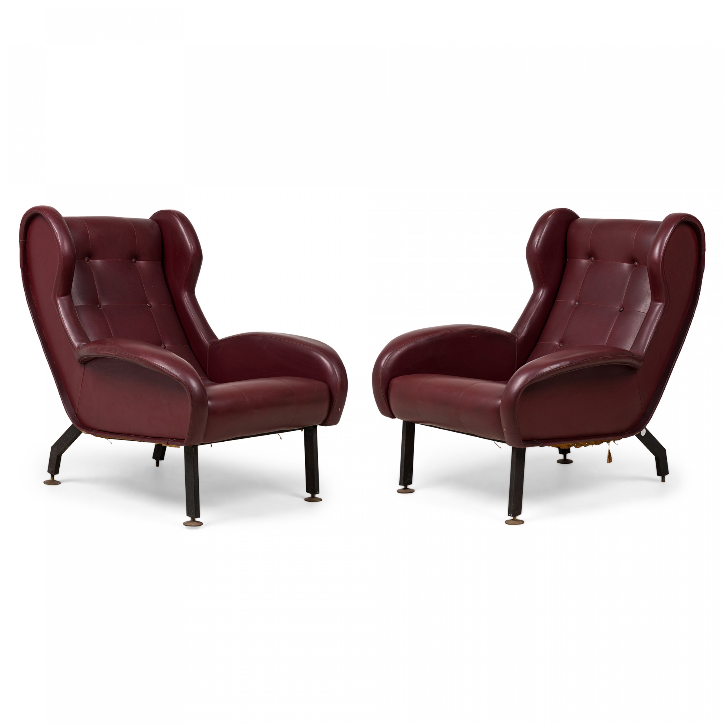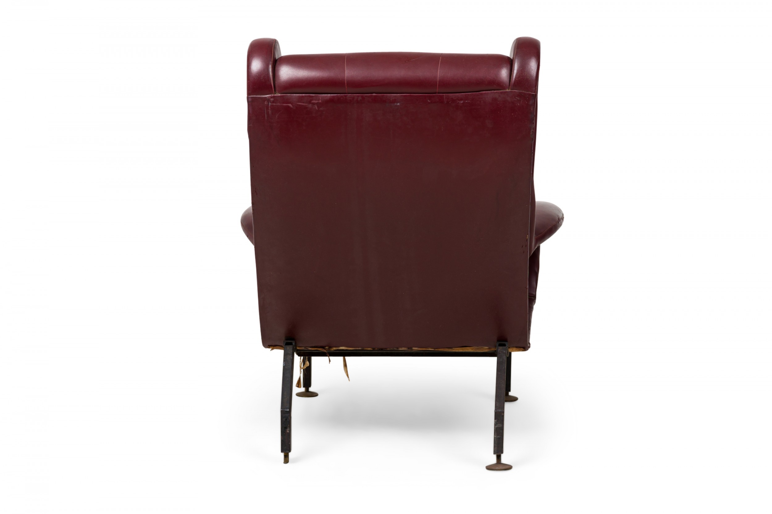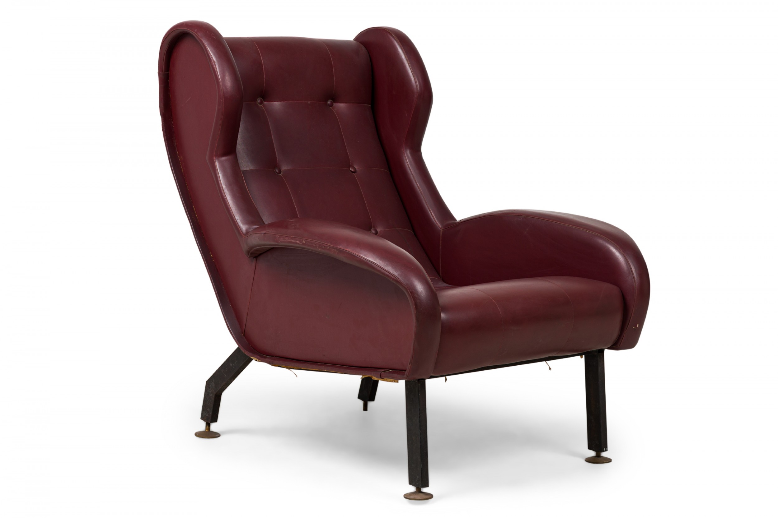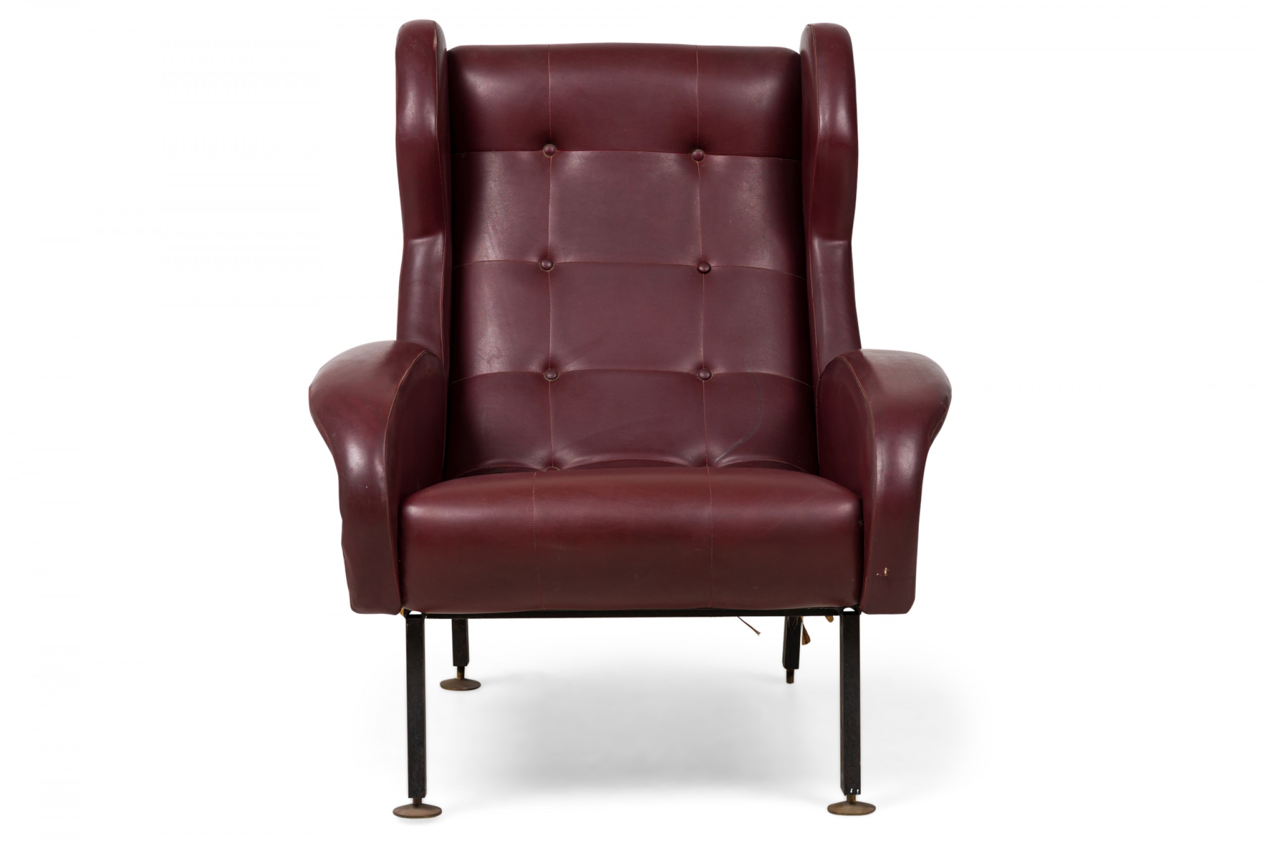 PAIR of Mid-Century Norwegian (1970s) wing back armchairs with low side arms upholstered in button tufted deep burgundy red leather and standing on flat bar metal legs with 4 adjustable disc feet. (WESTNOFA) (PRICED AS PAIR)