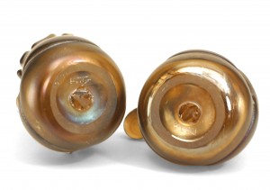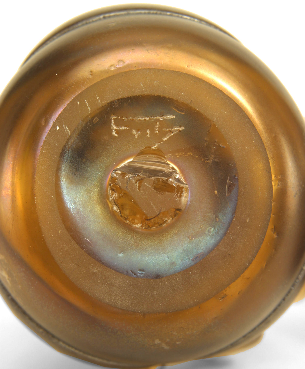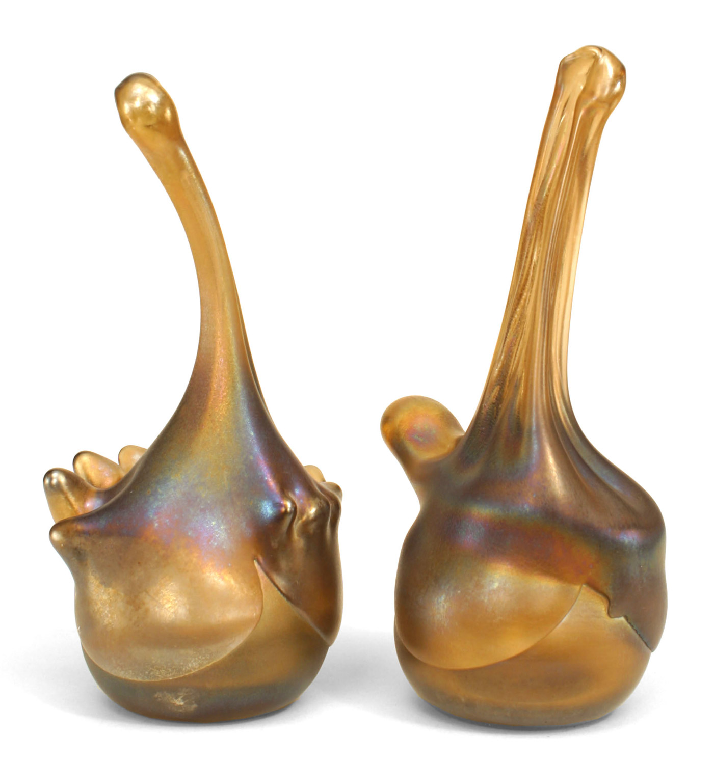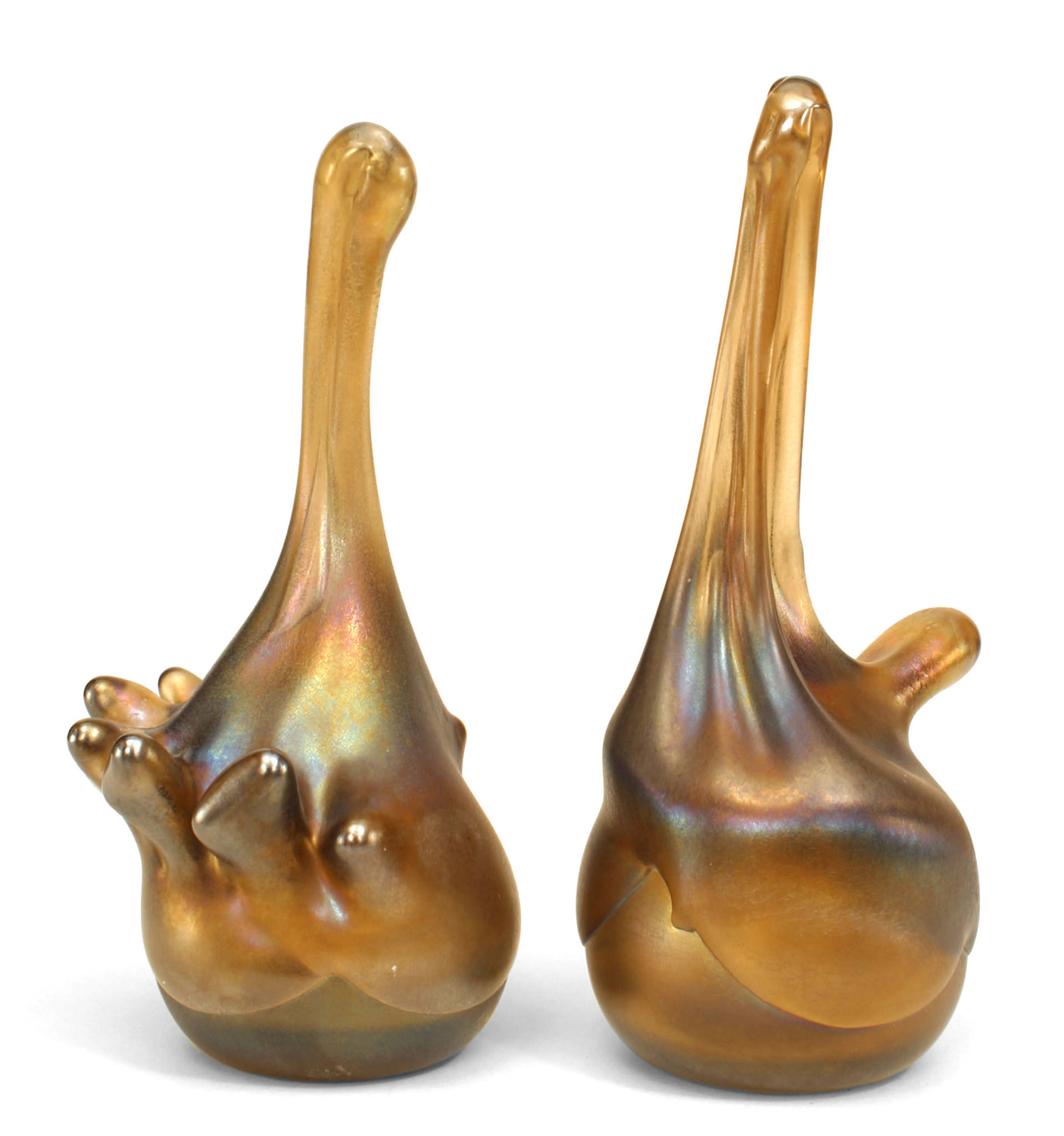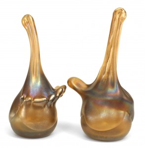 PAIR of American Mid-Century modern iridescent glass bookends / paperweights with free-form design signed "Fritz". (PRICED AS PAIR).