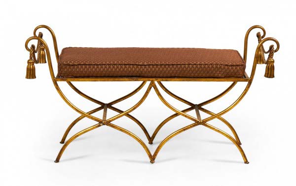 Italian Mid-Century rope and tassel design vanity bench with a gilt iron frame, low scrollwork back, and a red velvet upholstered seat cushion. (PALLADIO).