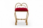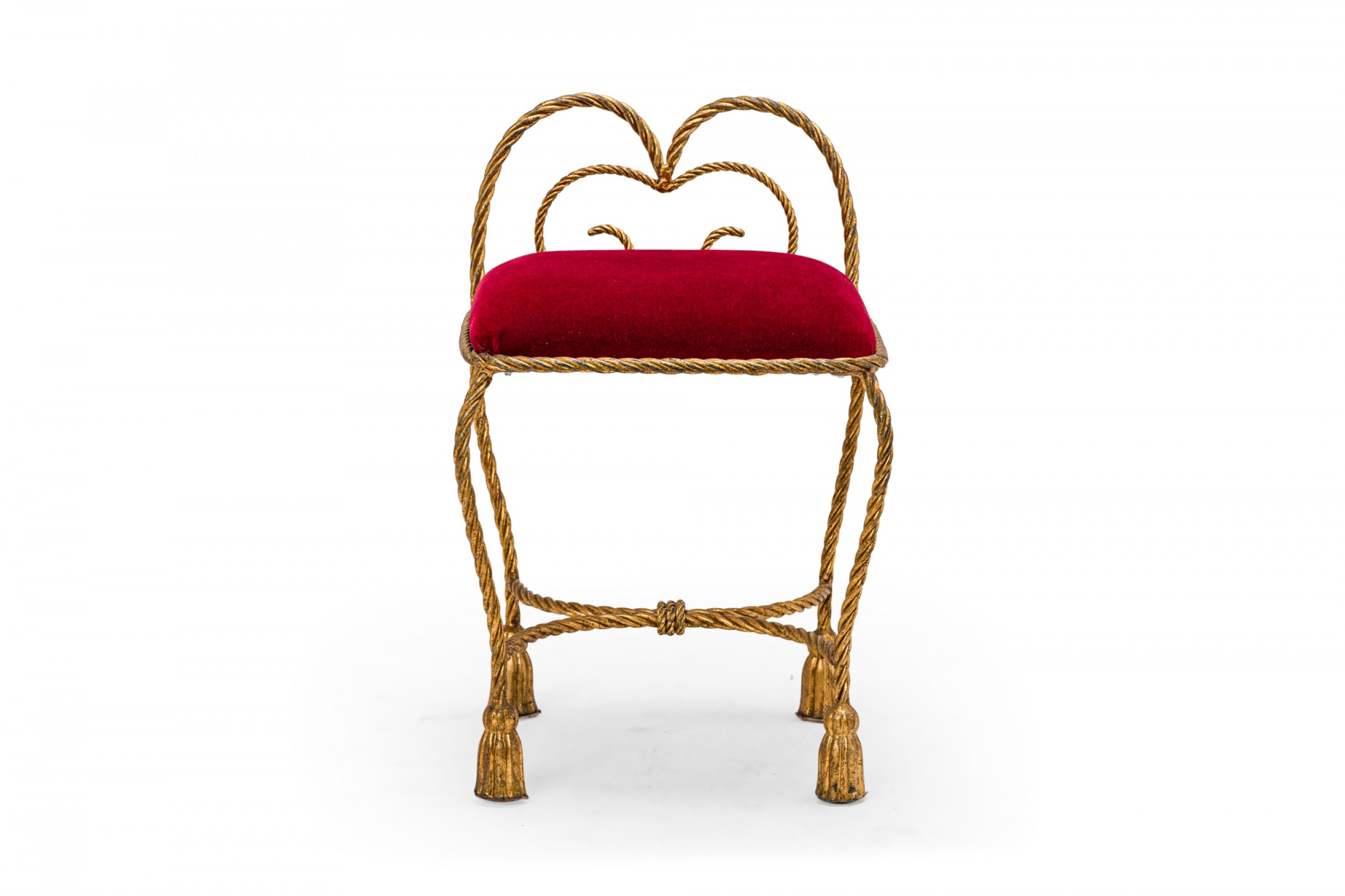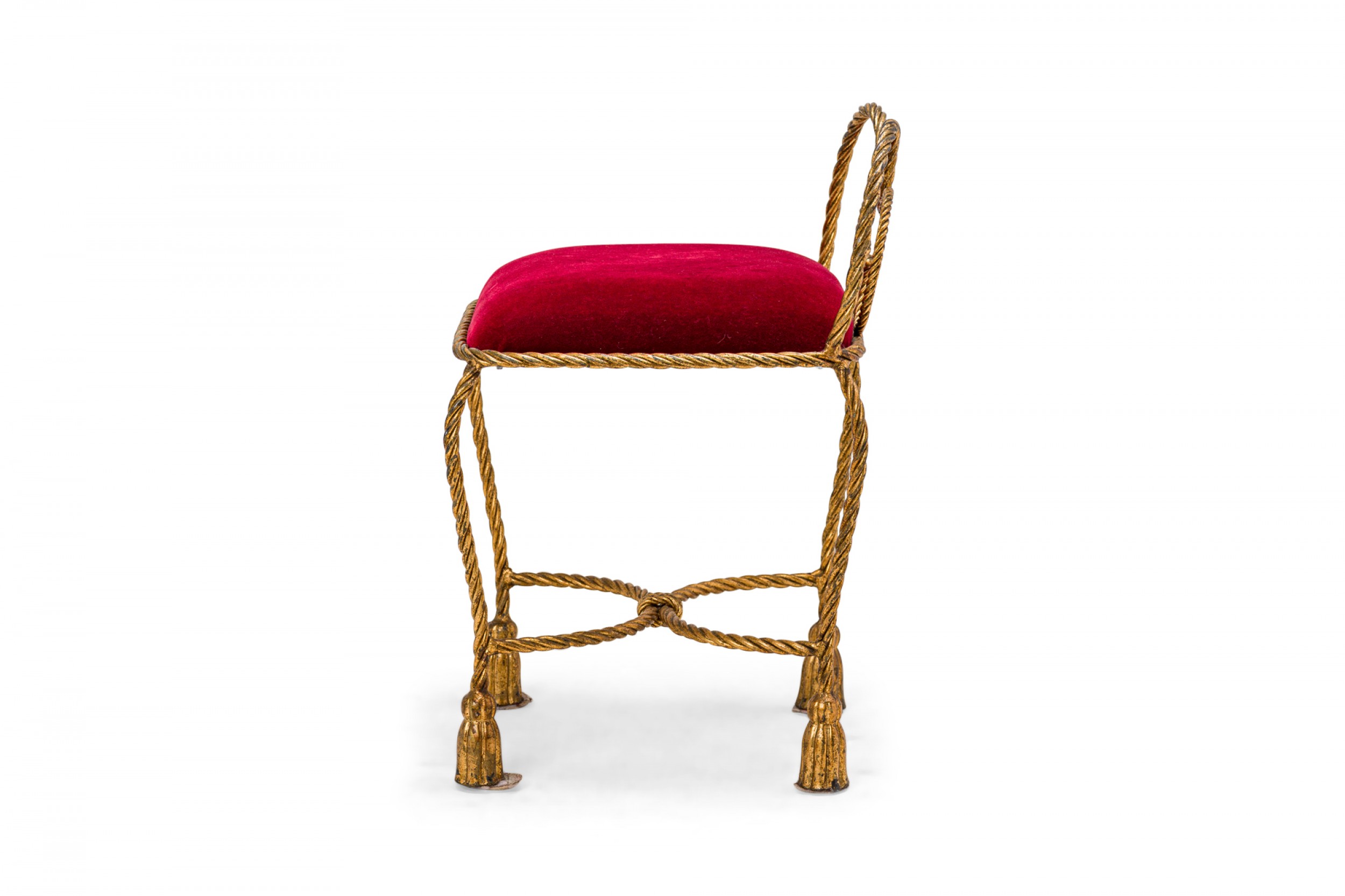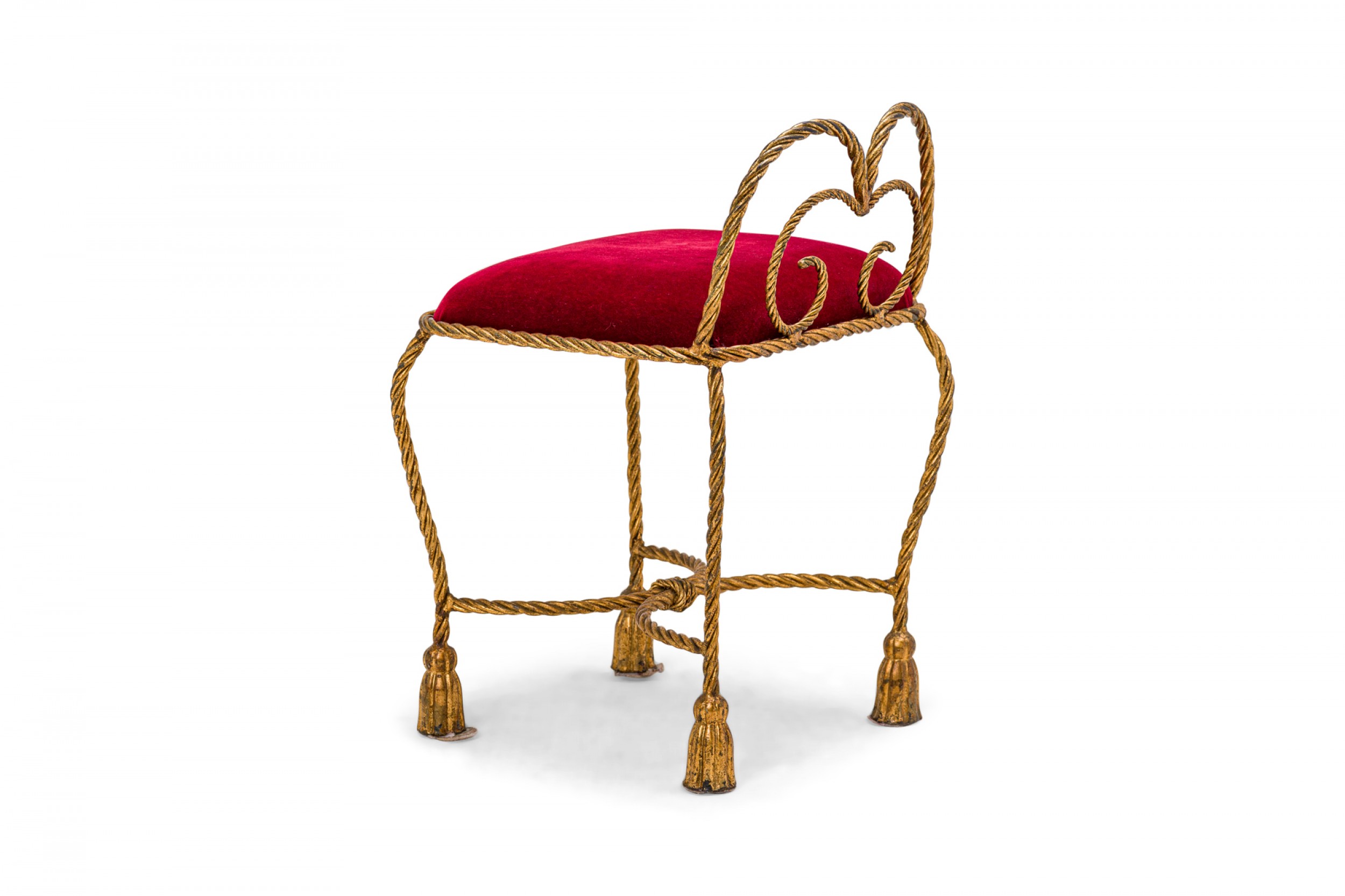 Italian Mid-Century rope and tassel design vanity bench with a gilt iron frame, low scrollwork back, and a red velvet upholstered seat cushion. (PALLADIO)
