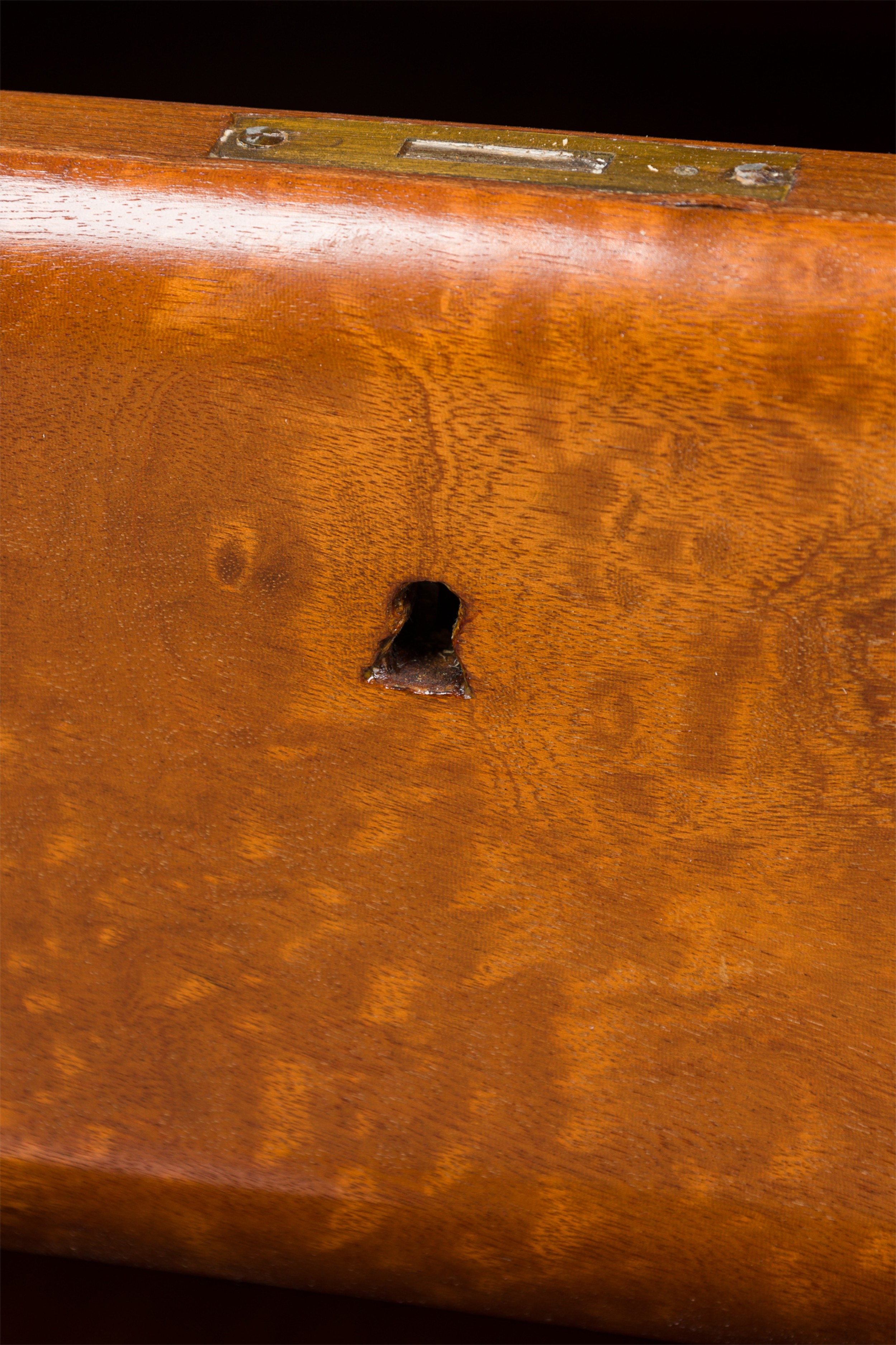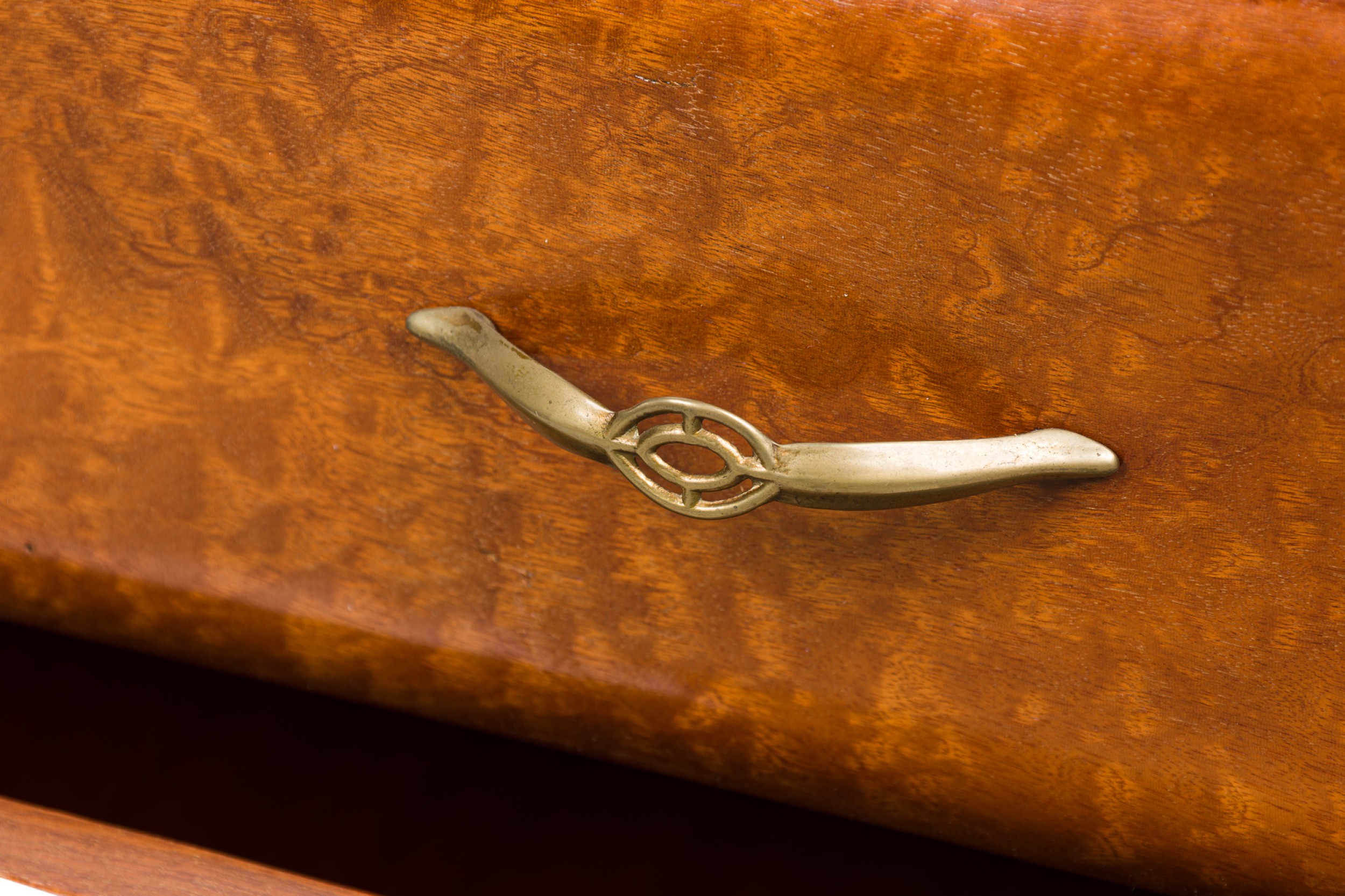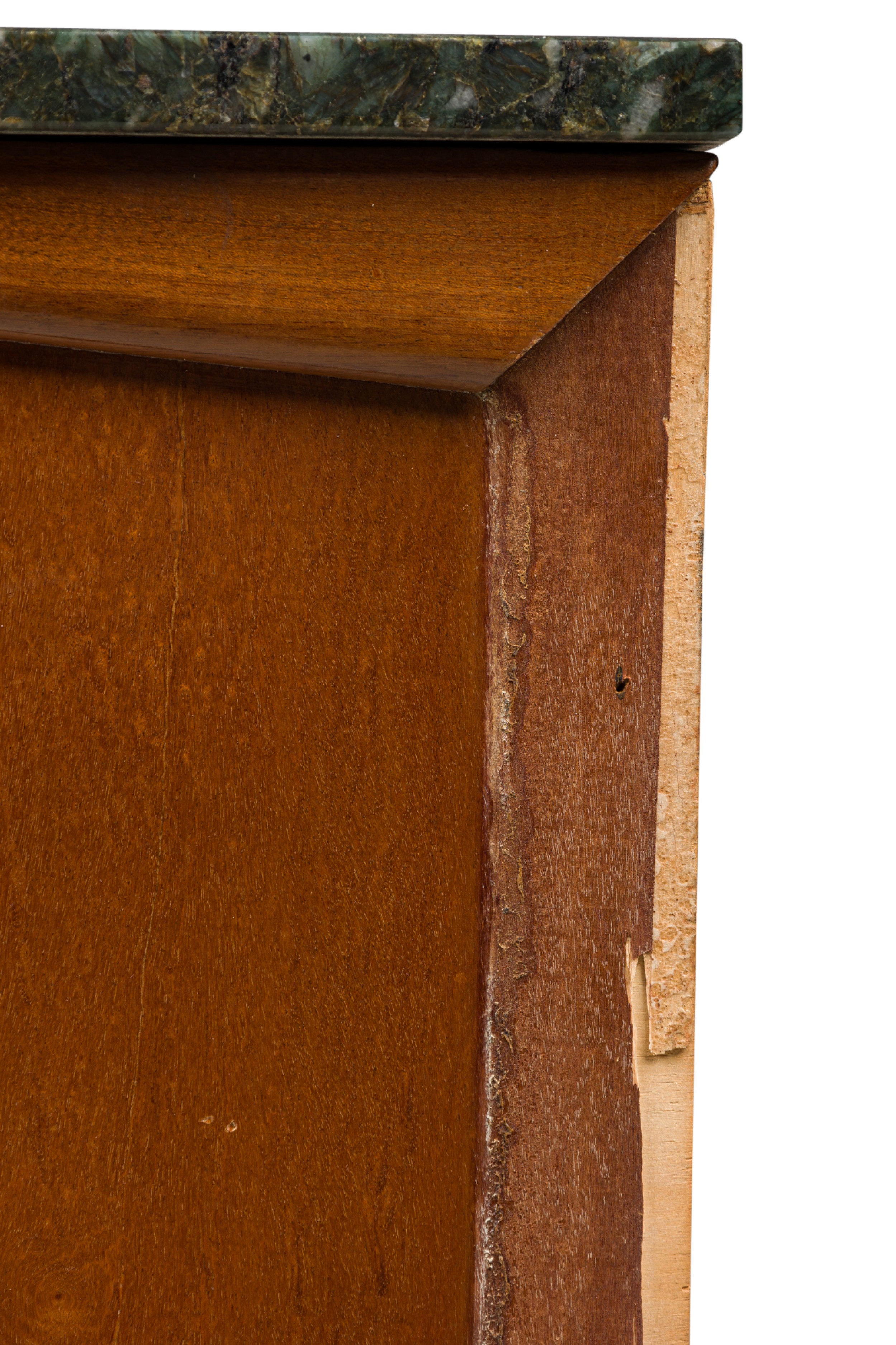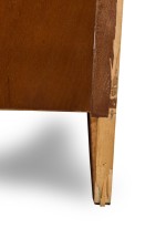 Style: Mid-Century Materials & Techniques: Brass, mahogany, marble, wood Category: Bedroom Condition: Veneer along side of back leg has become detached Good; Wear consistent with age and use