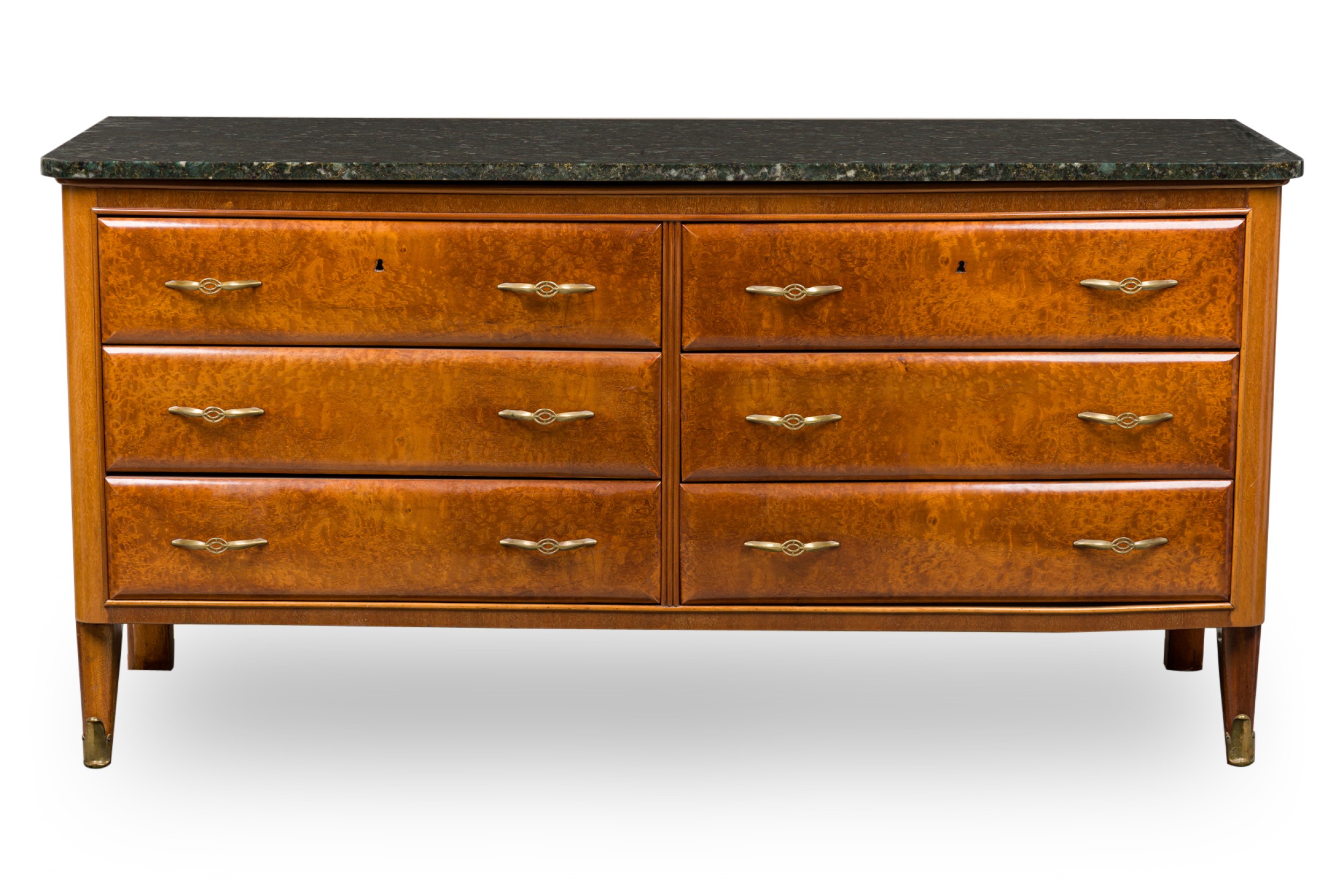Italian Mid-Century mahogany dresser / sideboard / chest with 6 drawers mounted with brass drawer pulls supporting a dark green / black marble top, resting on four legs, the front two tapered and ending in brass sabots. (PAOLO BUFFA)