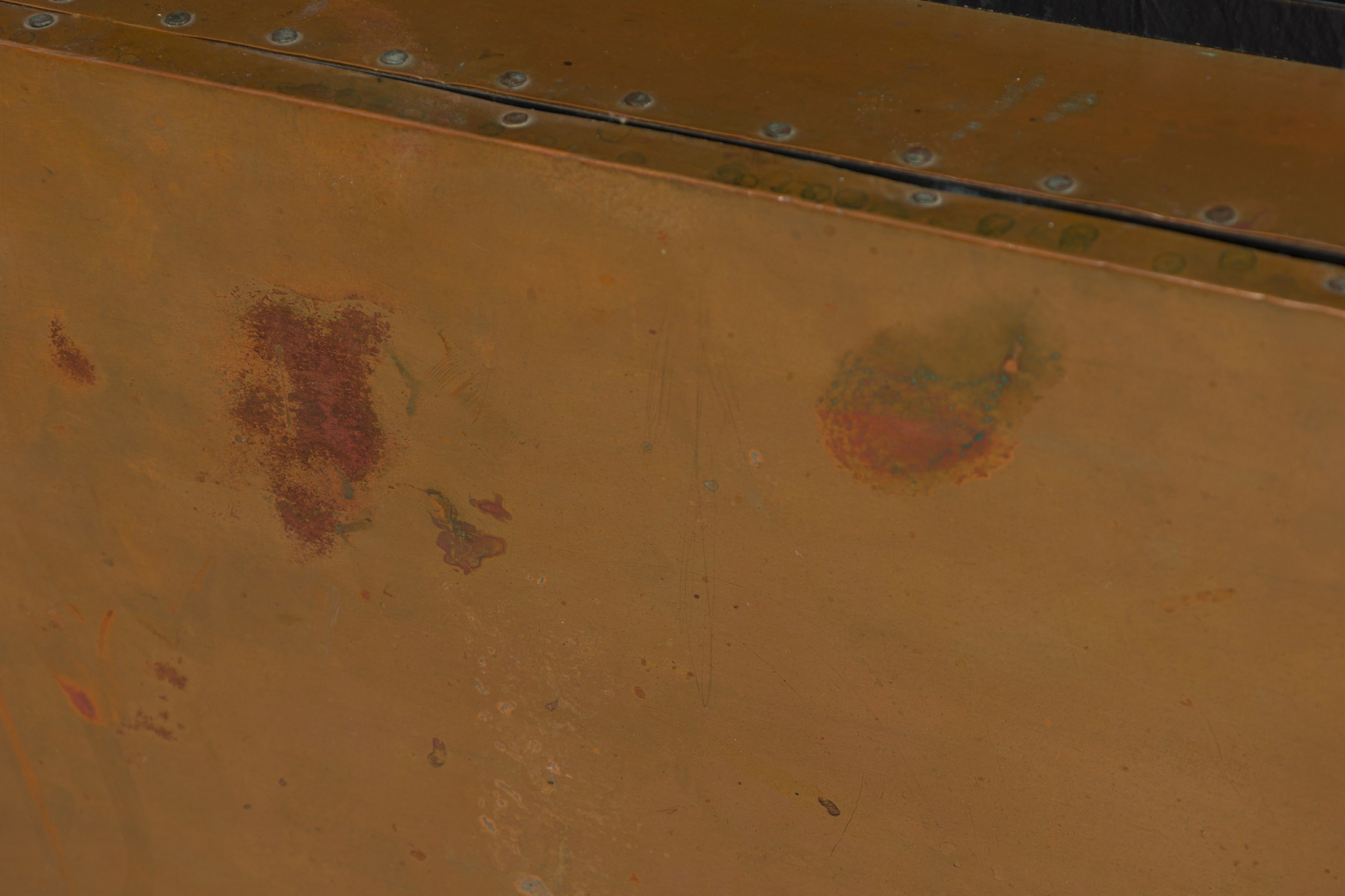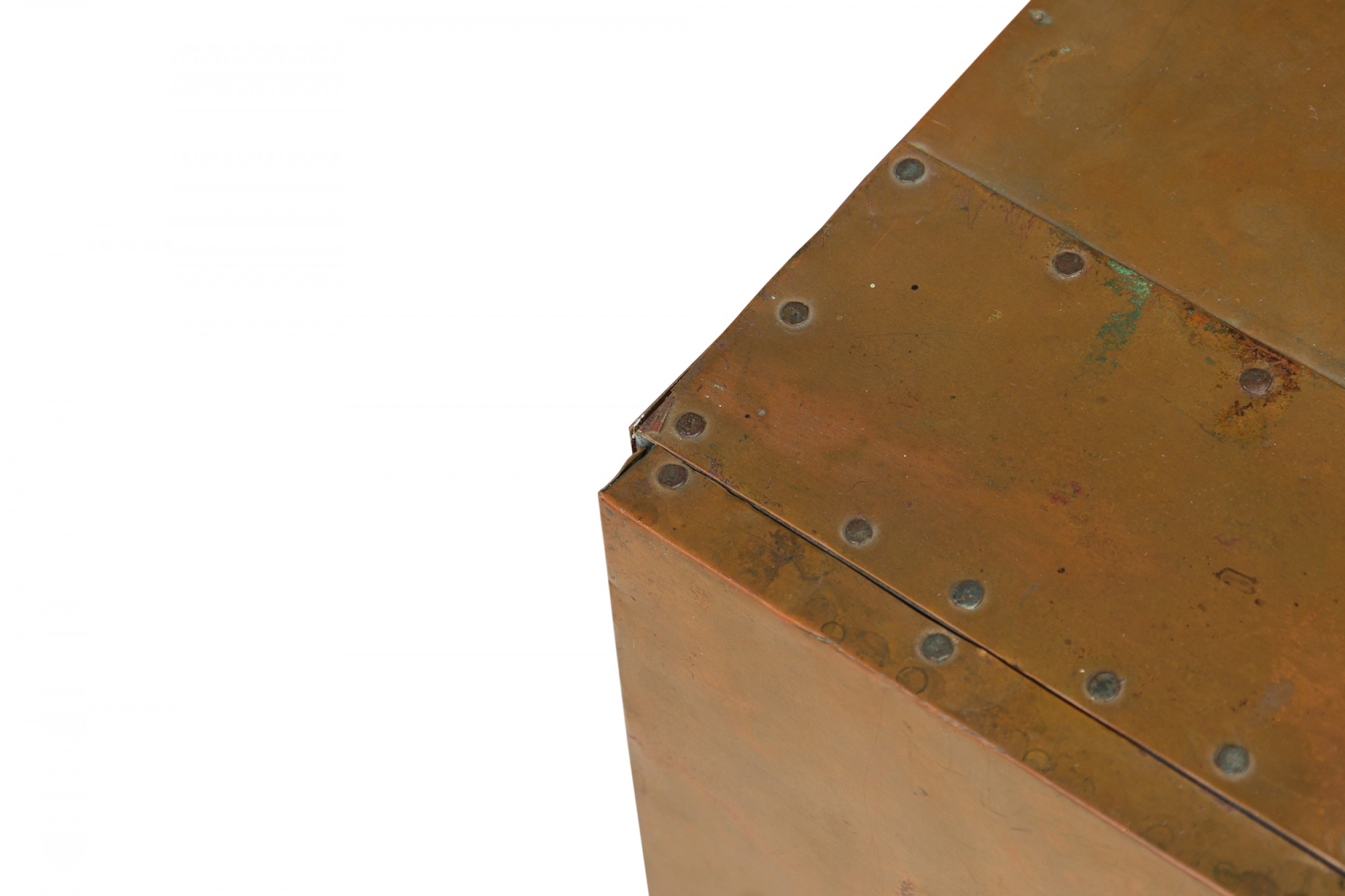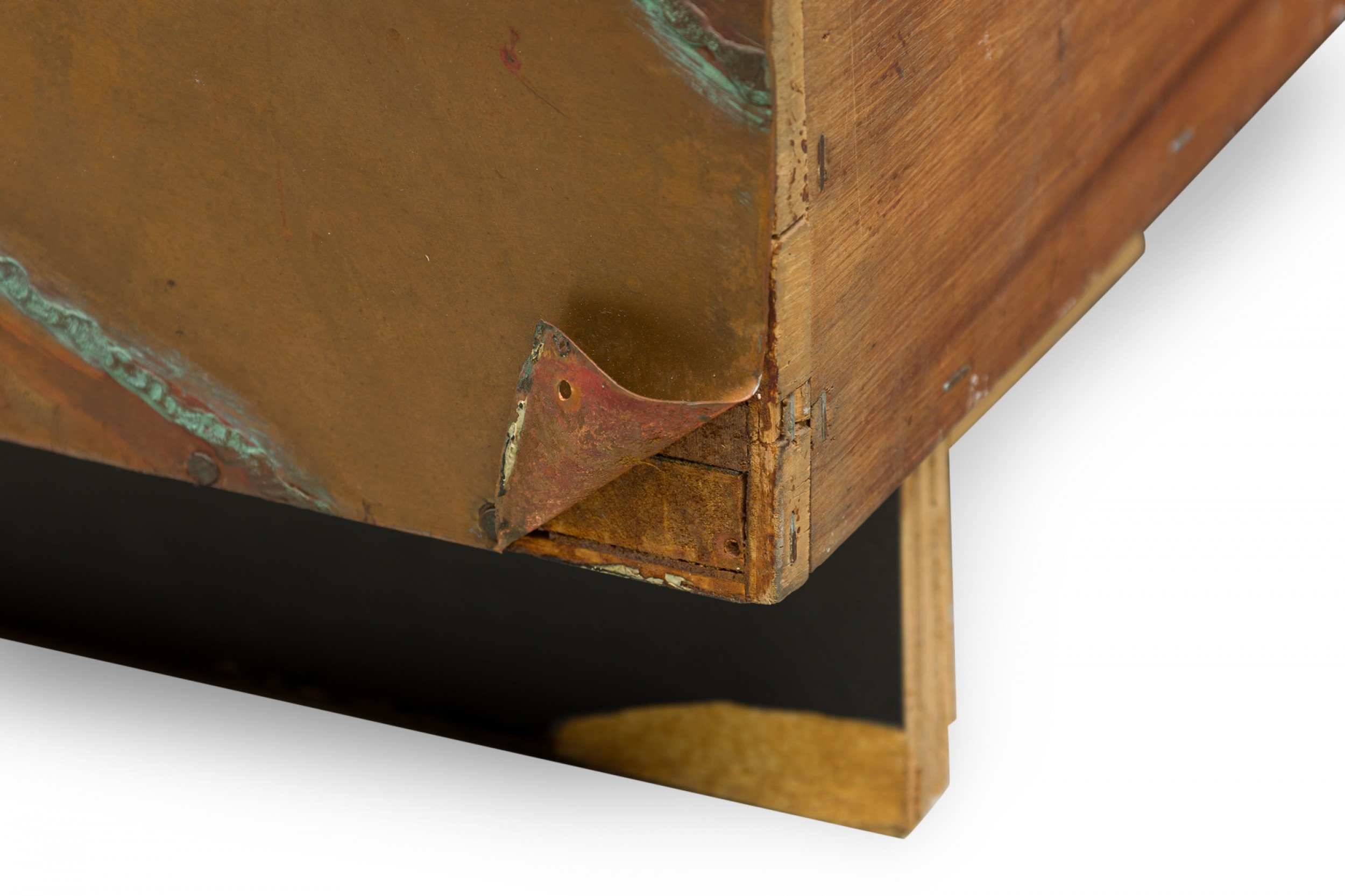 Style: Mid-Century Materials & Techniques: Copper, metal, veneer, wood Category: Dining Room Condition: Natural patina on copper veneer consistent with age. A hole has been drilled in the back of the cabinet. Good; Wear consistent with age and use