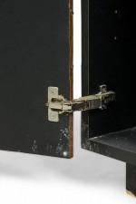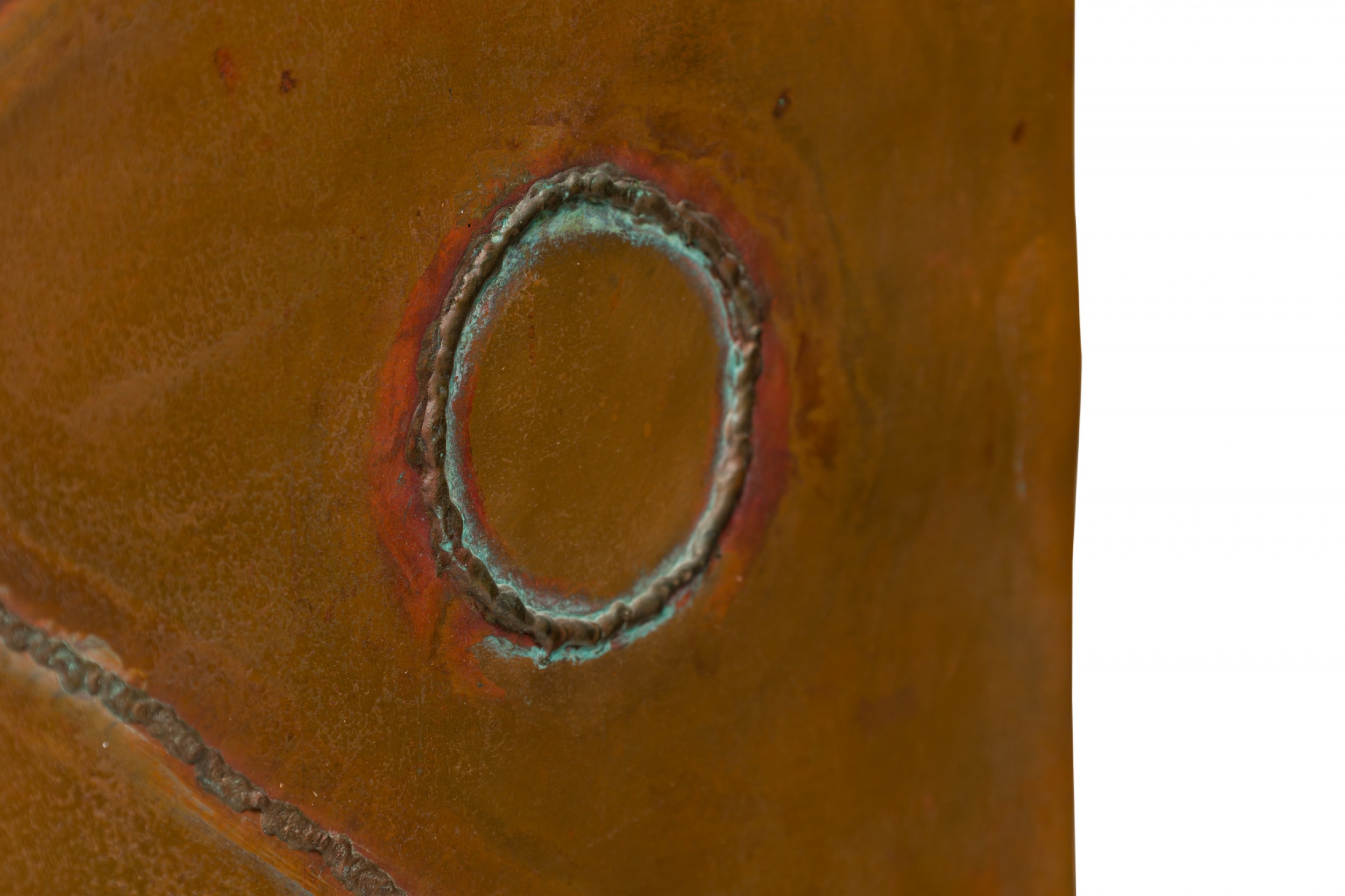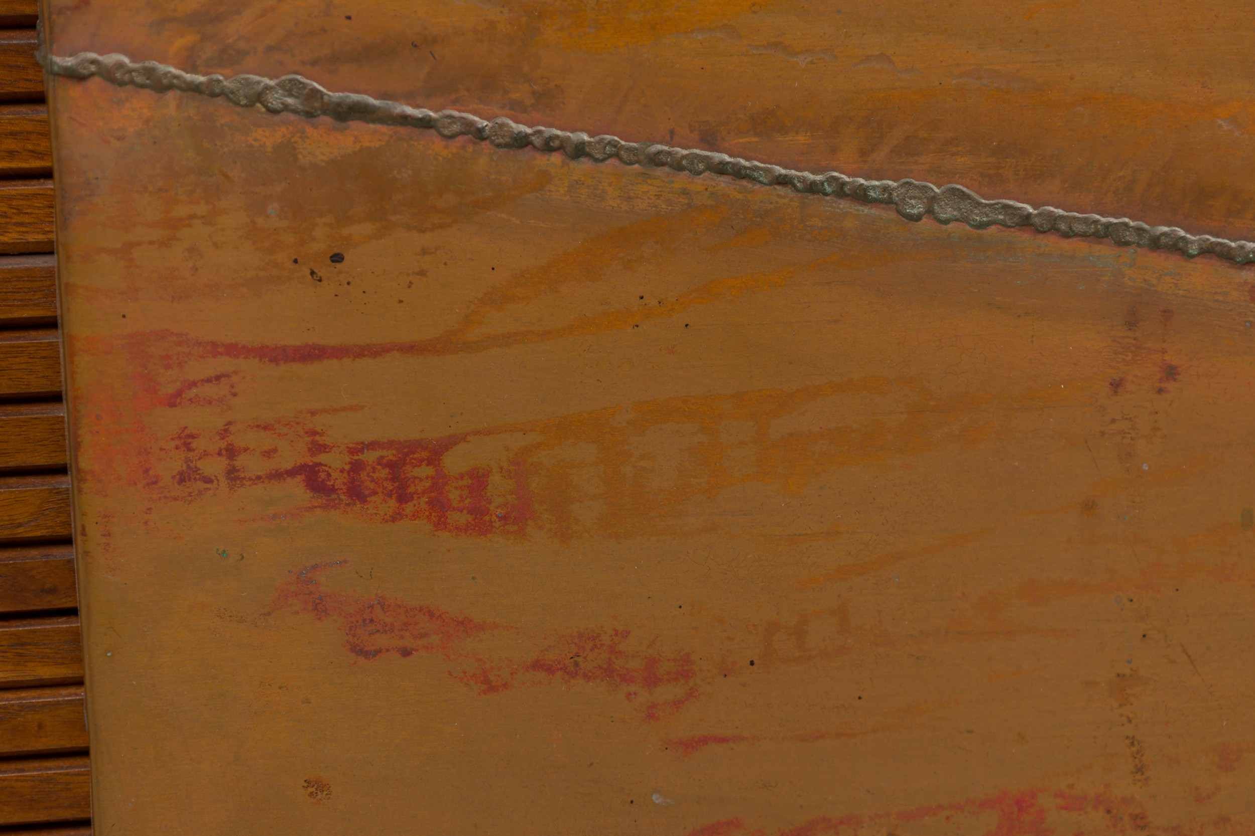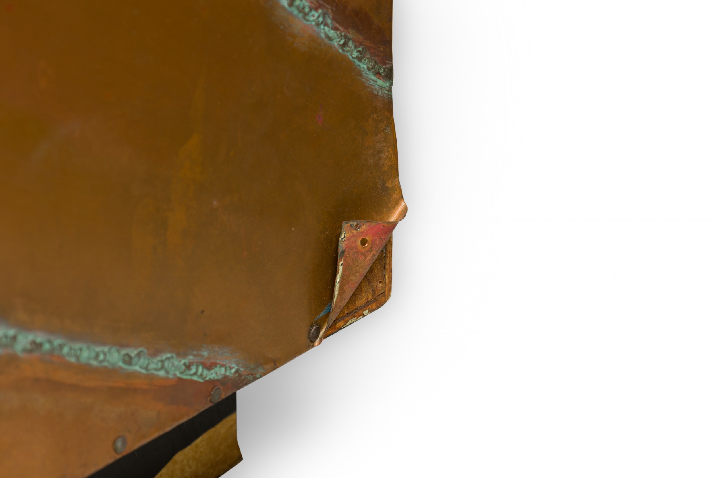 Style: Mid-Century Materials & Techniques: Copper, metal, veneer, wood Category: Dining Room Condition: Natural patina on copper veneer consistent with age. A hole has been drilled in the back of the cabinet. Good; Wear consistent with age and use