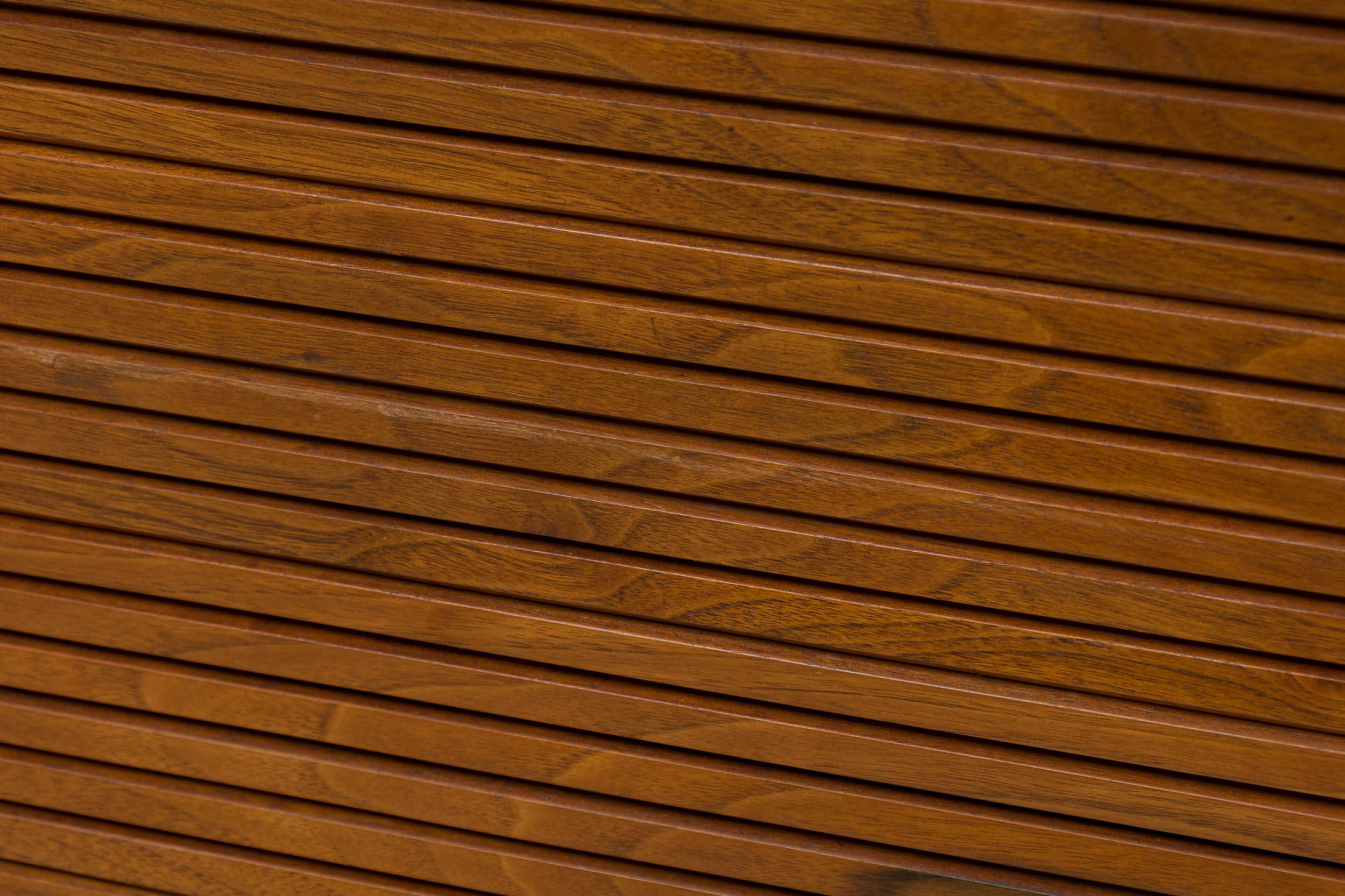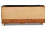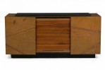 American Mid-Century sideboard / credenza with a copper veneer with welded seams, and cabinet doors on either side of a central roll door. (PAUL EVANS)