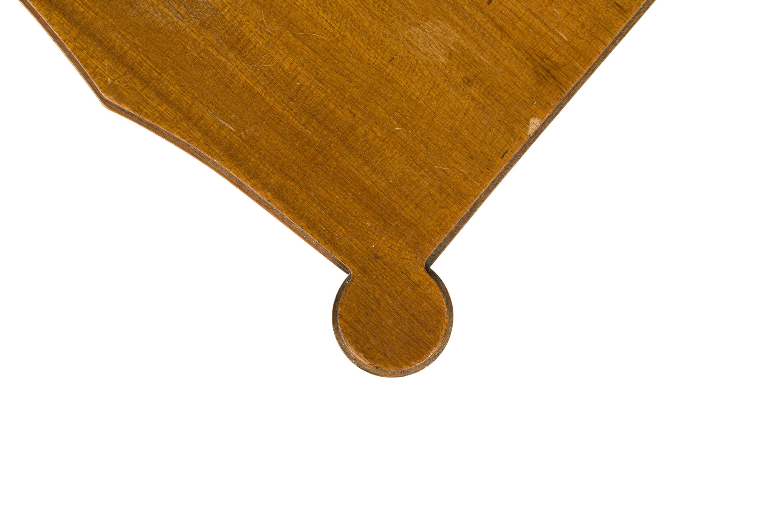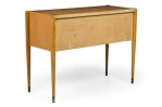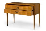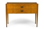Continental Mid-Century walnut contole table having two drawers with X-shaped brass drawer pulls, resting on four tapered round legs ending in brass sabots. (PAUL FRANKL)