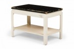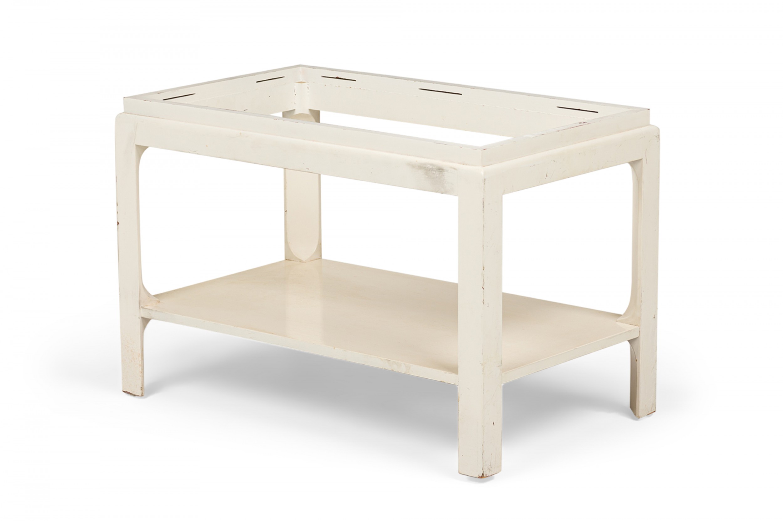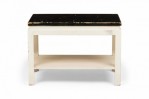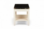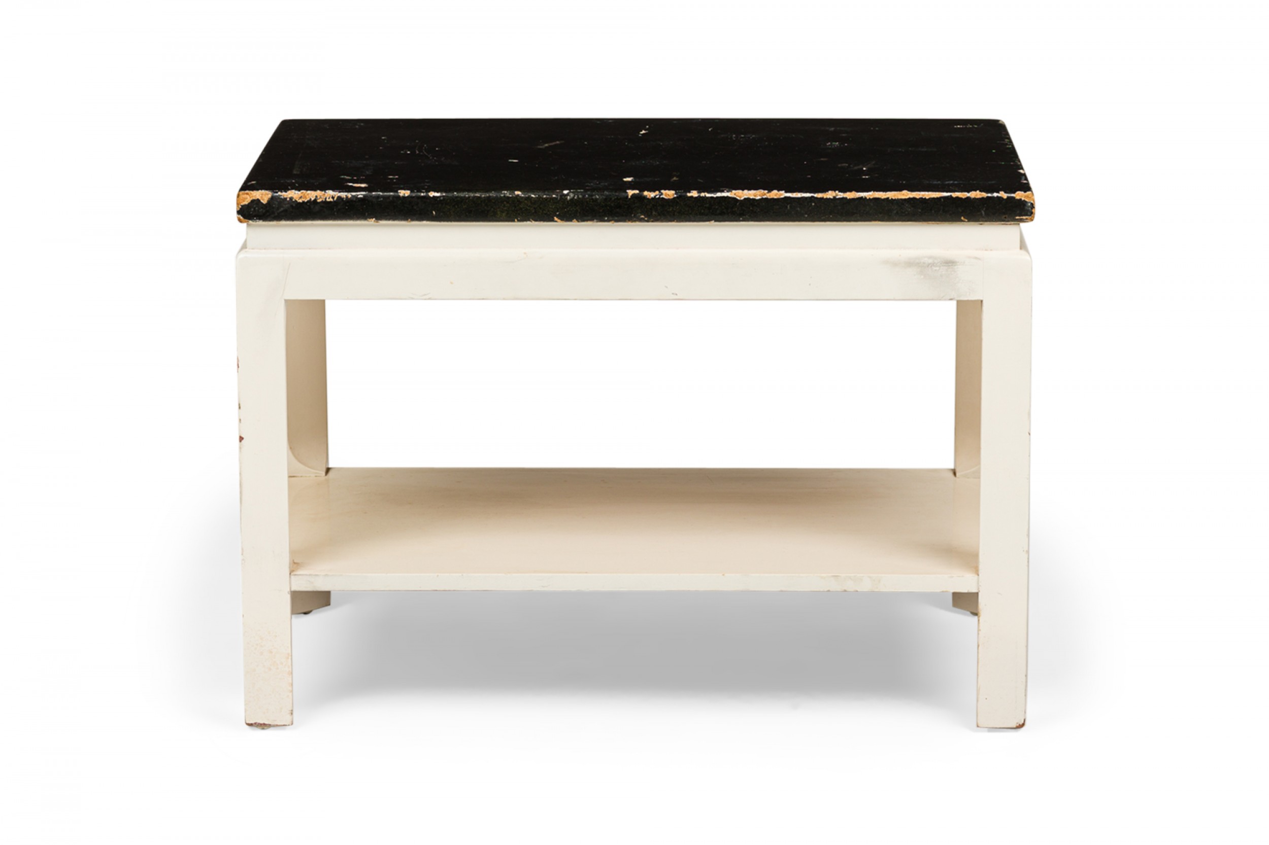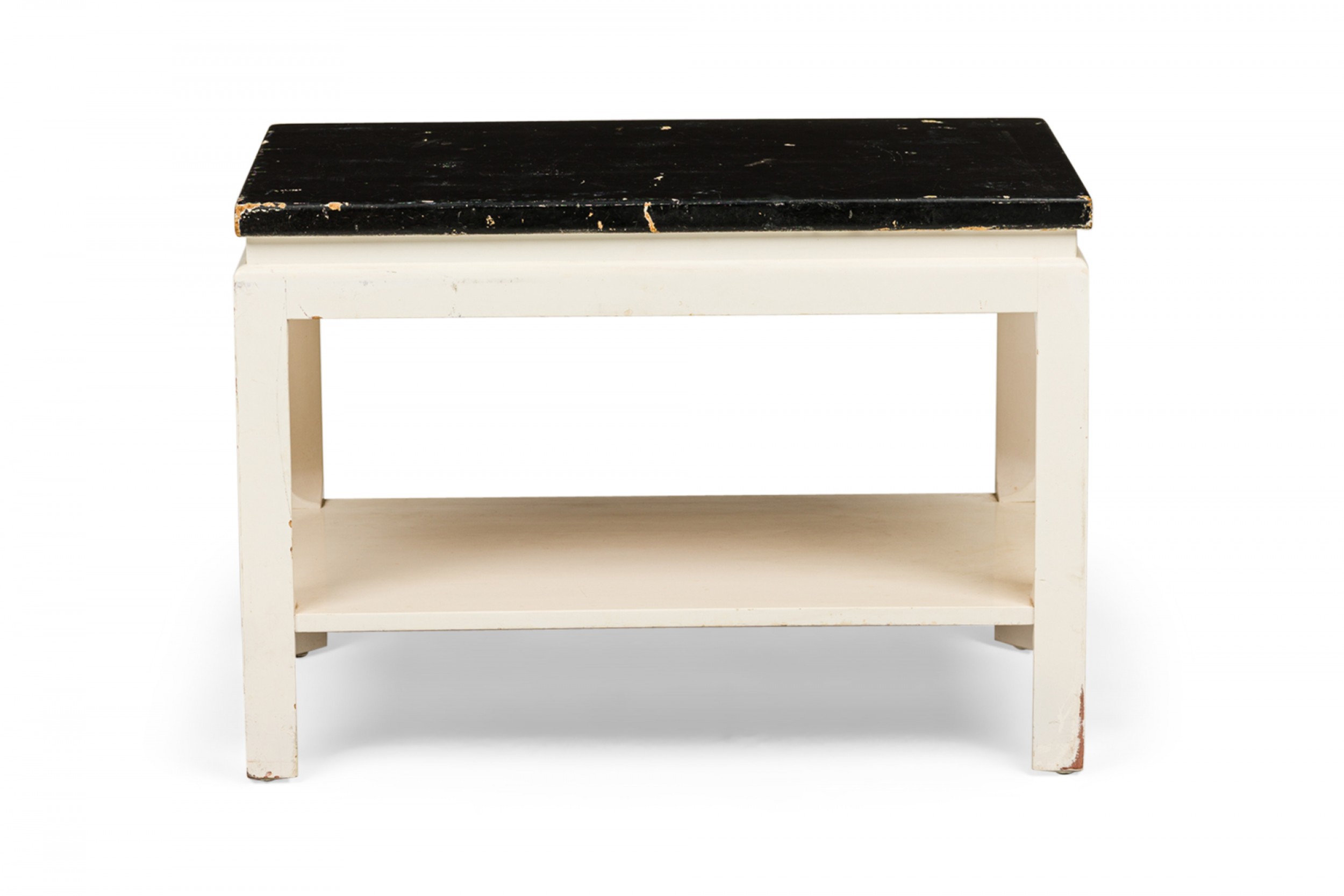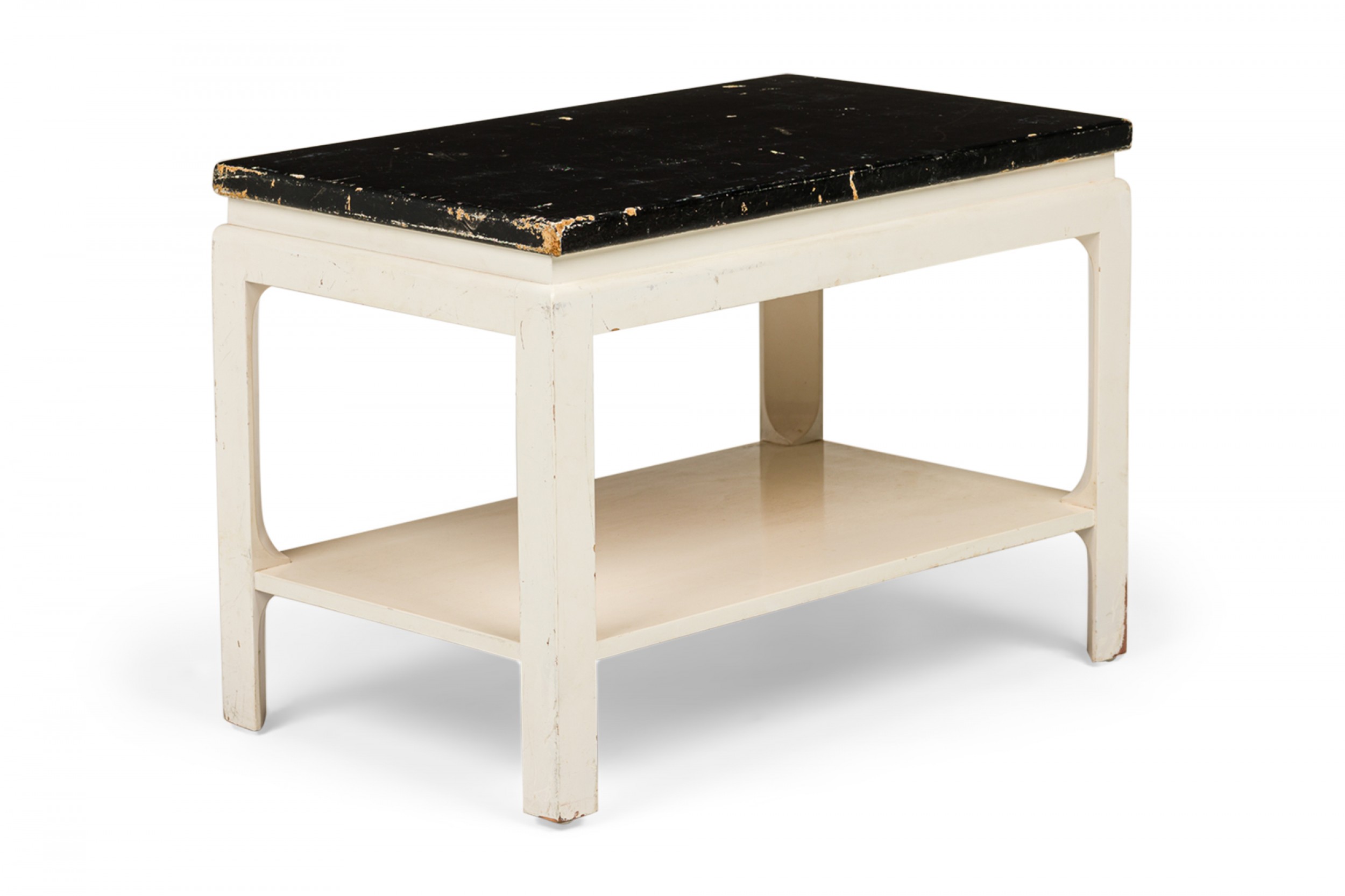 Mid-Century rectangular end / side table with a black painted cork top resting on a white painted wooden frame with a lower rectangular stretcher shelf and four square legs. (PAUL FRANKL FOR JOHNSON FURNITURE COMPANY)(Similar tables: DUF0726, DUF0741).