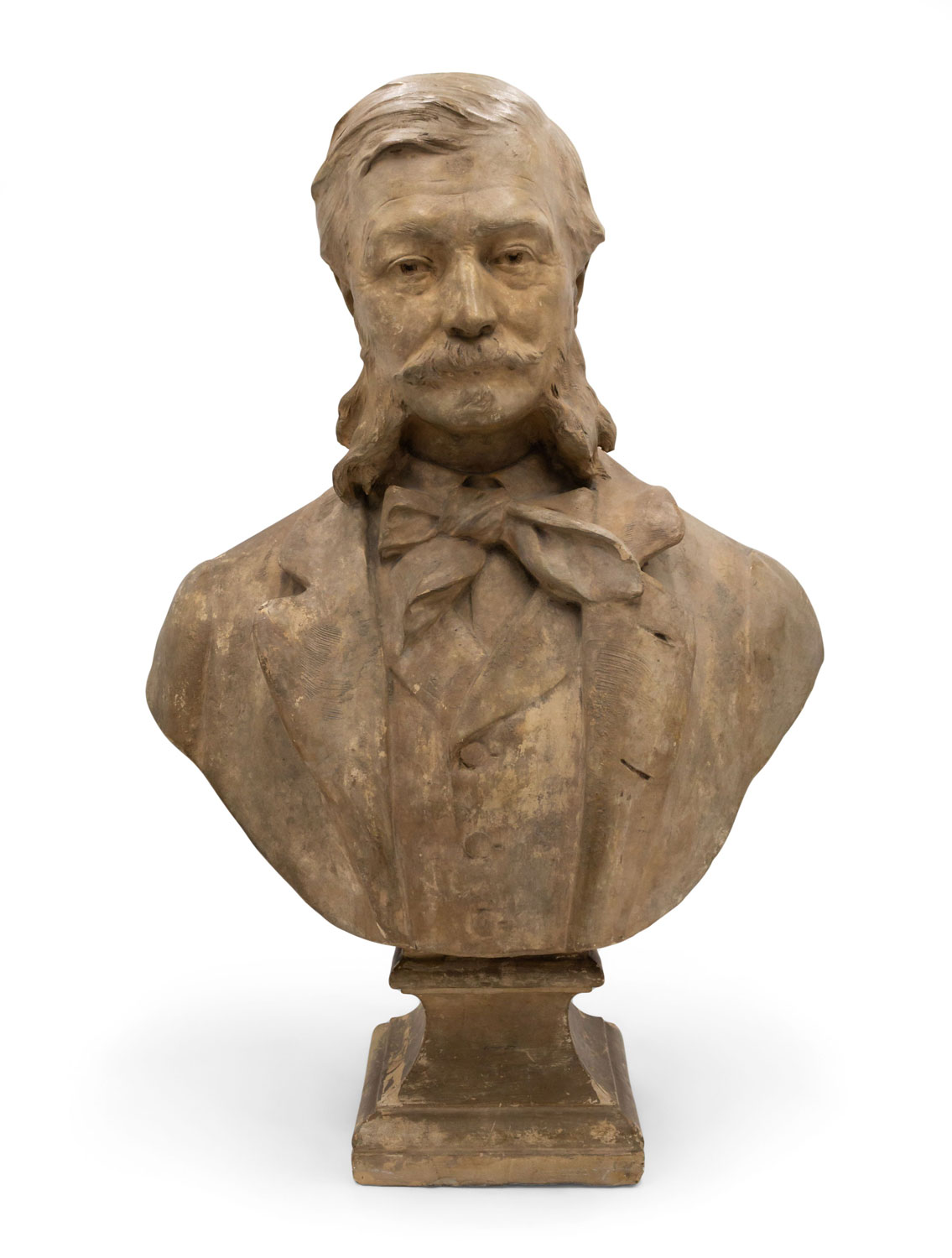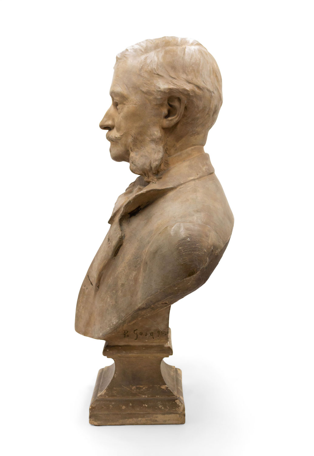 French Victorian terra-cotta bust of gentleman with large sideburns and mustache wearing a suite and bow tie supported on a square pedestal base (signed: P. GASQ 96)