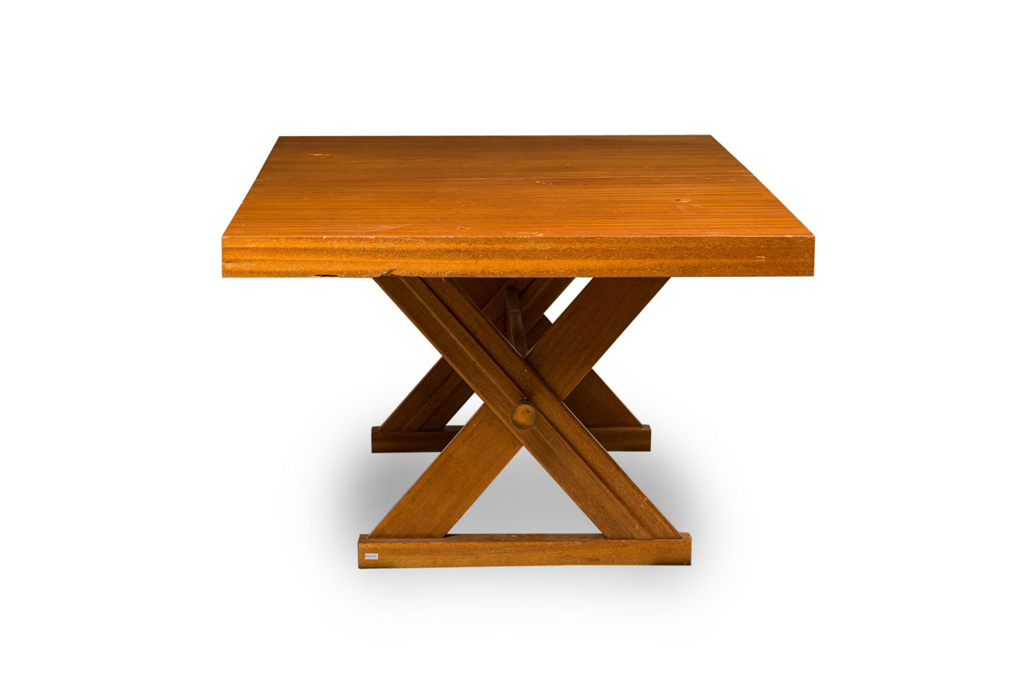 Mid-Century American light mahogany dining table including 2 rectangular leaves for the top, the base consisting of 2 beveled "X" supports anchored to a mid section horizontal stretcher. (labeled, PAUL LASZLO FOR BROWN-SALTMAN) (Companion chairs: set: REG4079, armchairs: REG4079A, side chairs: REG4079B).