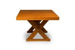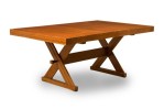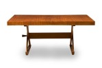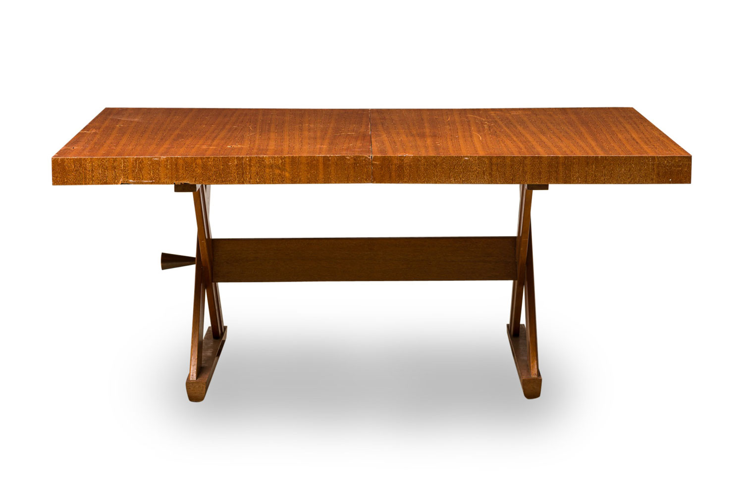 Mid-Century American light mahogany dining table including 2 rectangular leaves for the top, the base consisting of 2 beveled "X" supports anchored to a mid section horizontal stretcher. (labeled, PAUL LASZLO FOR BROWN-SALTMAN) (Companion chairs: set: REG4079, armchairs: REG4079A, side chairs: REG4079B)