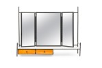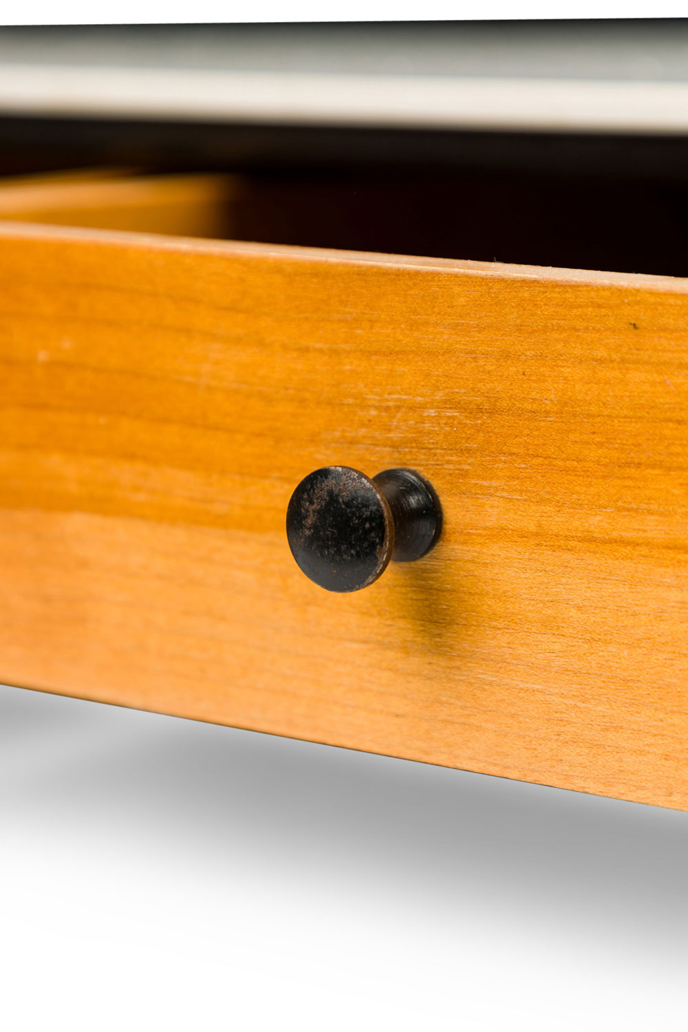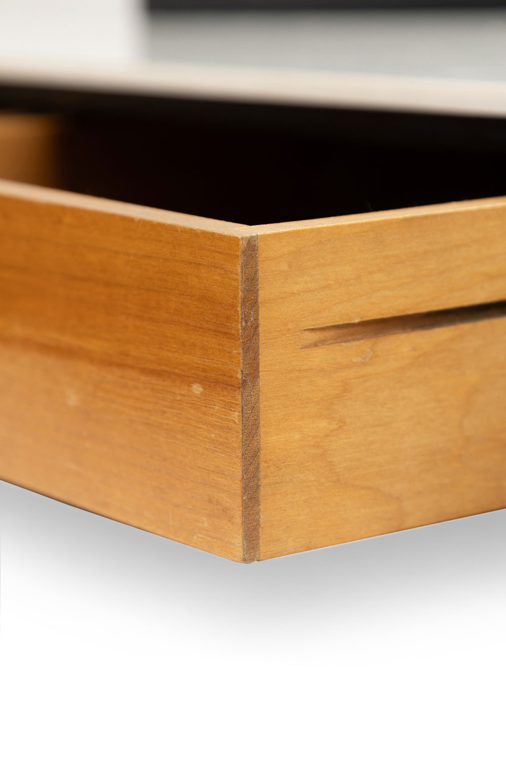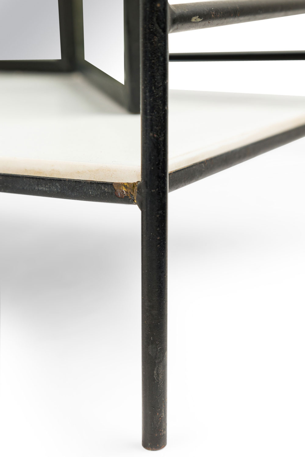 American Mid-Century Dresser Top Vanity Mirror with a metal frame holding a 3-way mirror resting on a white shelf over 2 drawers (PAUL MCCOBB FOR BRYCEE ORGINALS)