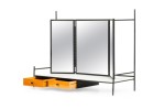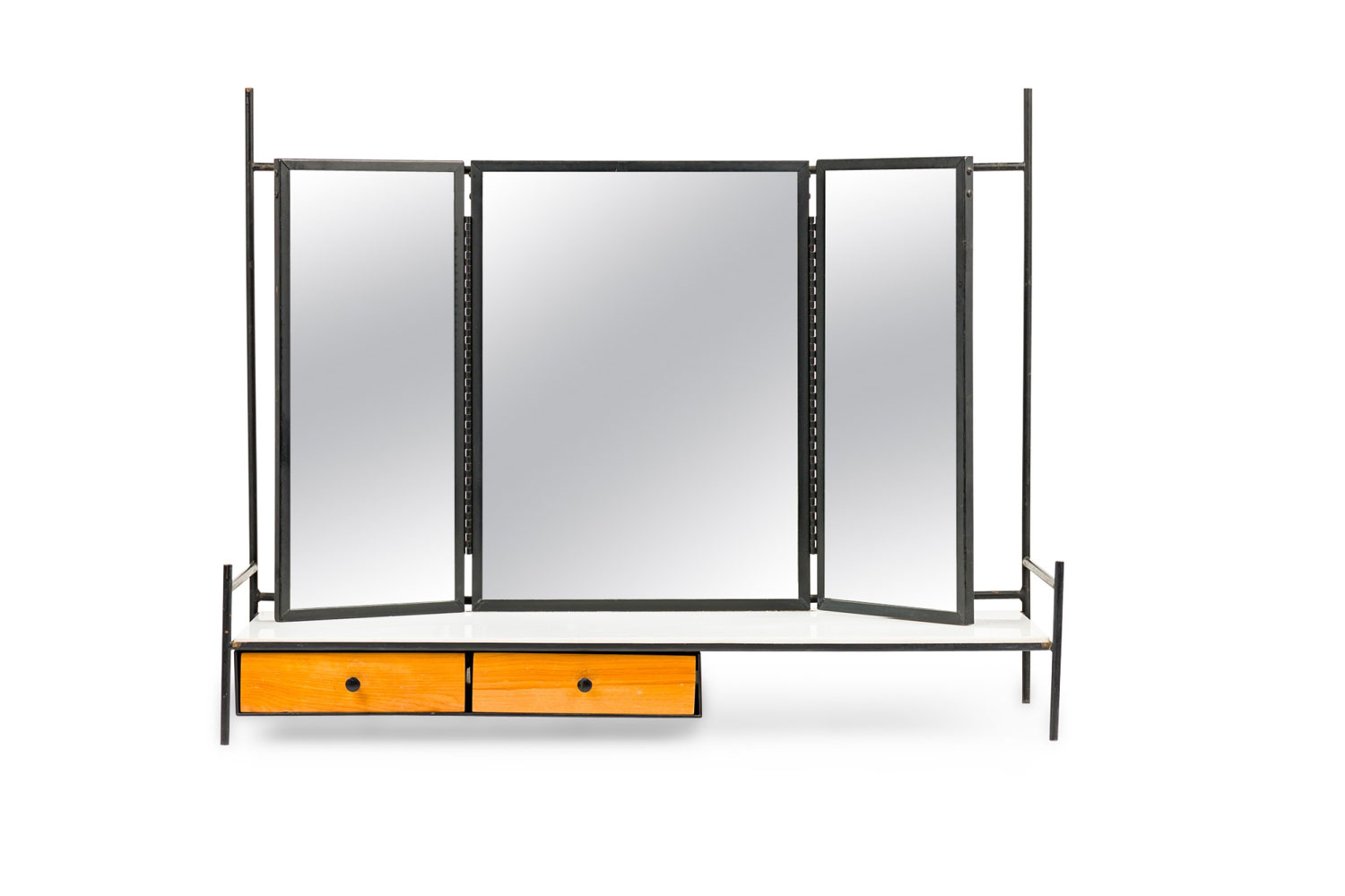 American Mid-Century Dresser Top Vanity Mirror with a metal frame holding a 3-way mirror resting on a white shelf over 2 drawers (PAUL MCCOBB FOR BRYCEE ORGINALS).