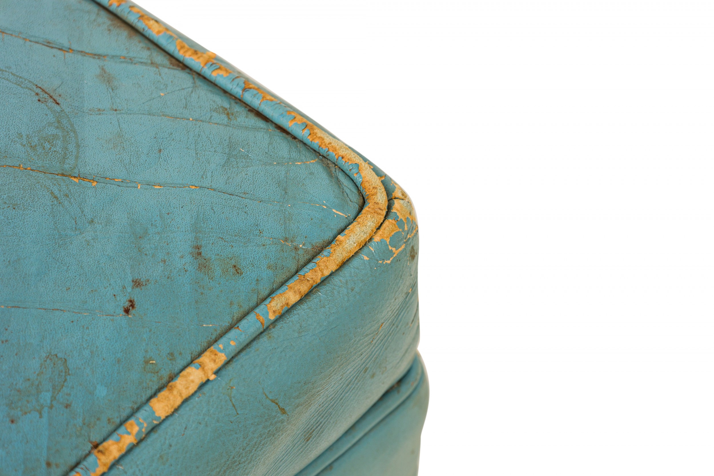 American Mid-Century rectangular ottoman with a blue leather upholstered seat resting on a walnut frame with tapered legs. (PAUL MCCOBB FOR DIRECTIONAL)