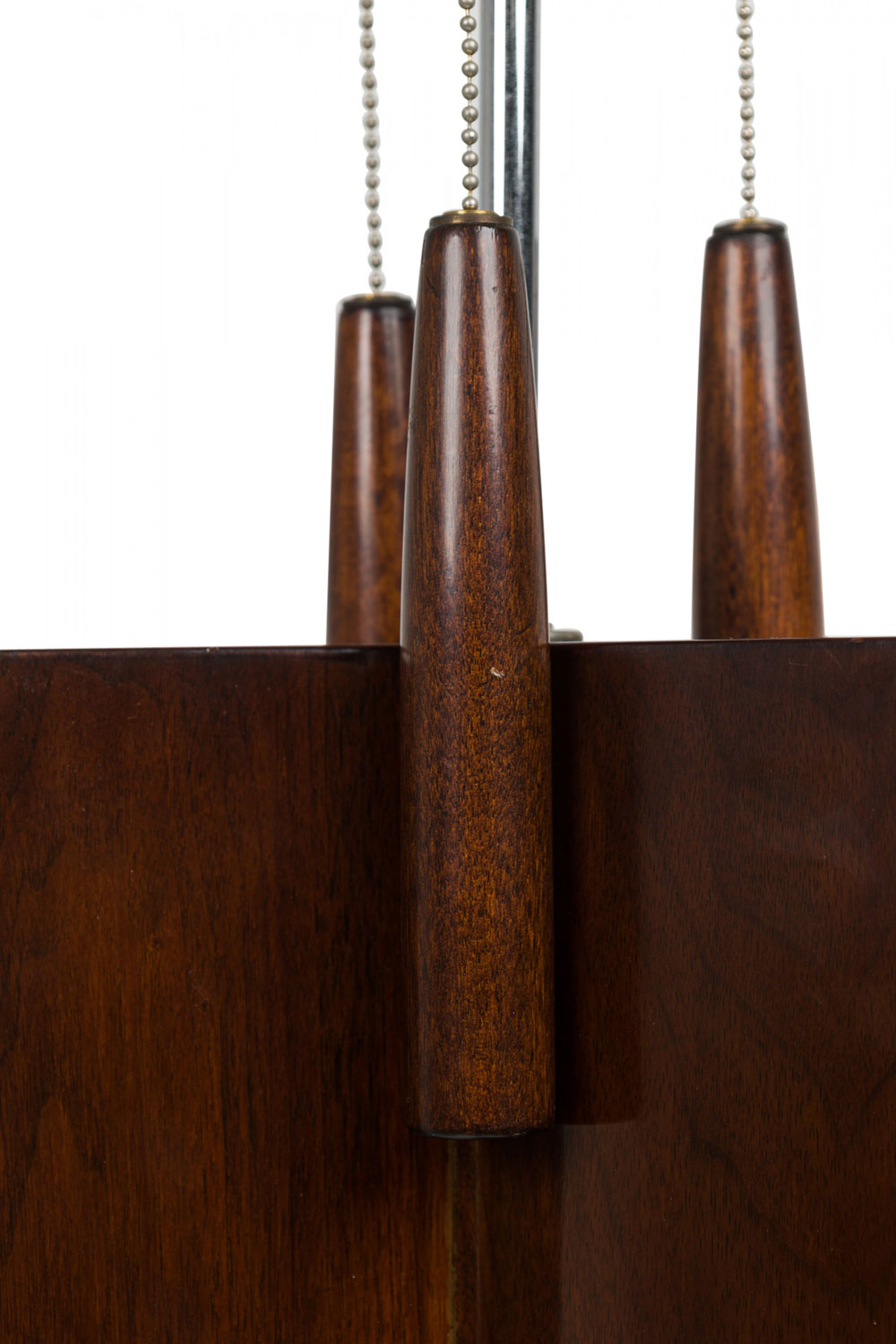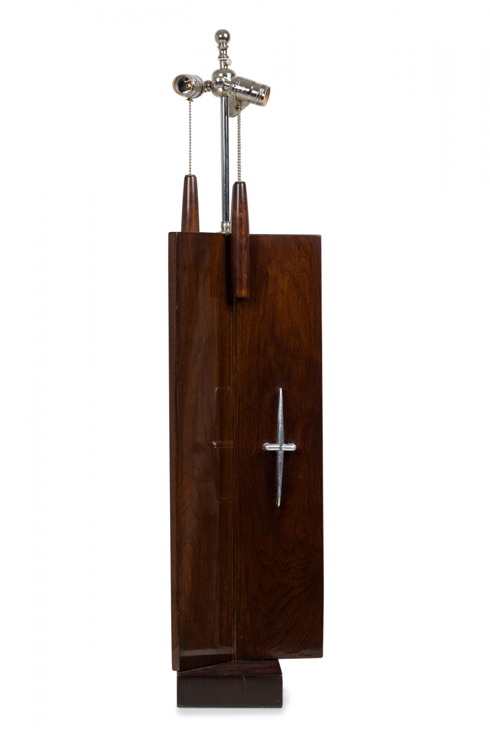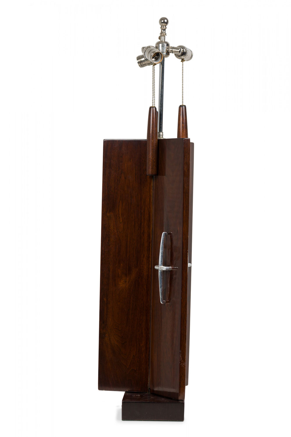 Mid-Century American (1950s) table lamp in triangular form from the Distinguished Designer Series featuring an extended silver metal stem plus three functioning light switch sockets and beaded tapered wood pulls, inlaid "Roulette" glazed ceramic tiles in their original red / orange hues, three applied decorative silver metal cross bars in a stylized shape, wood frame and base in a smooth dark veneer plus an intricately braided black wired plug. (PAUL MCCOBB FOR THE POMONA MANUFACTURING COMPANY)