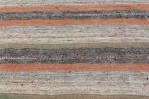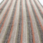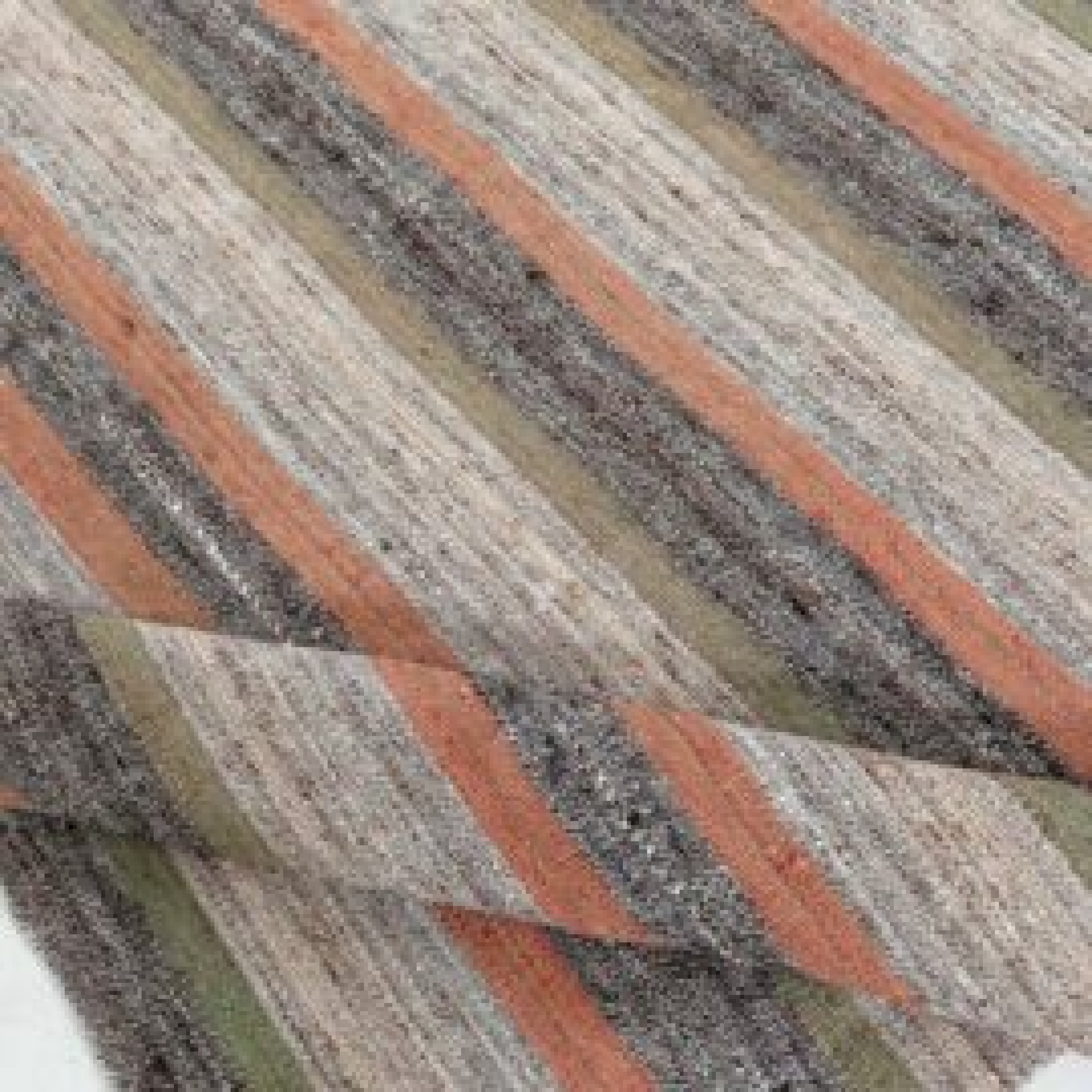 Persian hand woven wool rug featuring melange stripes of the colors brown, sage, beige, brick and ivory.