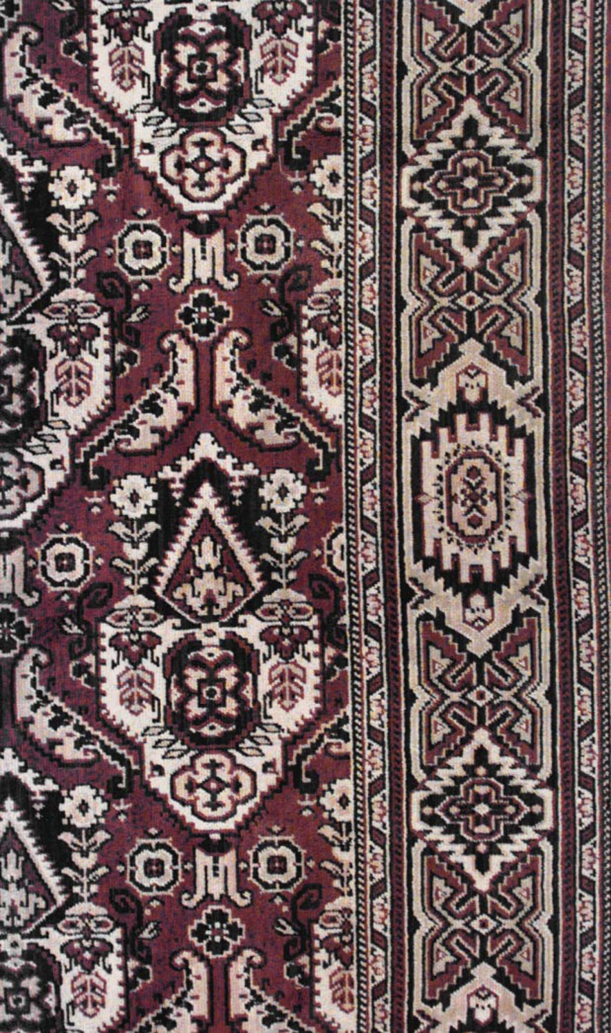 Persian brown and blue velvet table cover with border.