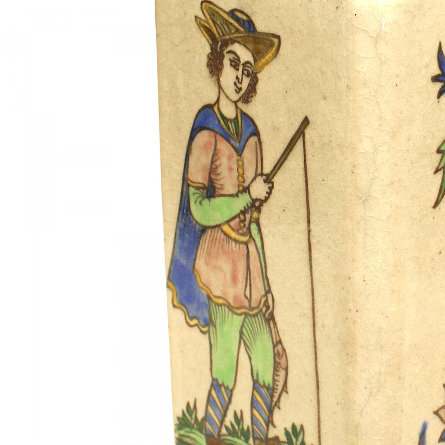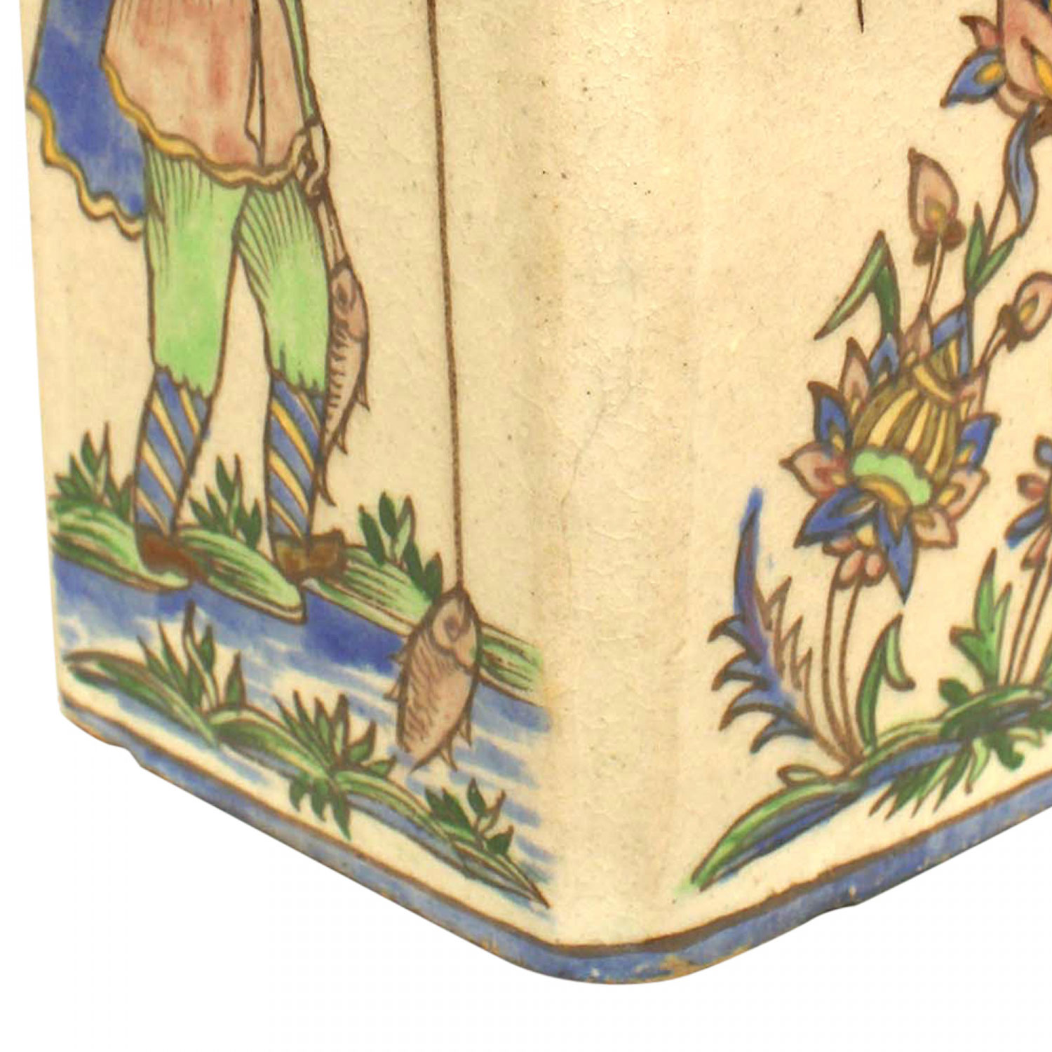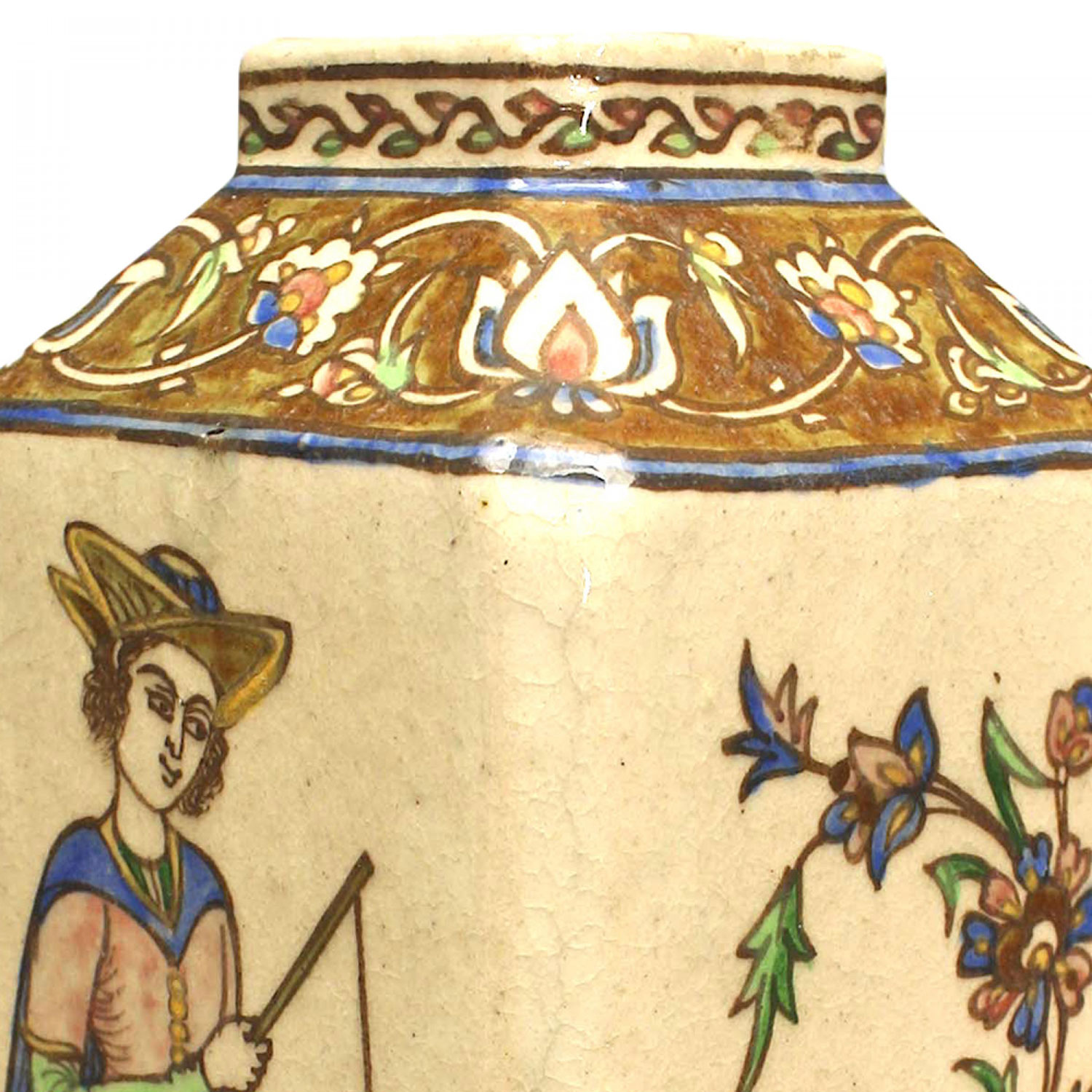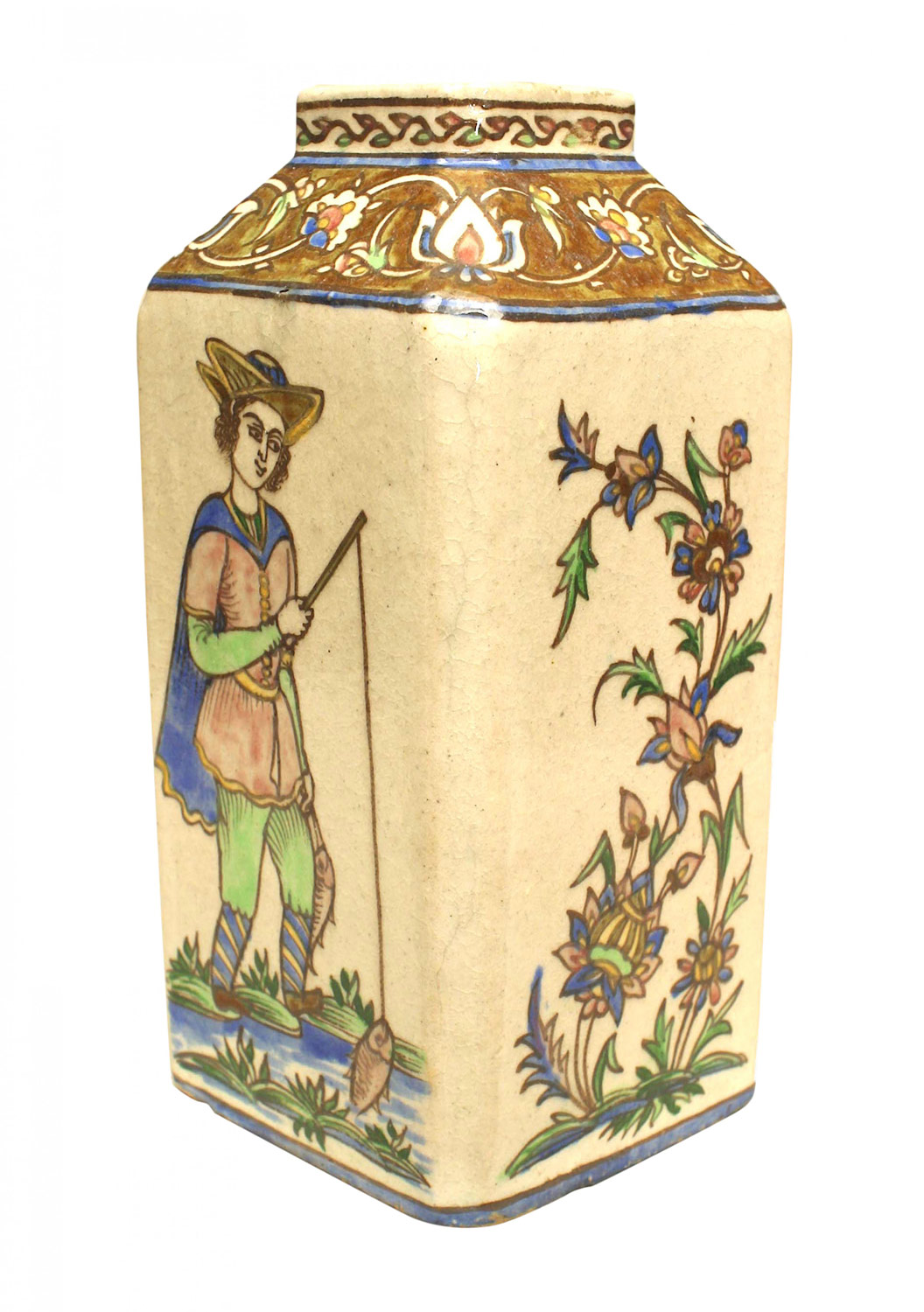 Middle Eastern Persian style (19/20th Cent) glazed earthenware square vase decorated with floral design with Persian figure of a man.
