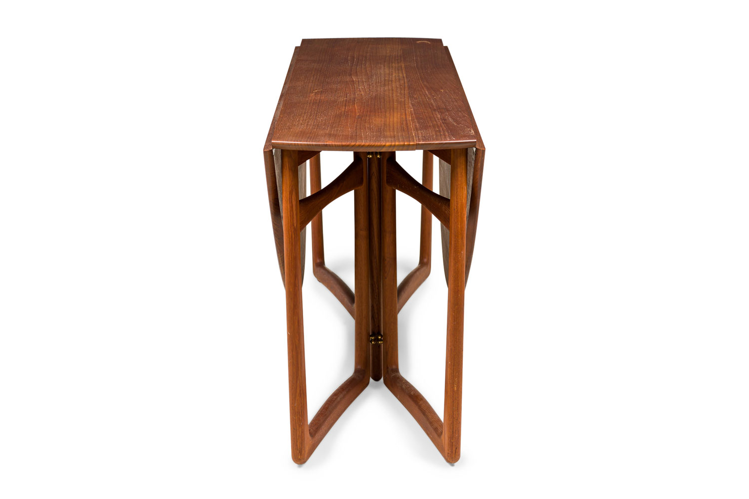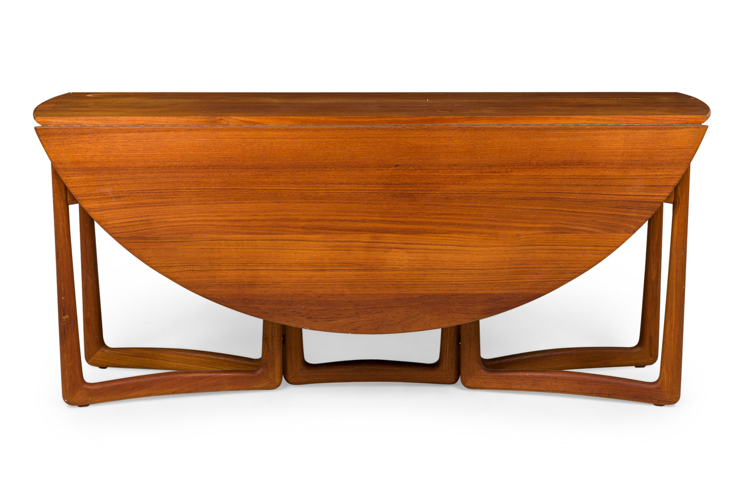Danish Mid-Century wooden console / dining table with a rectangular console profile when closed, with two demilune drop leaves supported by four gate legs to create a circular dining table when open. (PETER HVIDT)