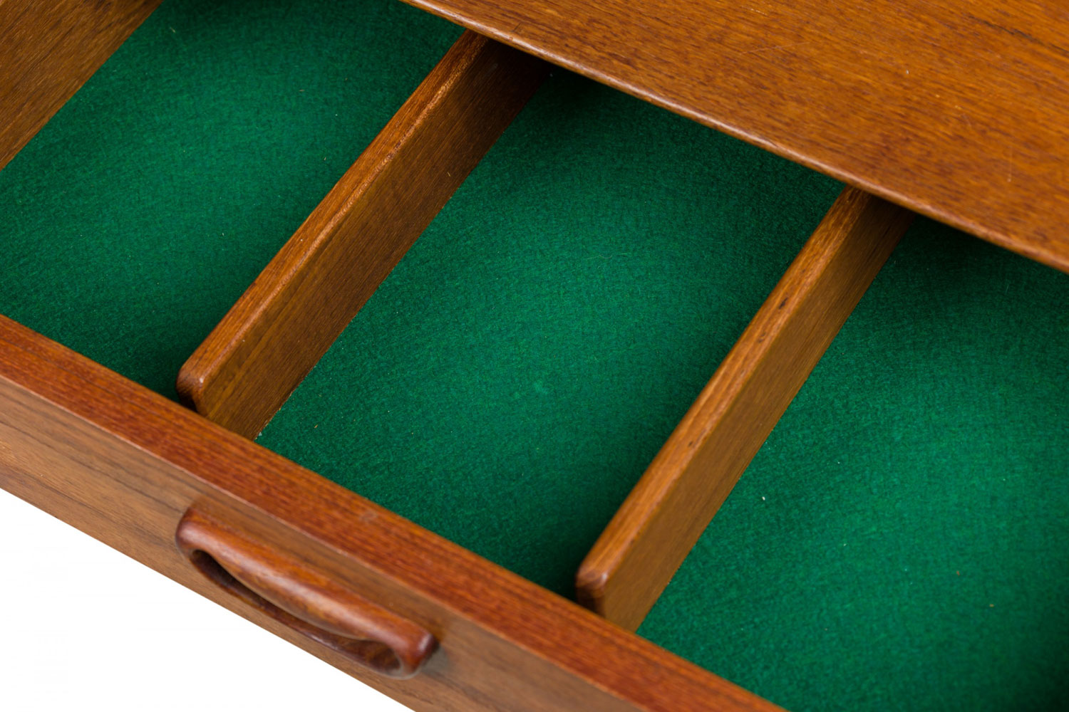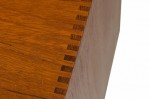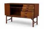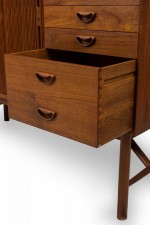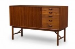 Mid-Century Danish teak cabinet with 4 pullout drawers, sculpted pulls and sliding tambour door revealing a two-shelf compartment. (PETER HVIDT FOR SØBORG MØBLER).