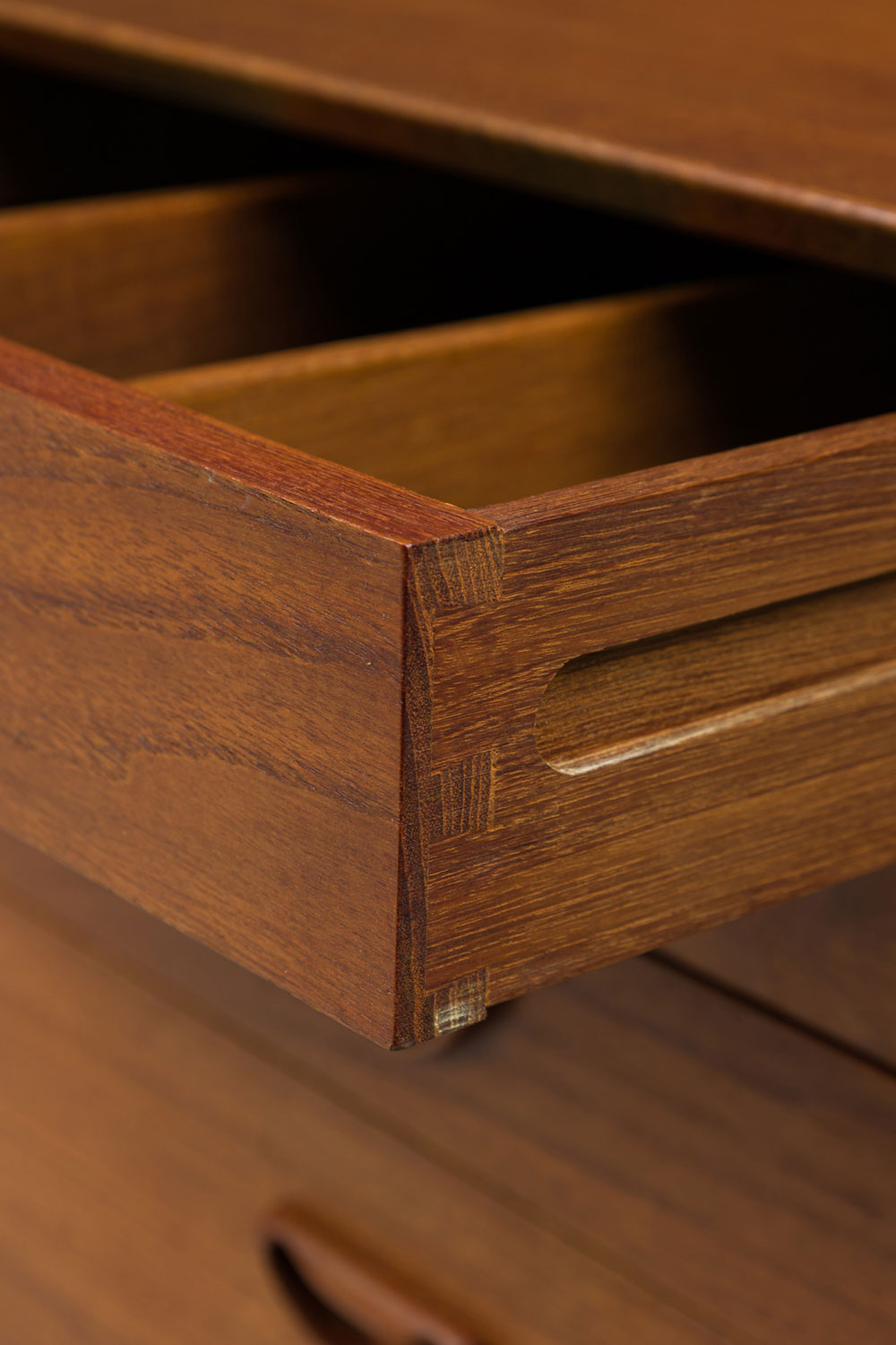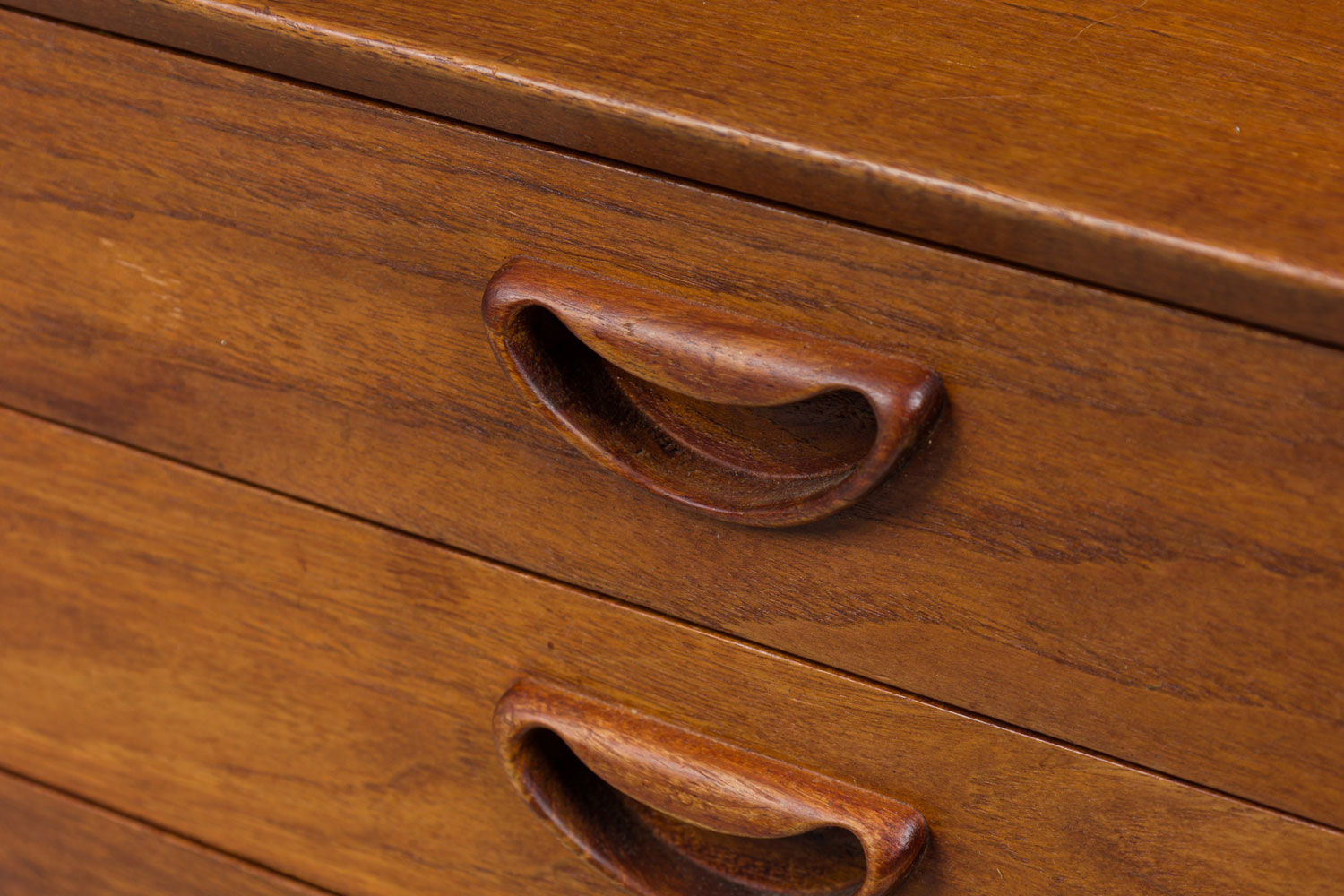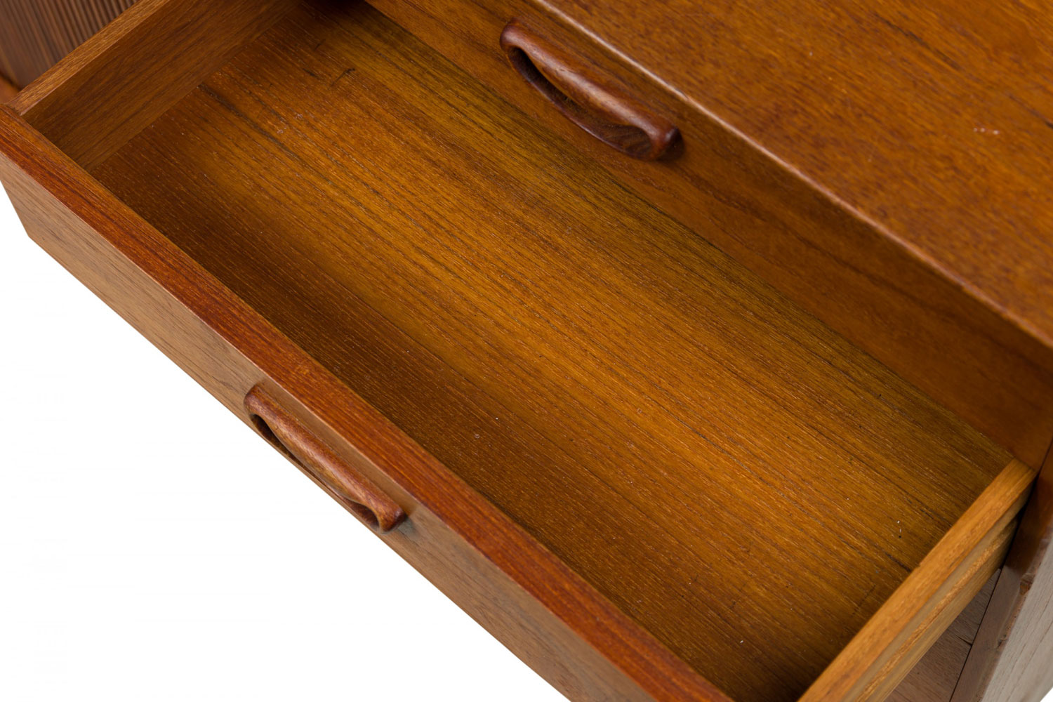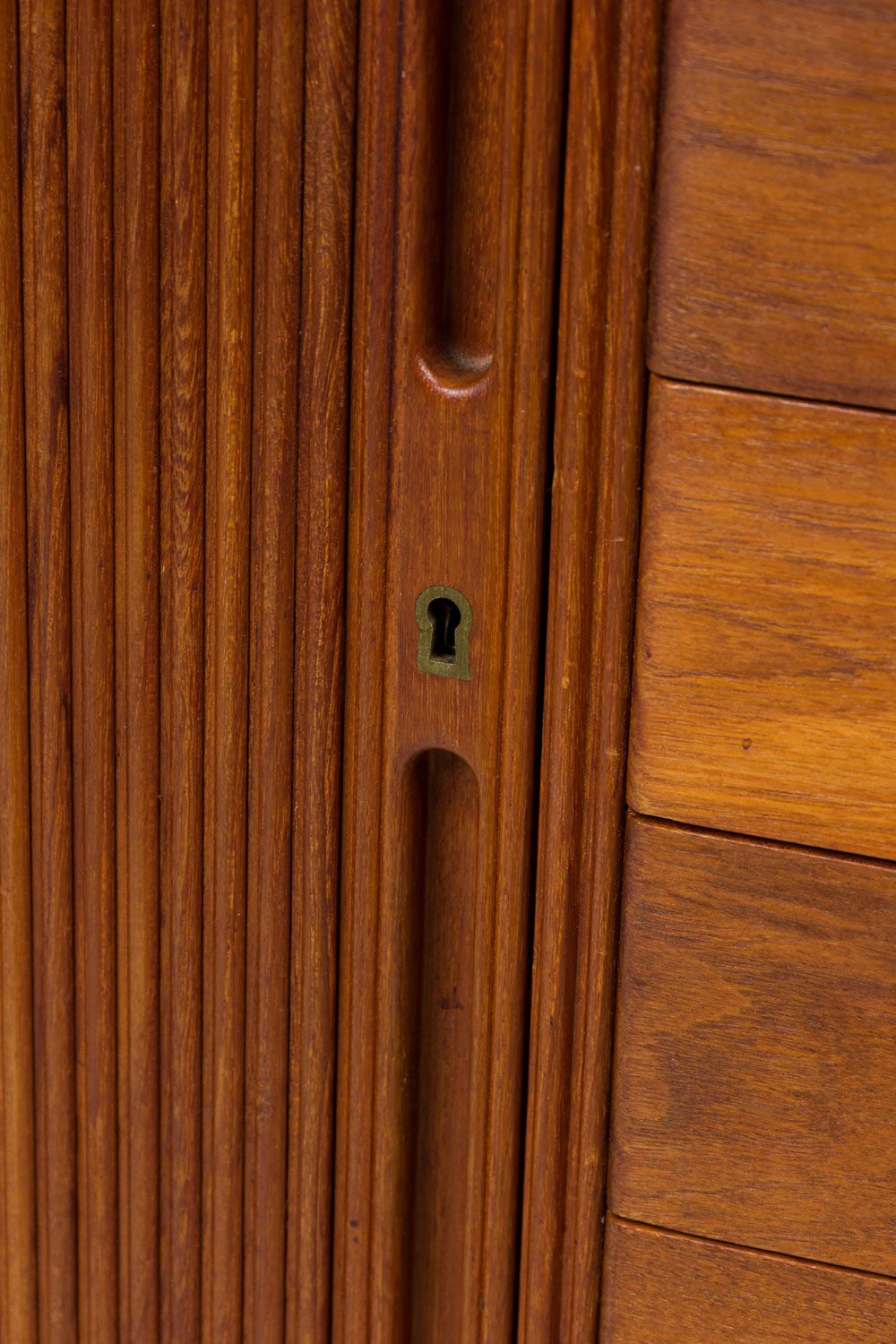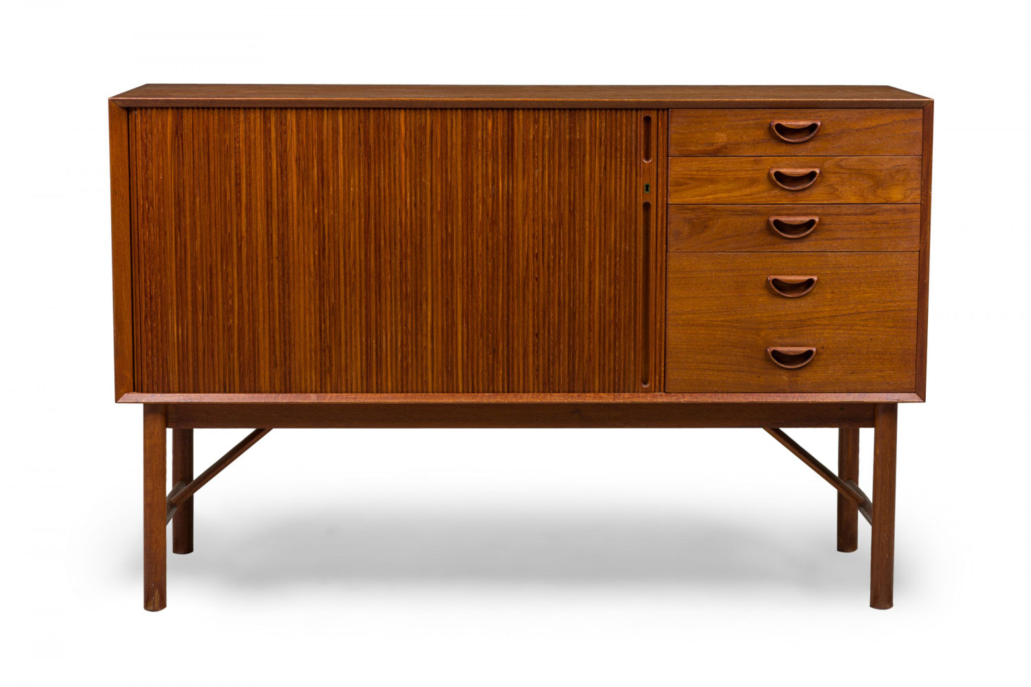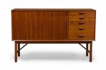 Mid-Century Danish teak cabinet with 4 pullout drawers, sculpted pulls and sliding tambour door revealing a two-shelf compartment. (PETER HVIDT FOR SØBORG MØBLER)