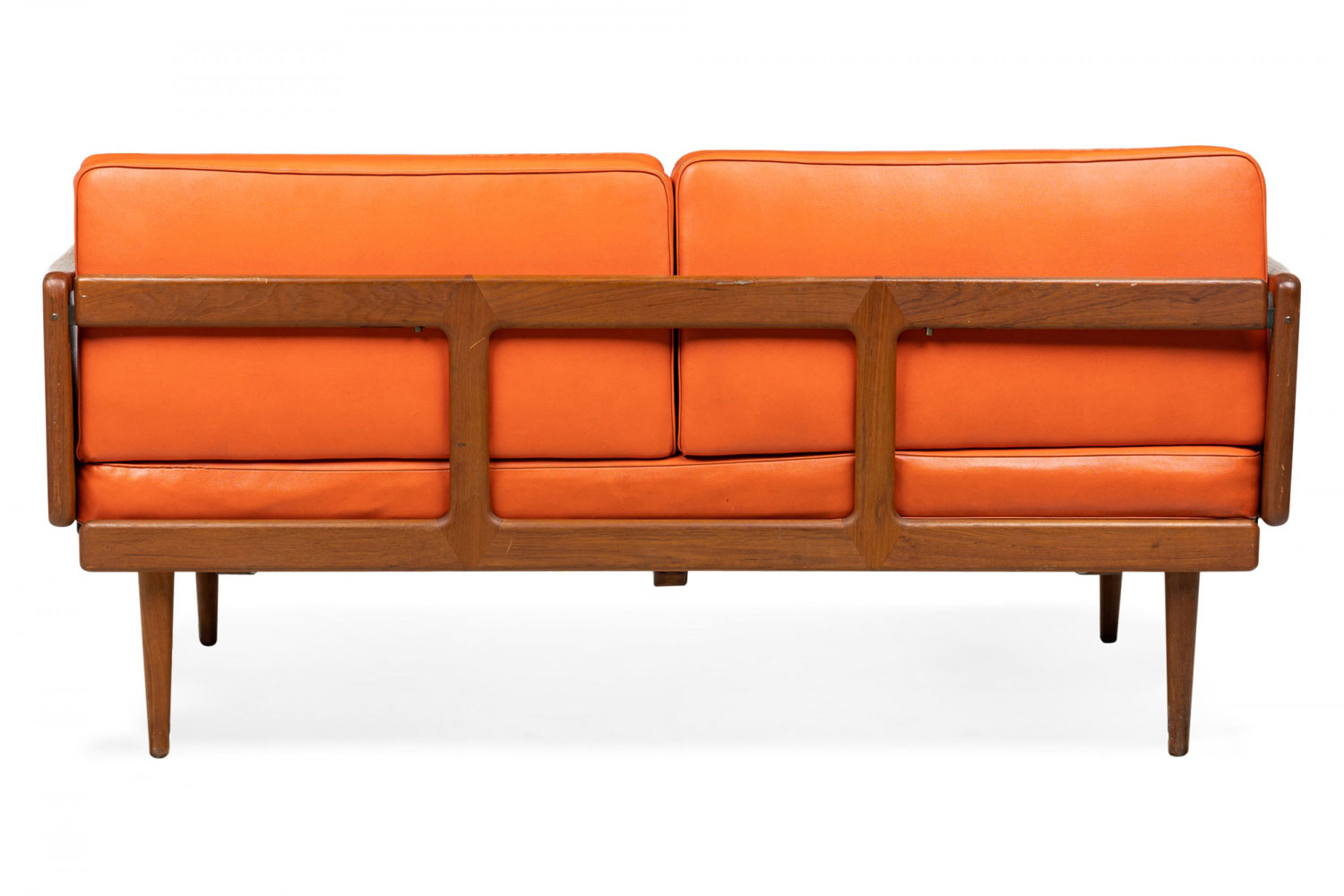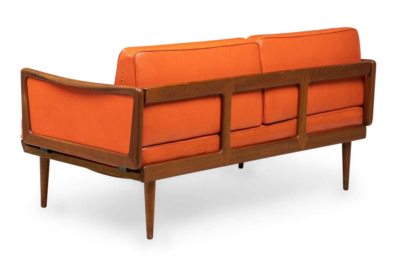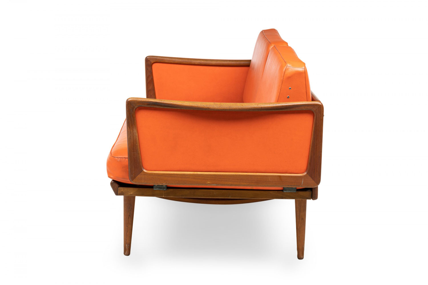 Mid-Century Danish expandable drop arm sleeper settee with a teak wood frame with 3 wedge-shaped removable orange vinyl cushions, foldable hinged arms that open to create an extended sleeping space accommodated by moving the back cushions. (PETER HVIDT) (Similar piece: DUF0631)