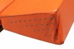 Mid-Century Danish expandable drop arm sleeper settee with a teak wood frame with 3 wedge-shaped removable orange vinyl cushions, foldable hinged arms that open to create an extended sleeping space accommodated by moving the back cushions. (PETER HVIDT) (Similar piece: DUF0631).