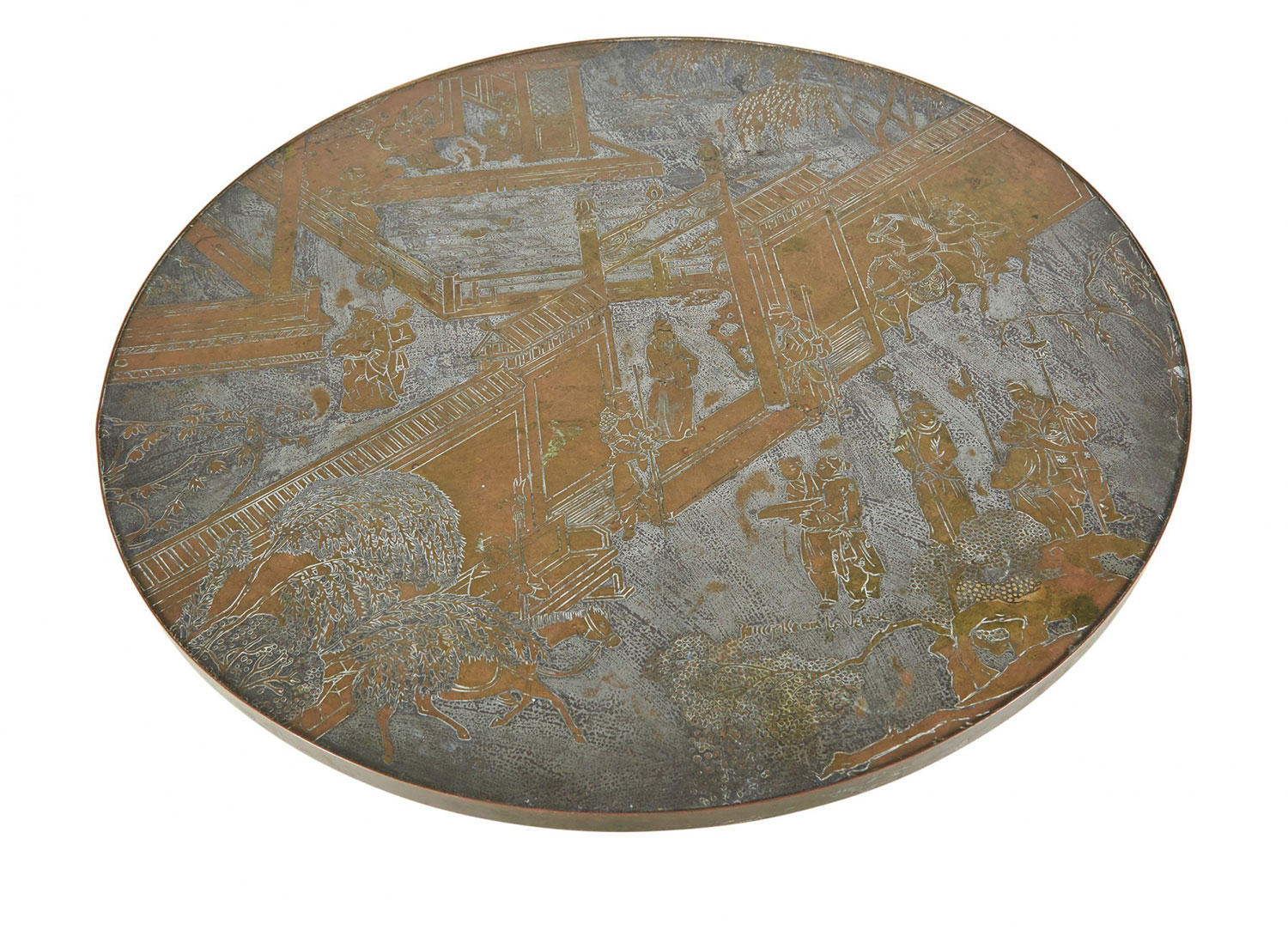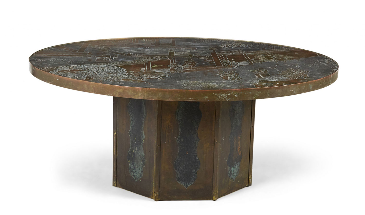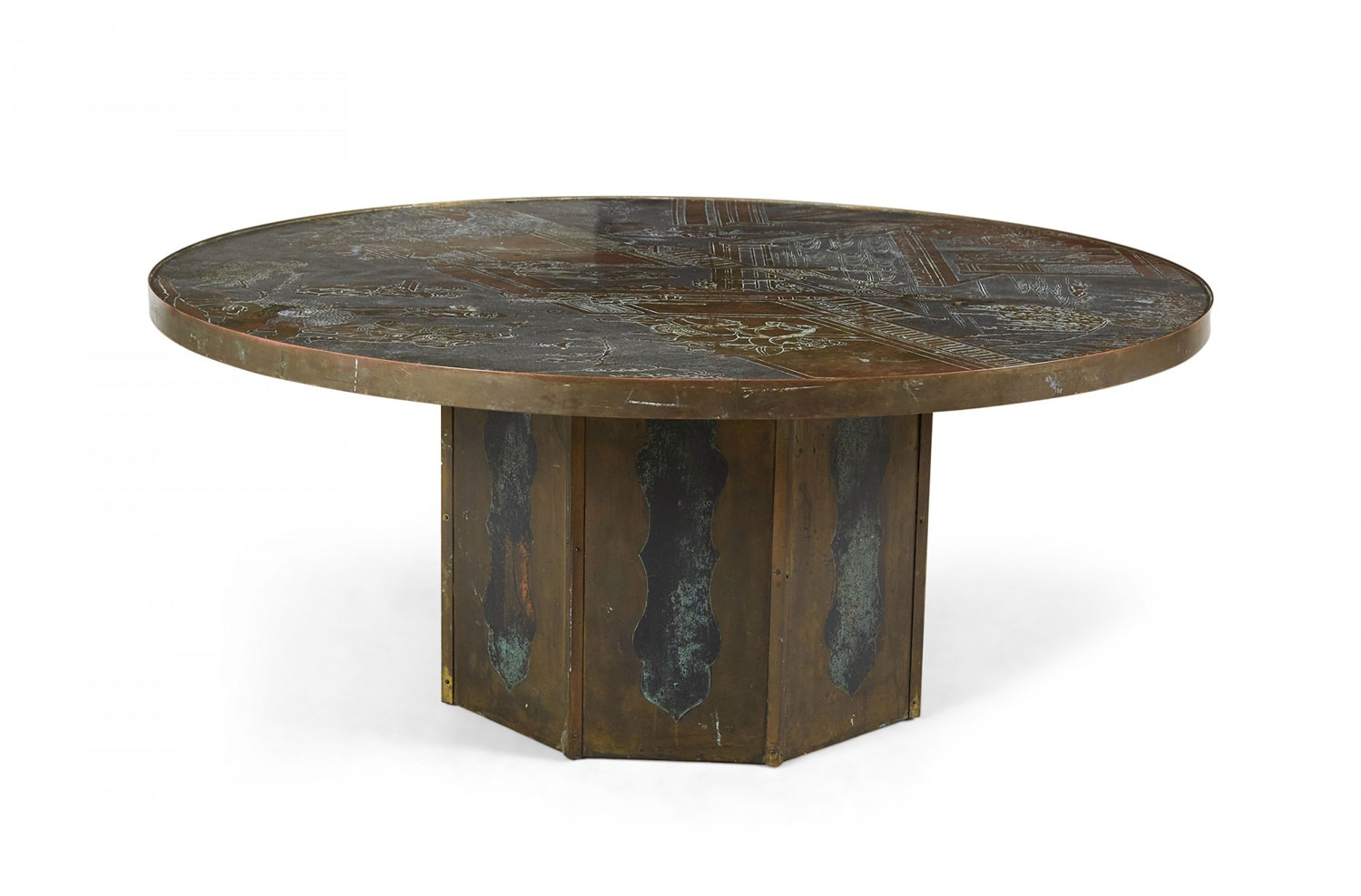 American Mid-Century coffee table with a circular / round etched bronze veneer top depicting an elaborate Chinoiserie genre scene with natural patina above a bronze veneer octagonal base. ("Chan," PHILLIP & KELVIN LAVERNE)(Similar table: NWL6542).