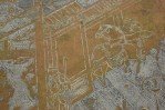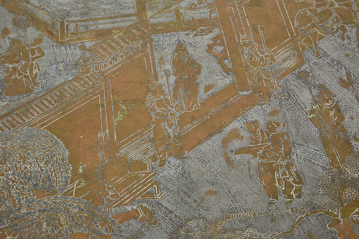 American Mid-Century coffee table with a circular / round etched bronze veneer top depicting an elaborate Chinoiserie genre scene with natural patina above a bronze veneer octagonal base. ("Chan," PHILLIP & KELVIN LAVERNE)(Similar table: NWL6542)
