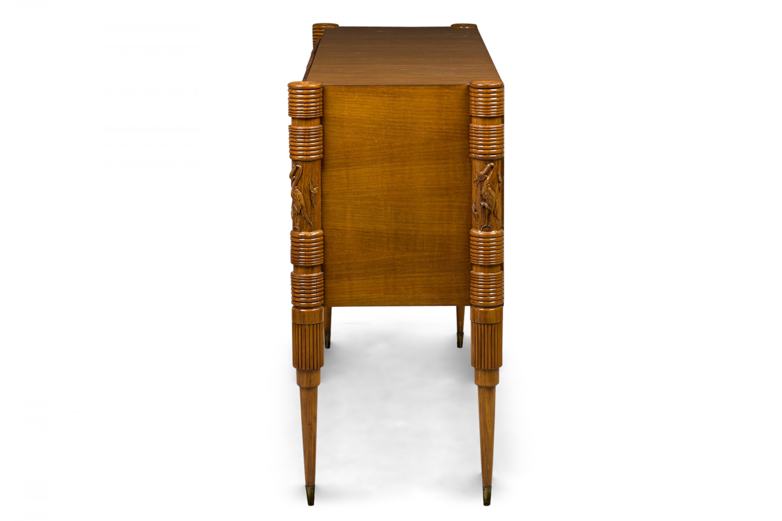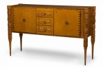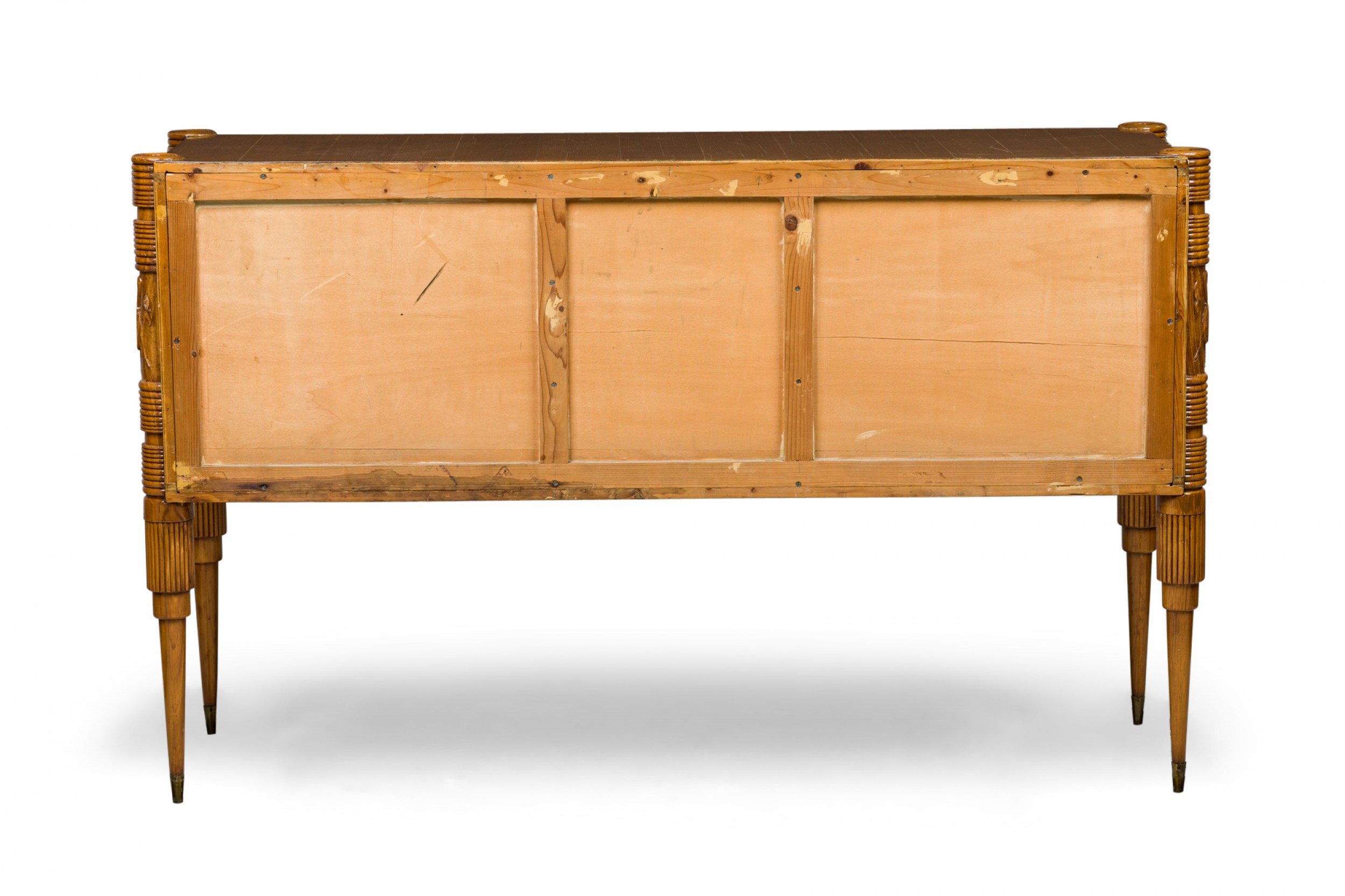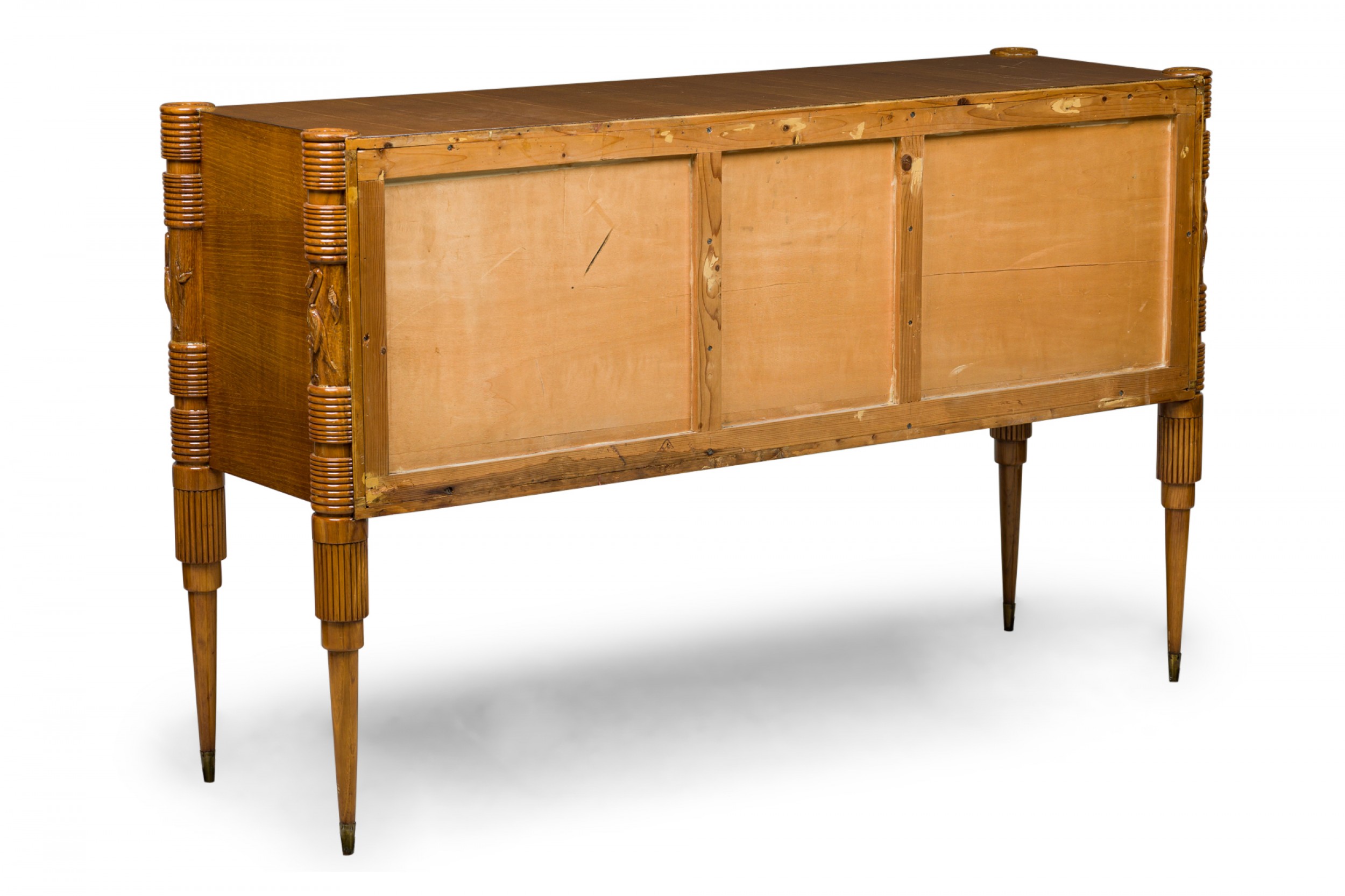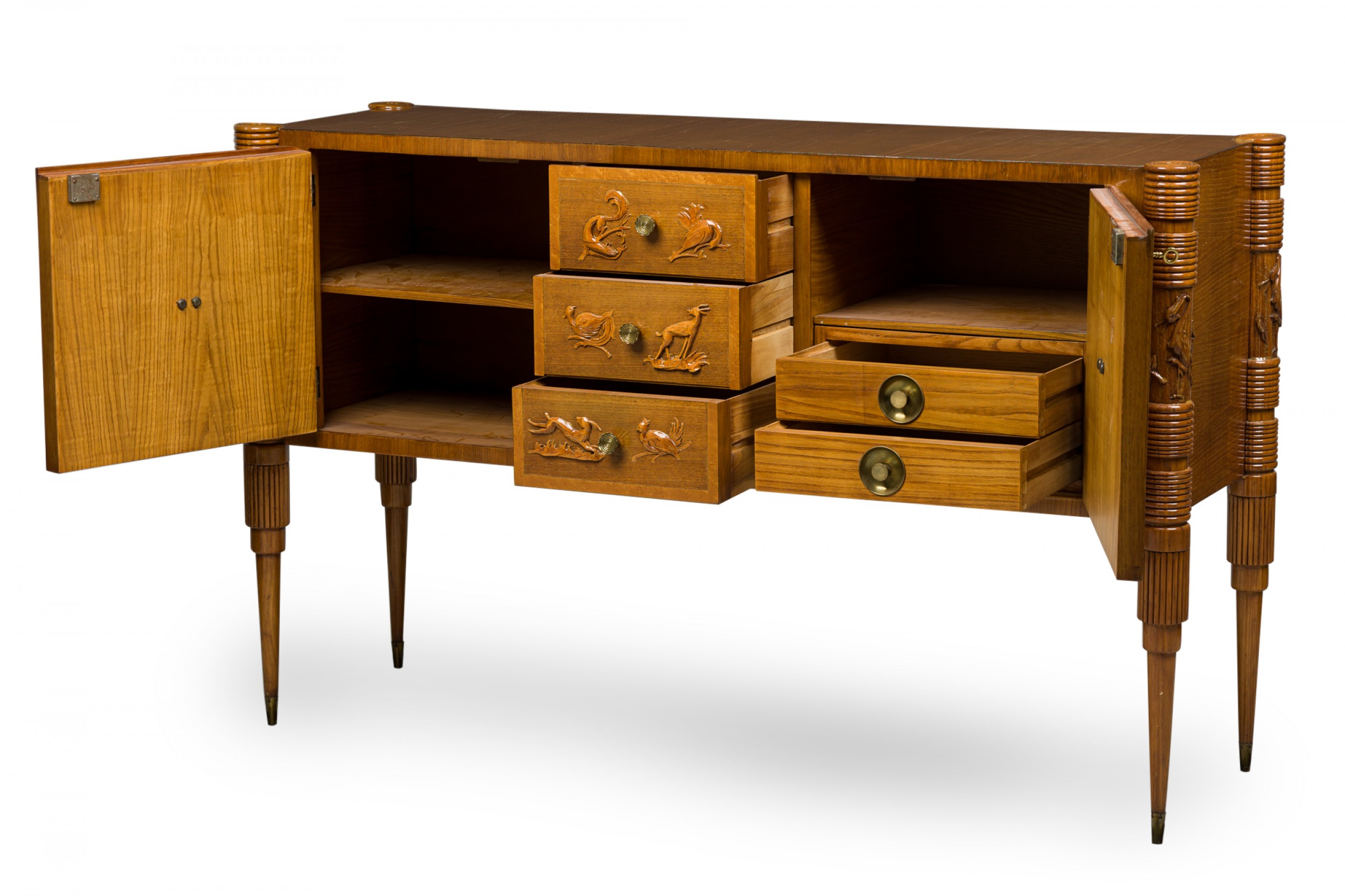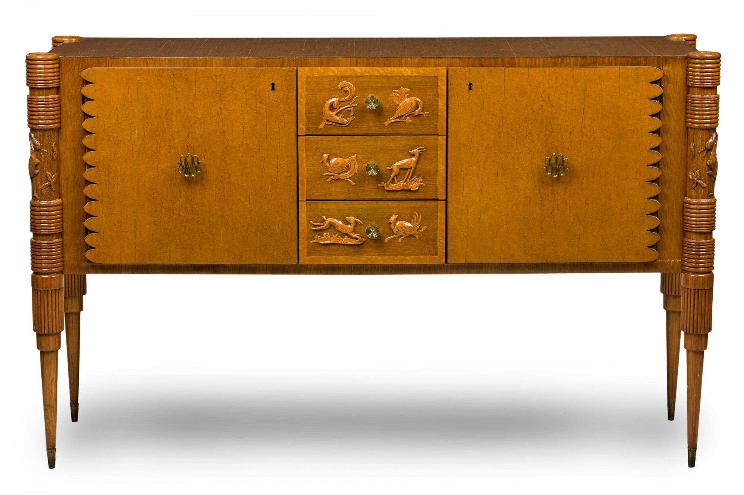 Italian Mid-Century (1950s) sideboard with a burled birch veneer, having two exterior cabinet doors with ribbon design brass door pulls and a scalloped carved edge, centering three drawers with carved bird decorations on the fronts with small brass knob drawer pulls, resting on four reeded and carved tapering legs ending in brass sabots.(PIER LUIGI COLLI)