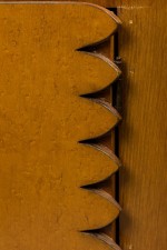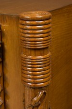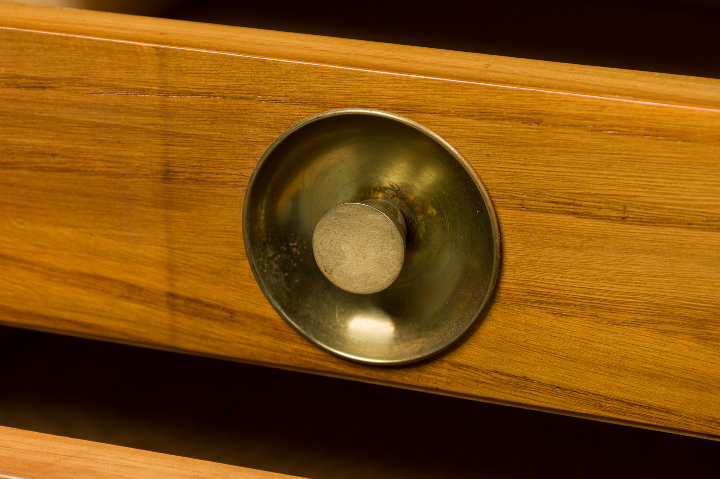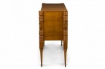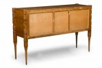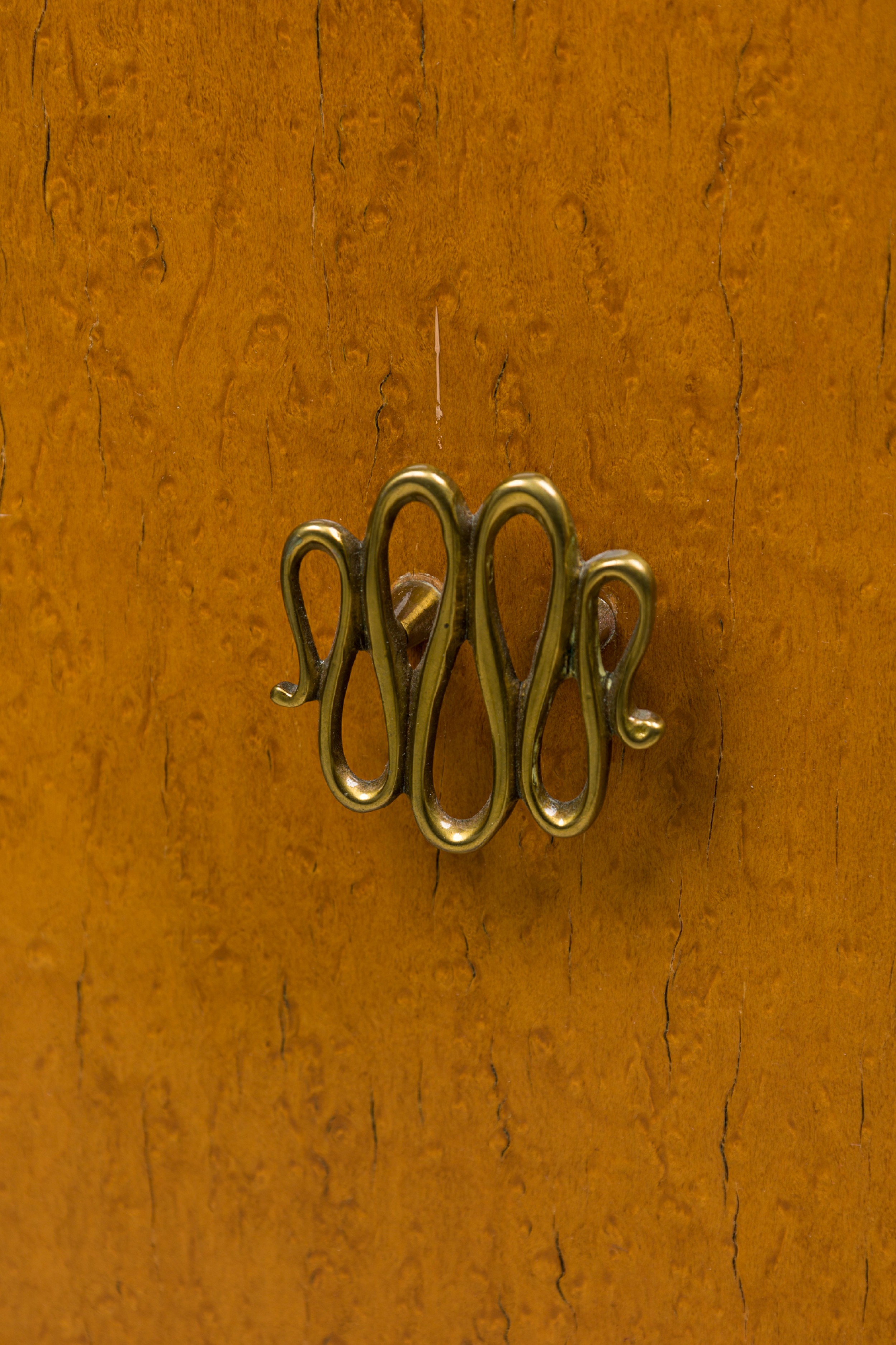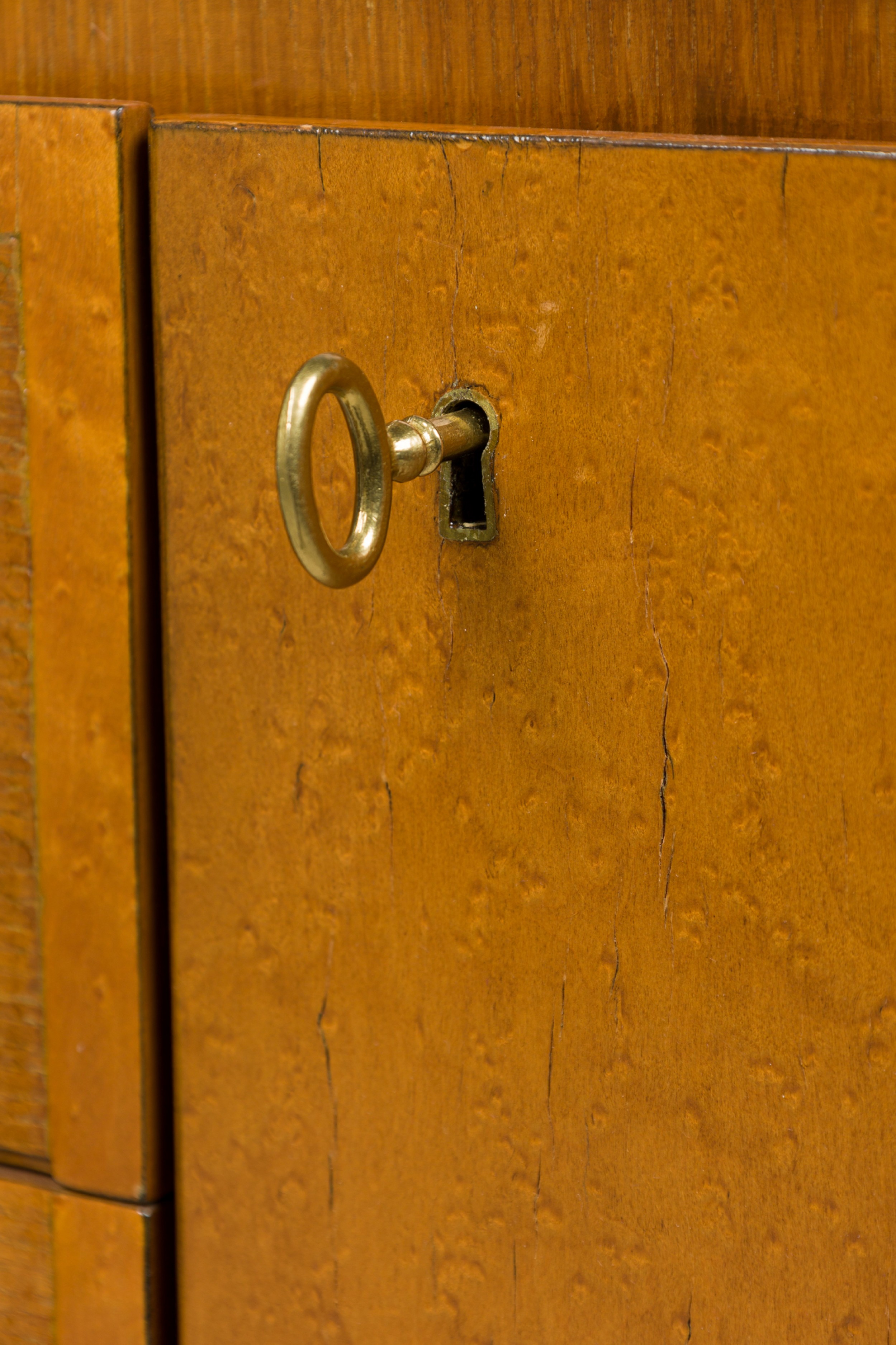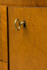 Style: Mid-Century Materials & Techniques: Birch, brass, burl, carved, metal, veneer, wood Category: Dining Room Condition: Some wear to finish, slight losses, missing keys. Good; Wear consistent with age and use