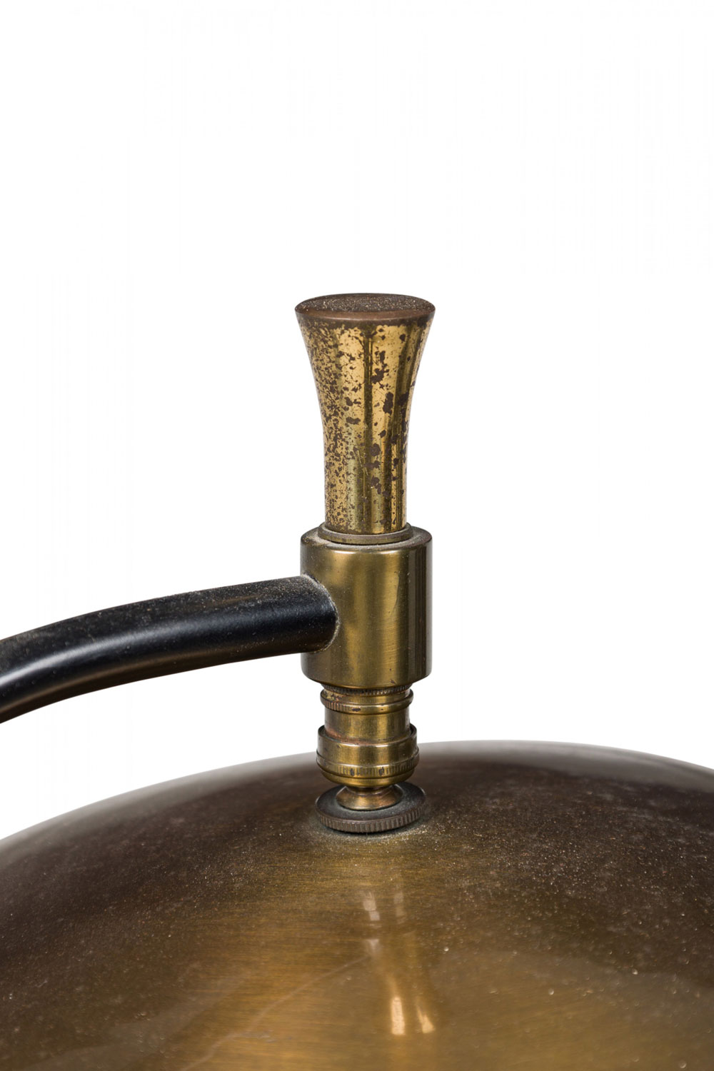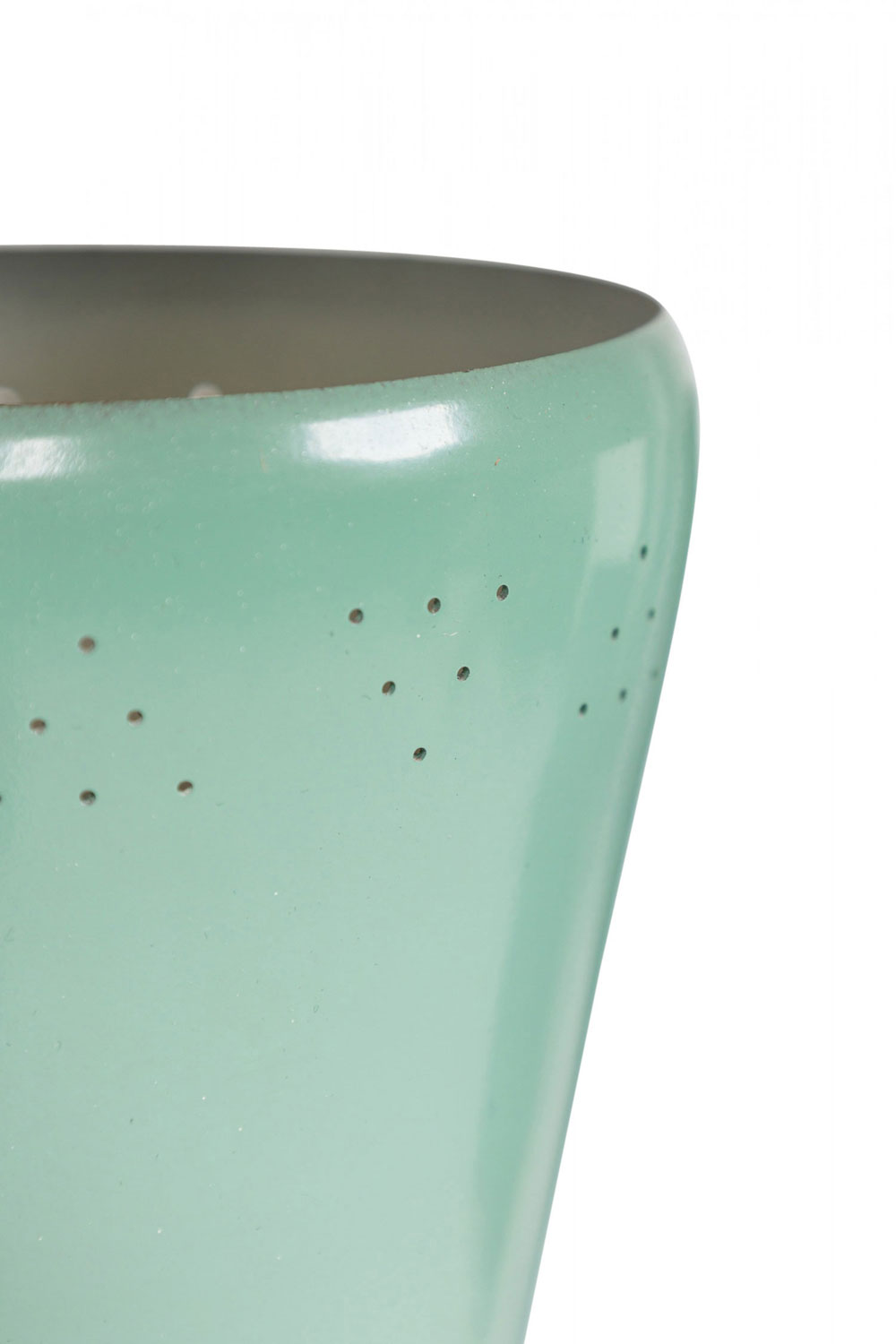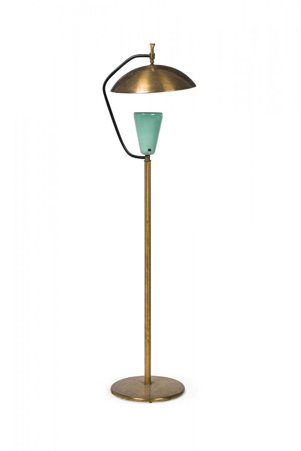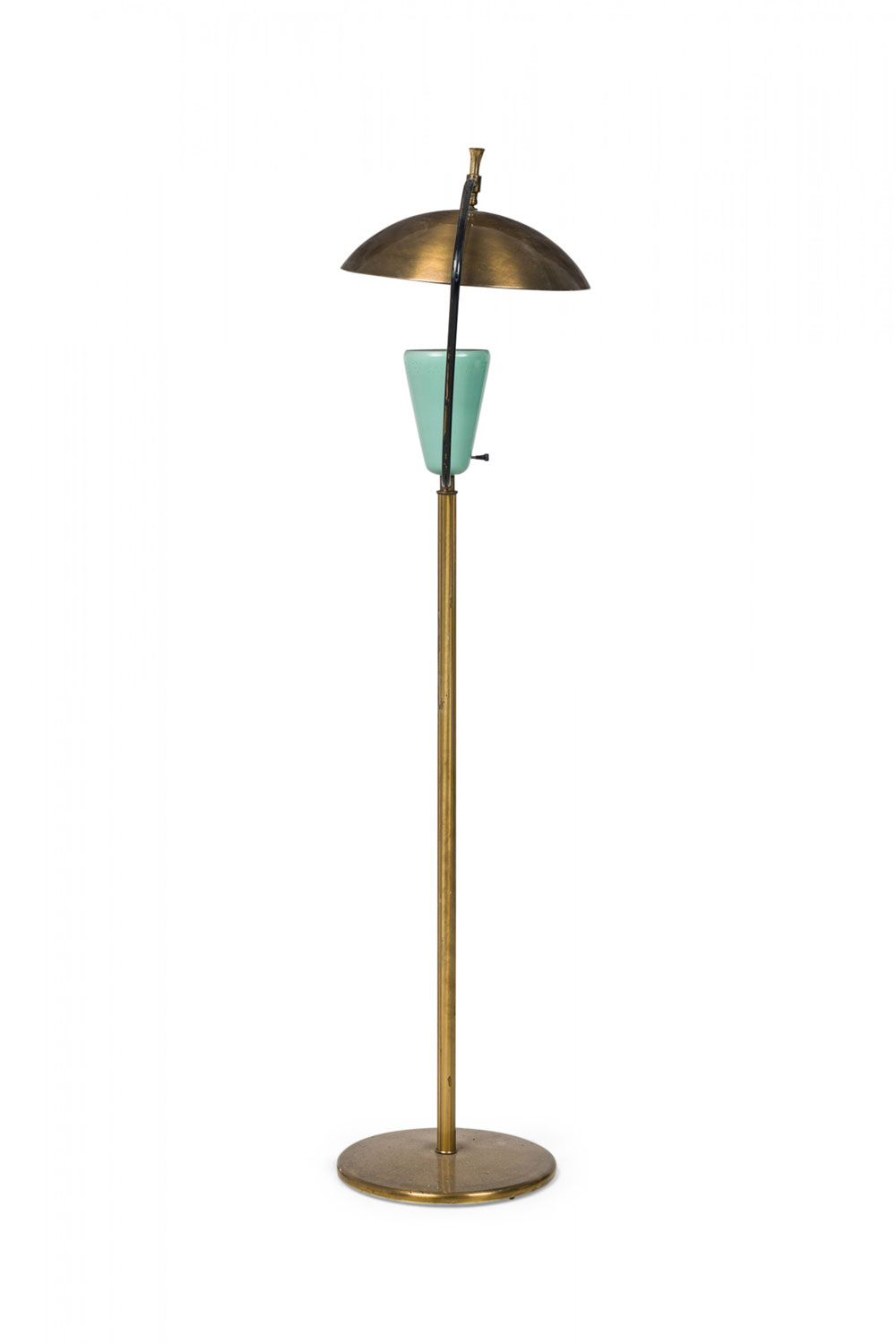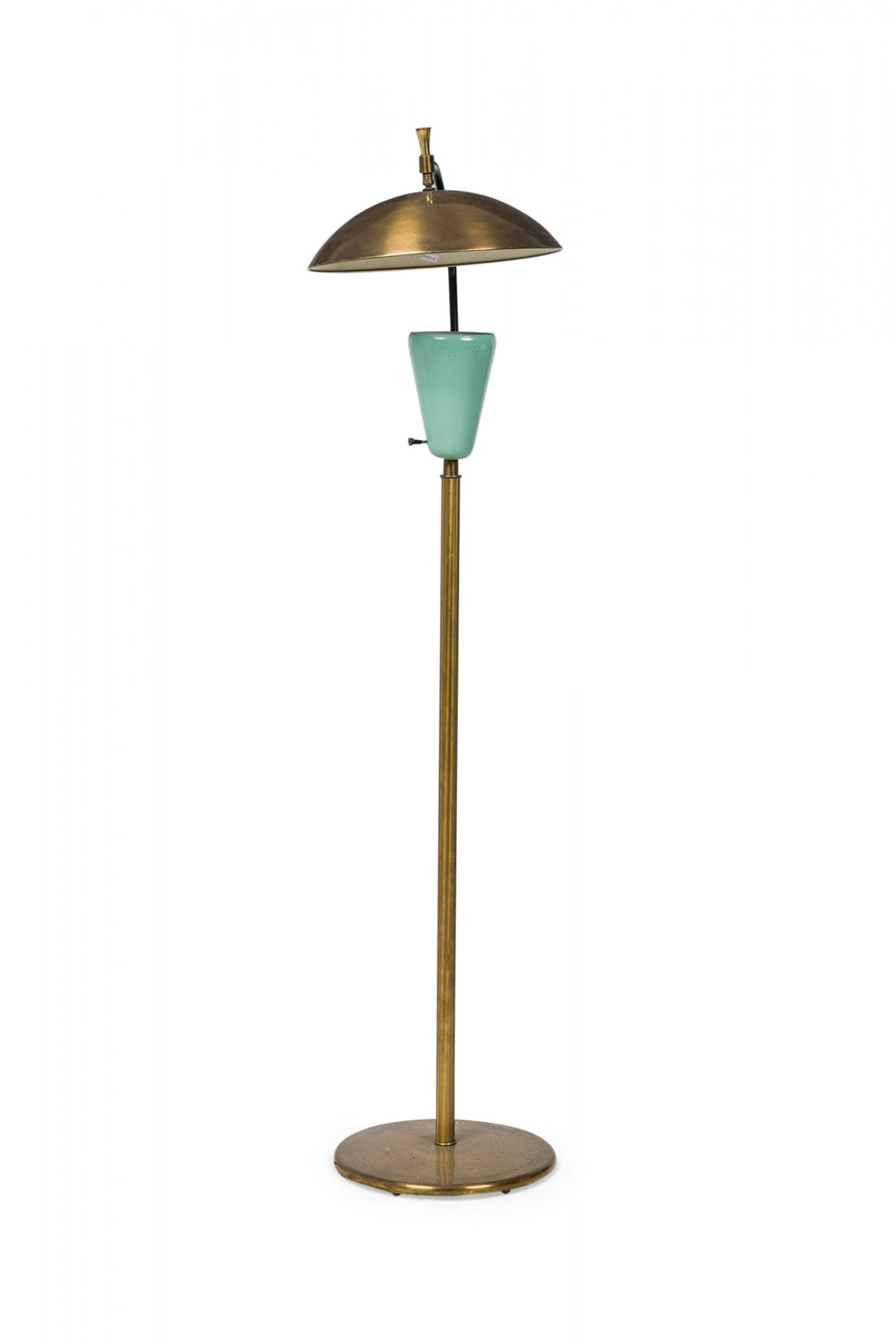 Mid-Century French (1950s) brass floor lamp with a torchere fixture encased in a conical mint green enameled metal shade, and topped with a hanging brass dome. (PIERRE GUARICHE).