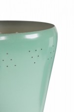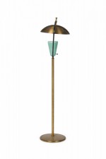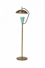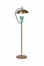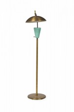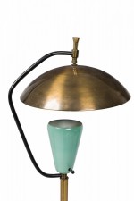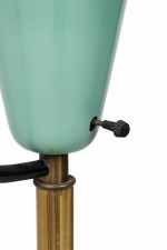 Mid-Century French (1950s) brass floor lamp with a torchere fixture encased in a conical mint green enameled metal shade, and topped with a hanging brass dome. (PIERRE GUARICHE)