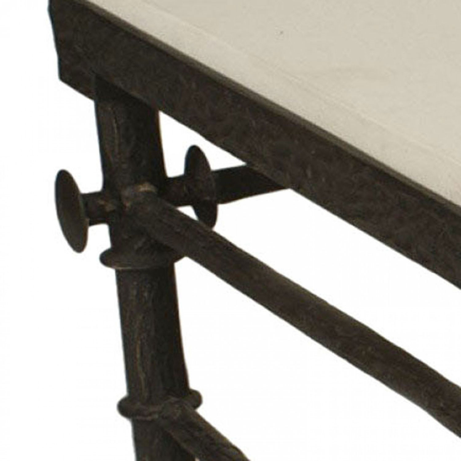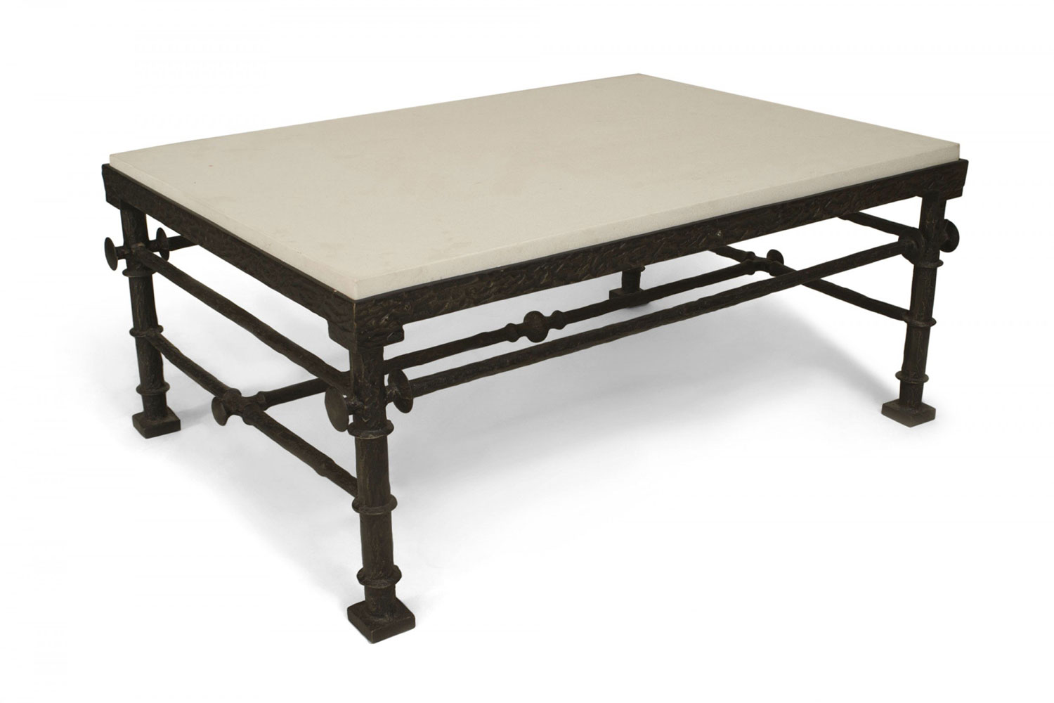 French Modern Grecian-style textured dark patinated bronze coffee table with double stretcher sides and a limestone top. (manner of ALBERTO GIACOMETTI).