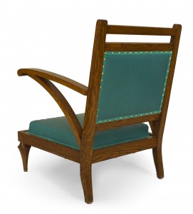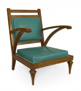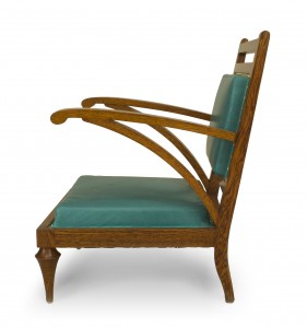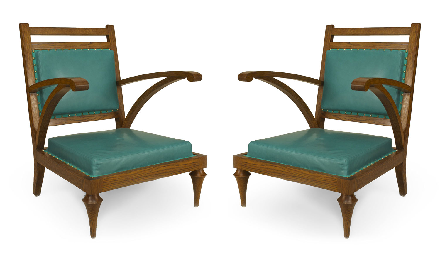 PAIR of Post-War (modern) oak slipper form Armchairs with turquoise leather upholstered seat and back.